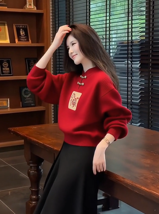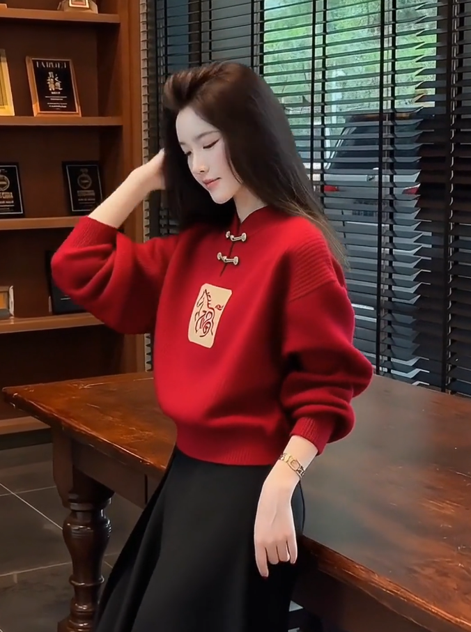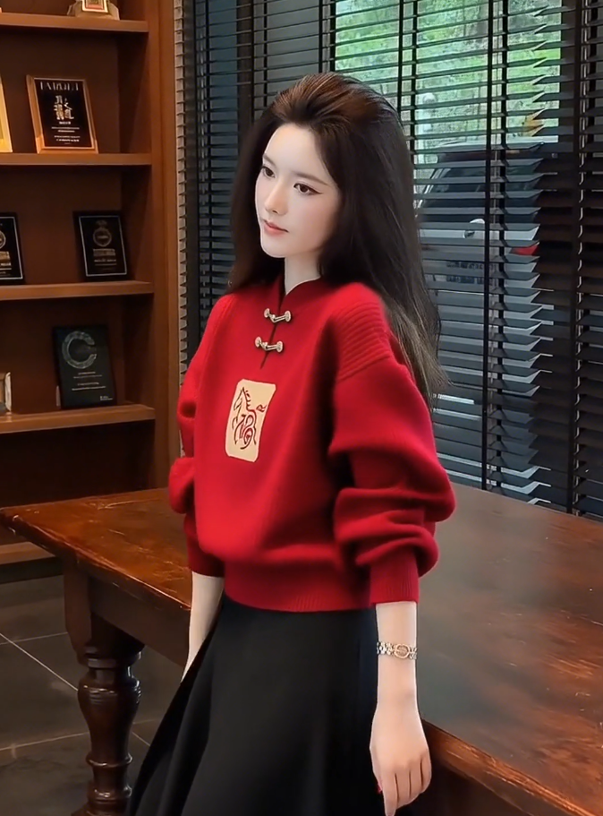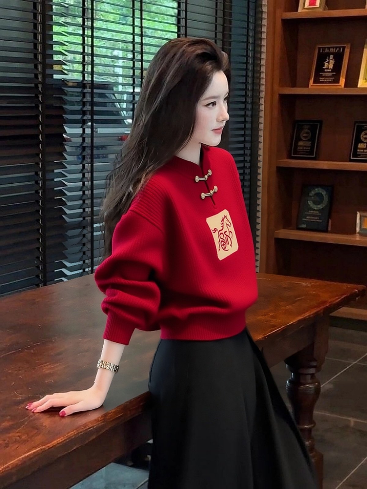 新中式国风盘扣白马红色针织毛衣女款2025新款冬季本命年马年衣服