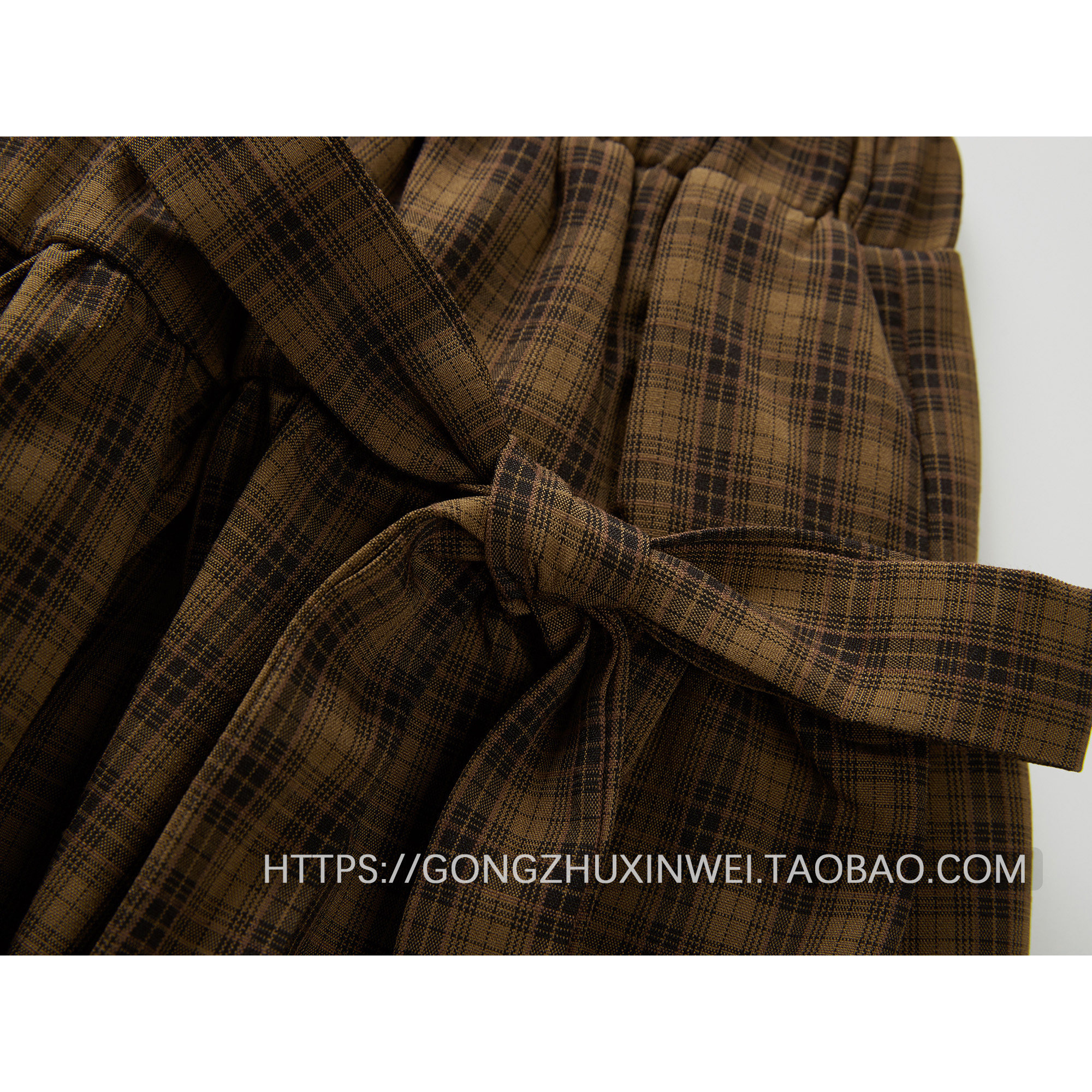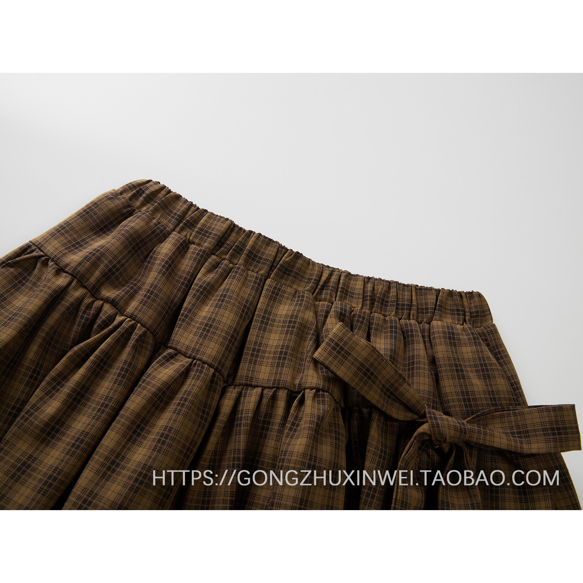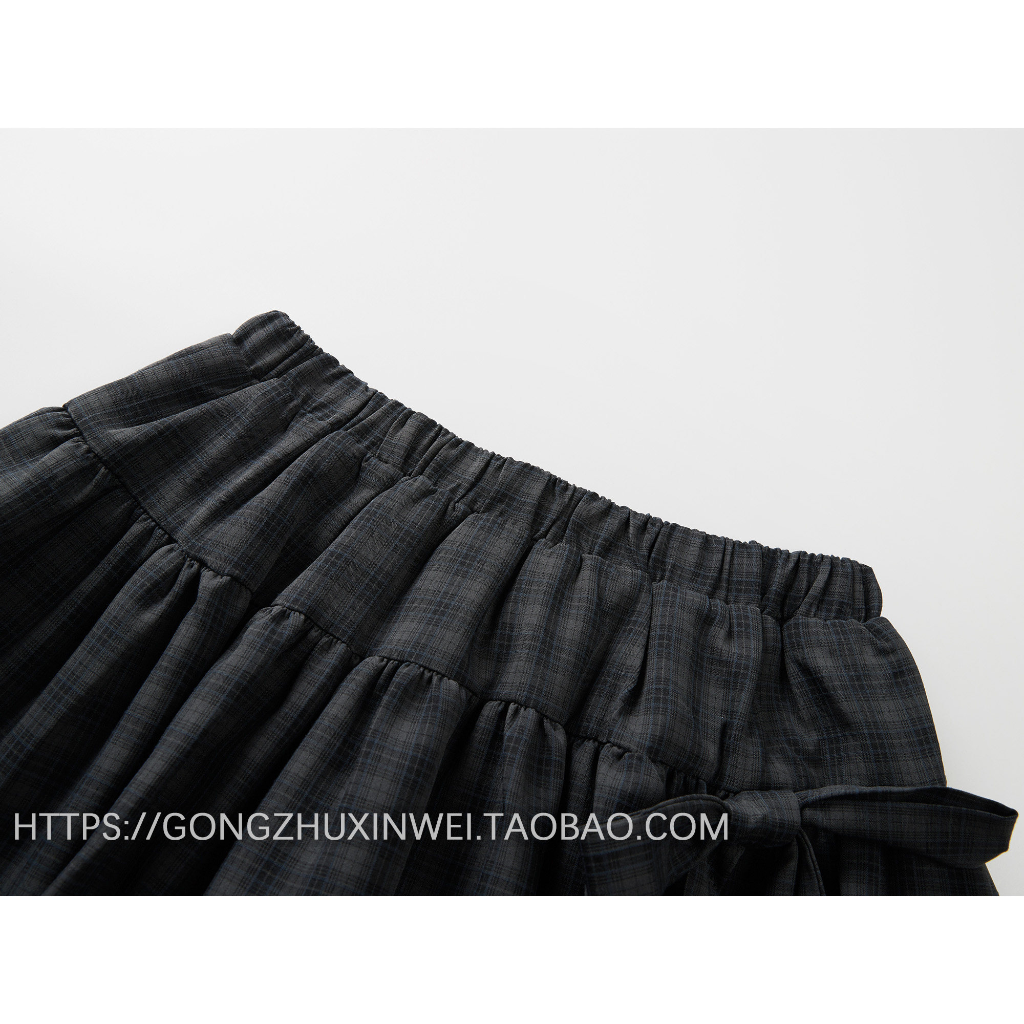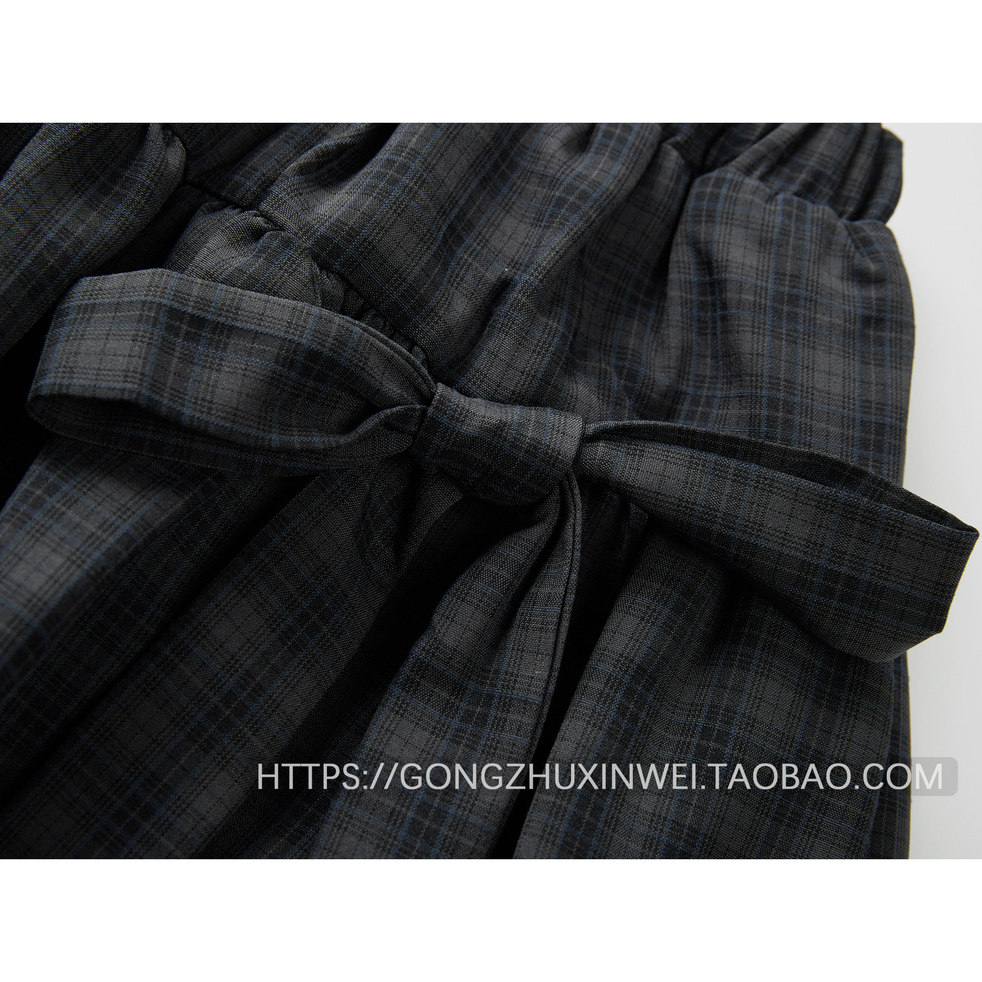 秋裝新款韓系高腰A字顯瘦松緊腰格子裙女蝴蝶結花苞裙半身短裙