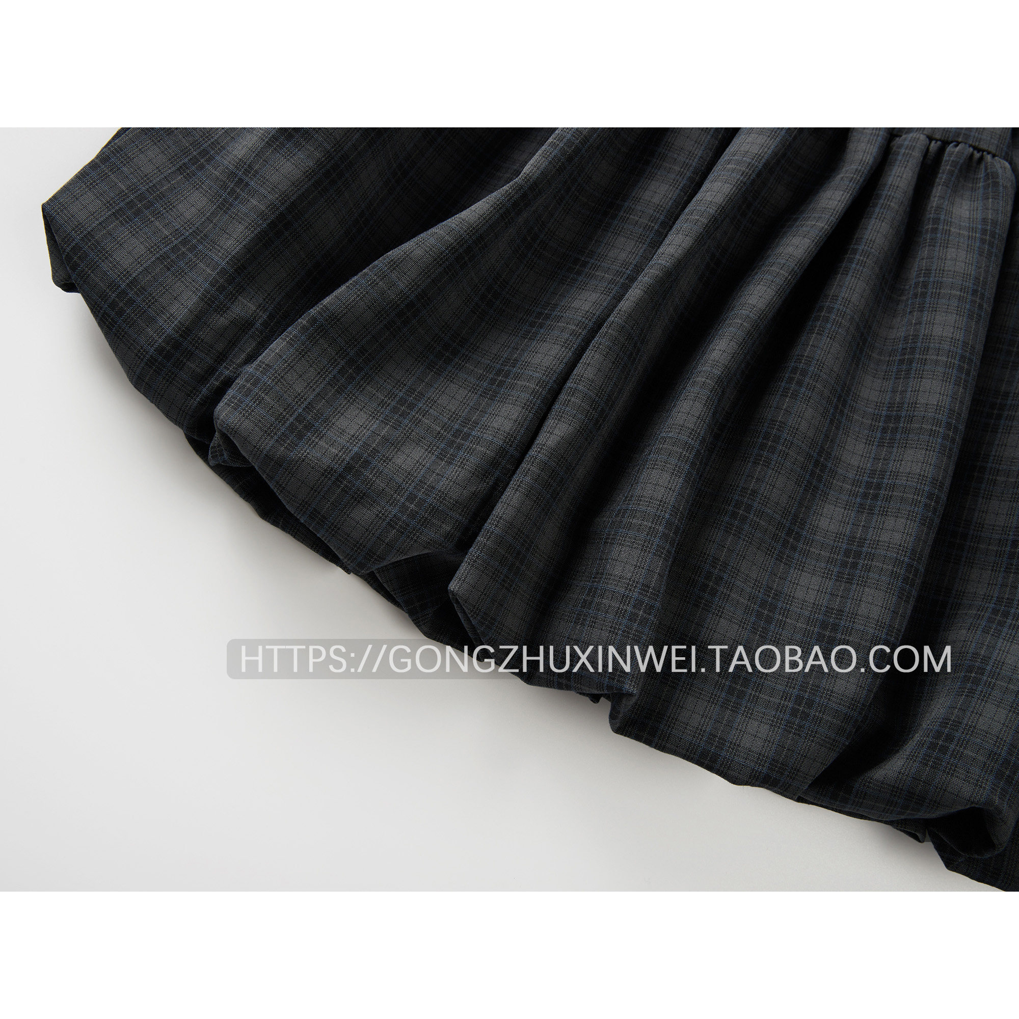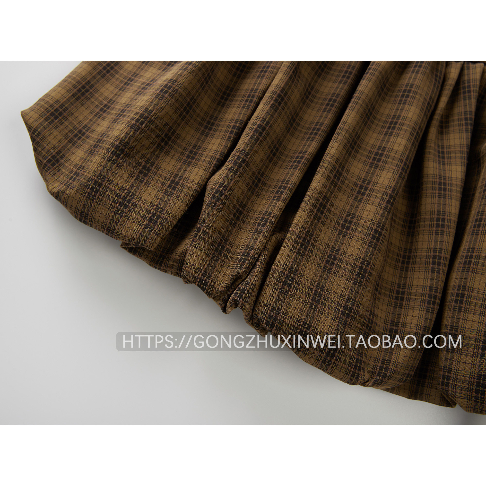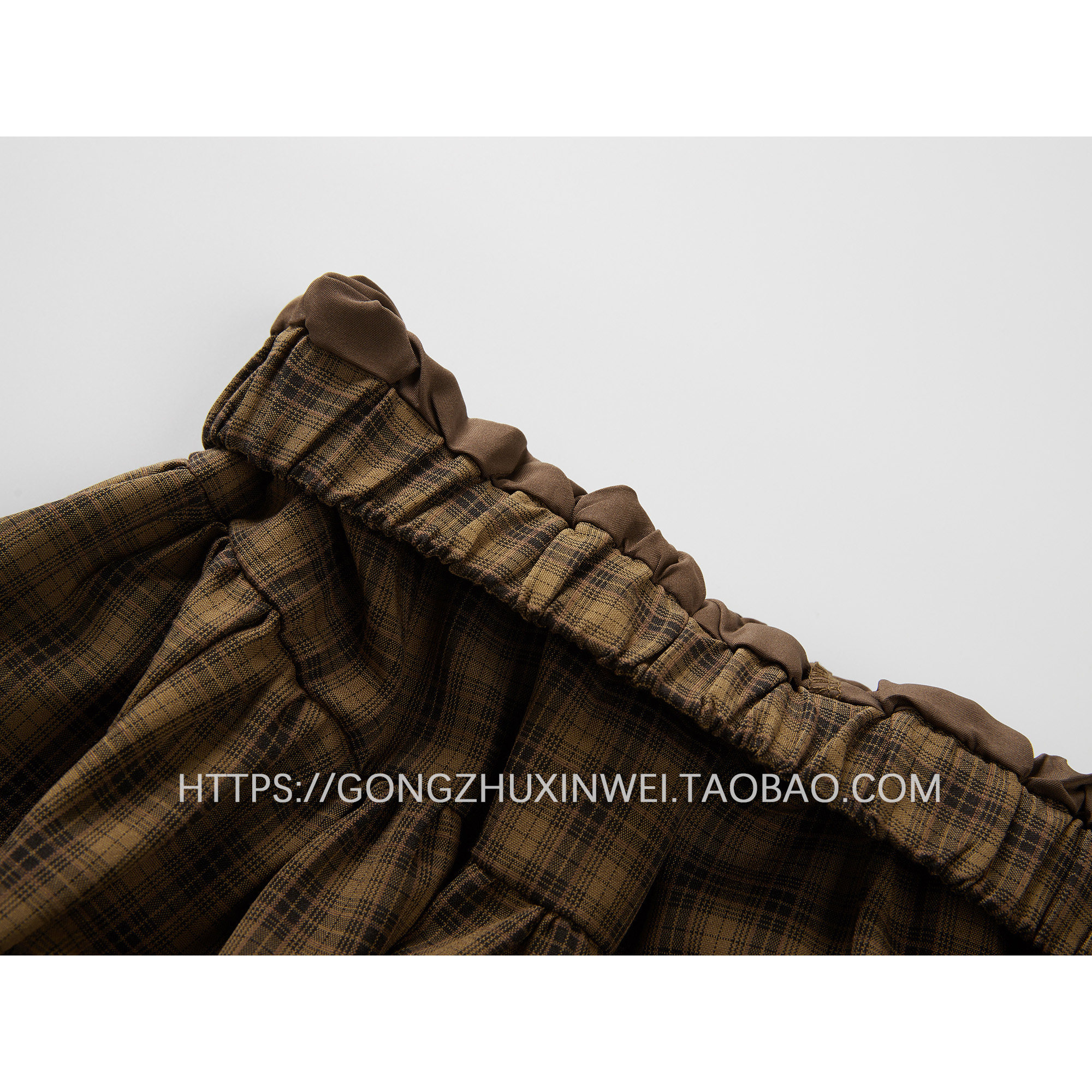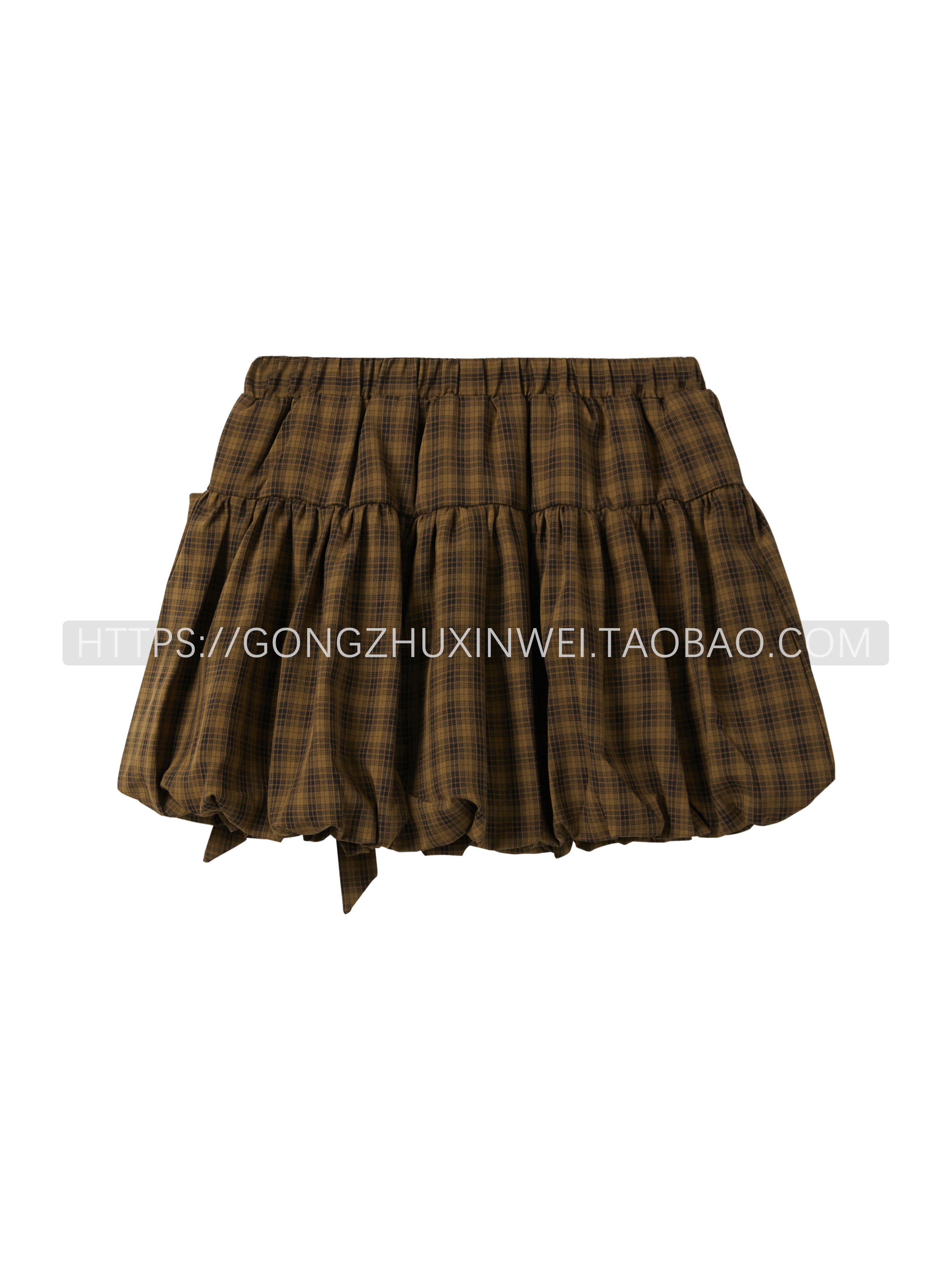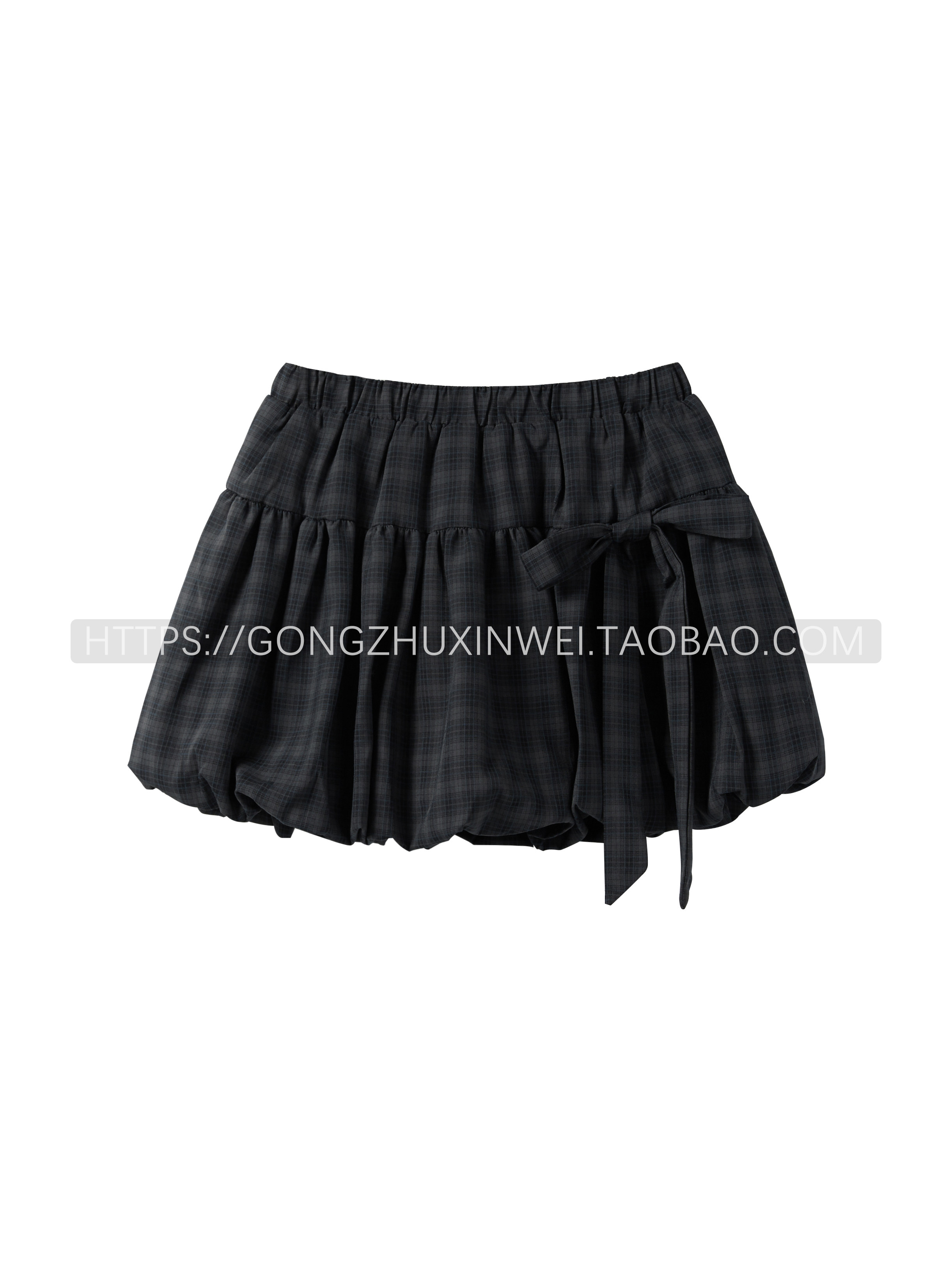 秋裝新款韓系高腰A字顯瘦松緊腰格子裙女蝴蝶結花苞裙半身短裙