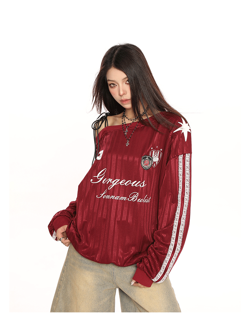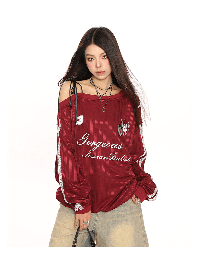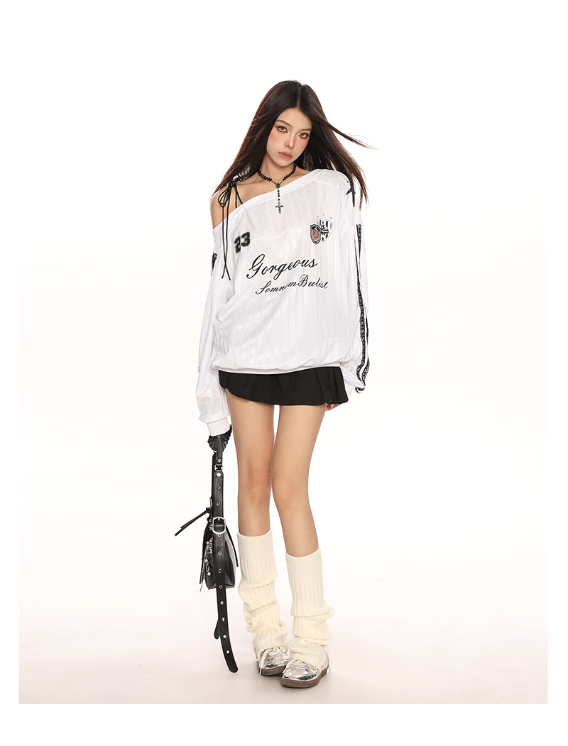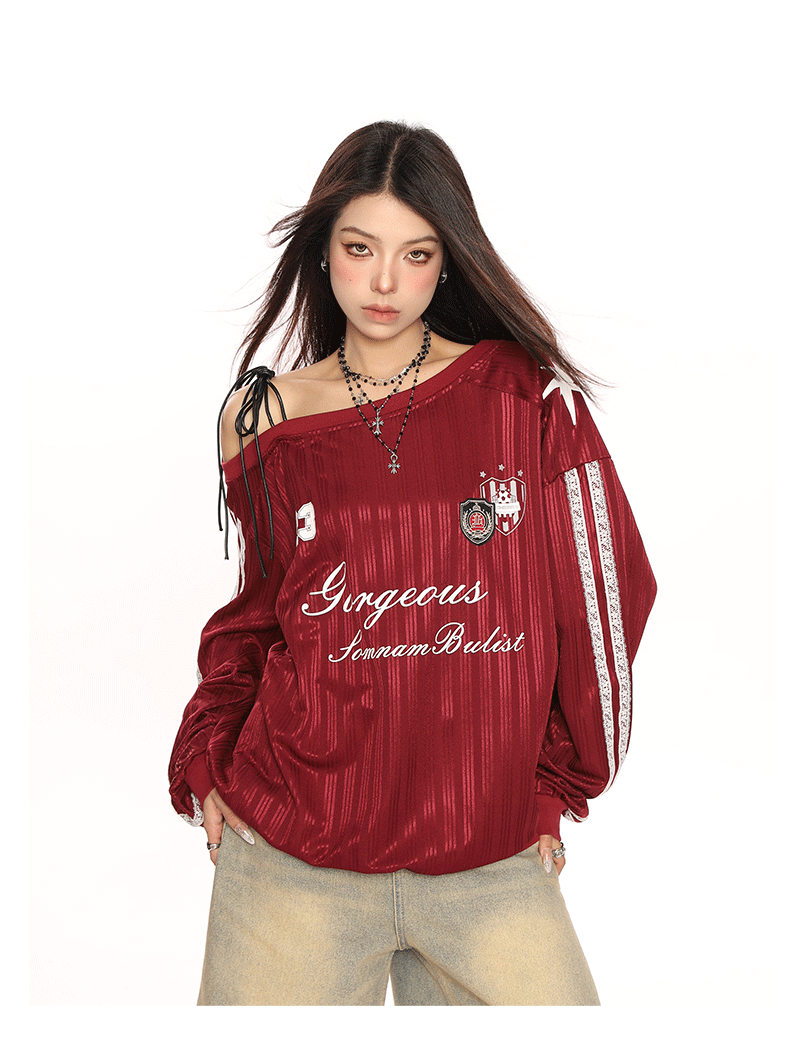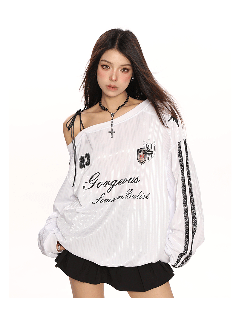 美式斜肩綁帶長袖衛衣女春季辣妹顯瘦露肩運動風球衣上衣