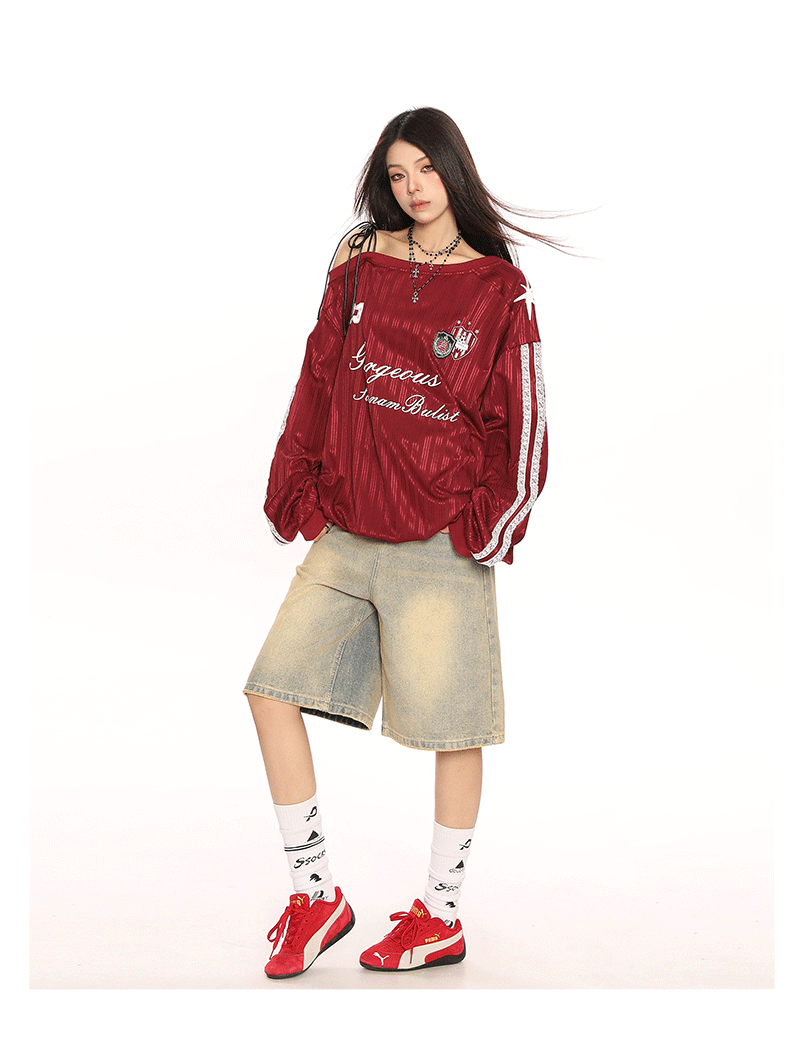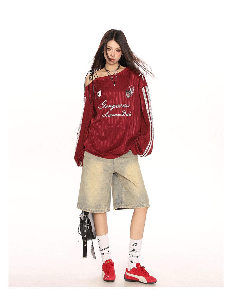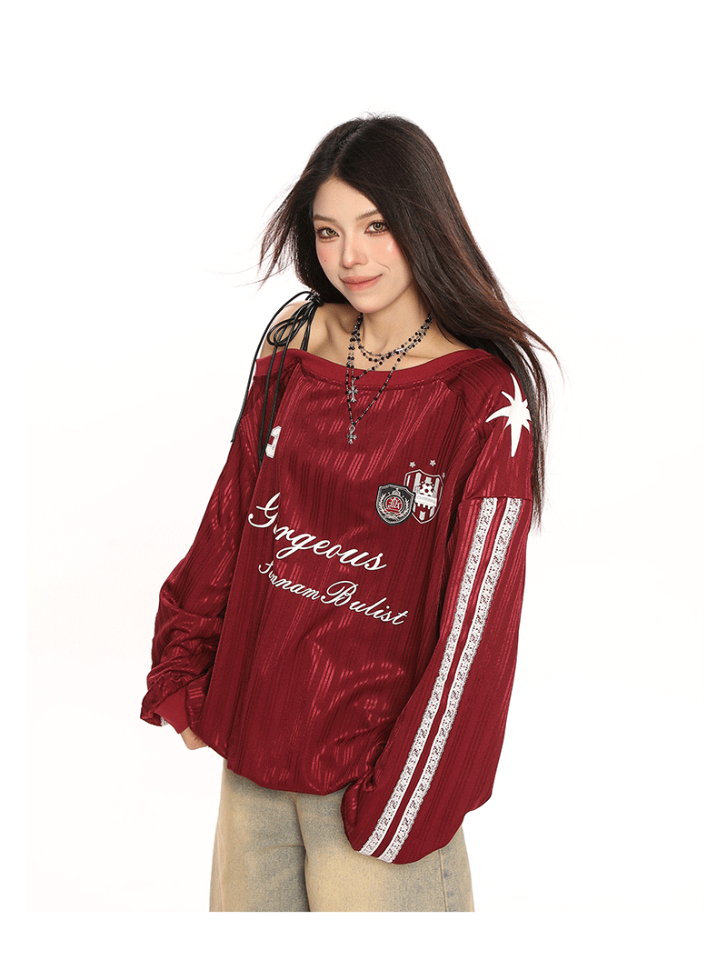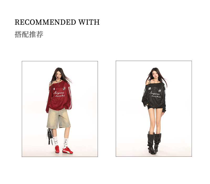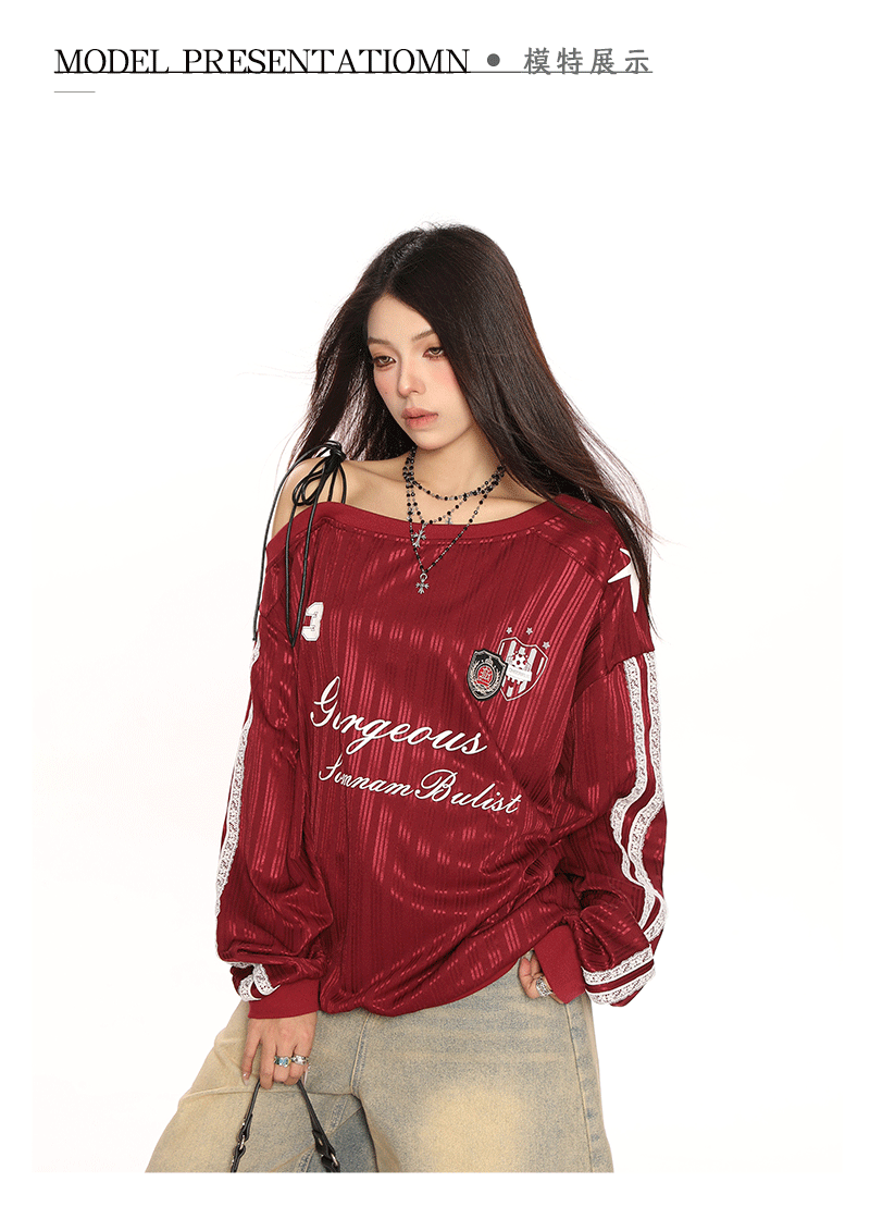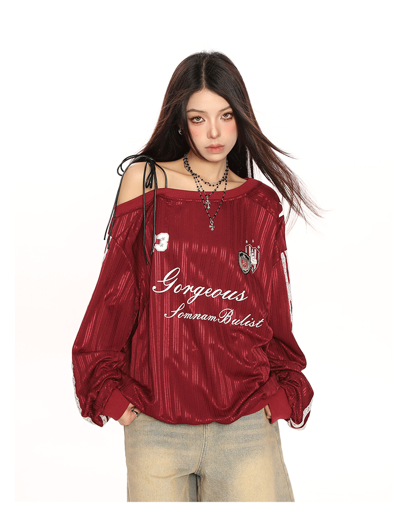 美式斜肩綁帶長袖衛衣女春季辣妹顯瘦露肩運動風球衣上衣