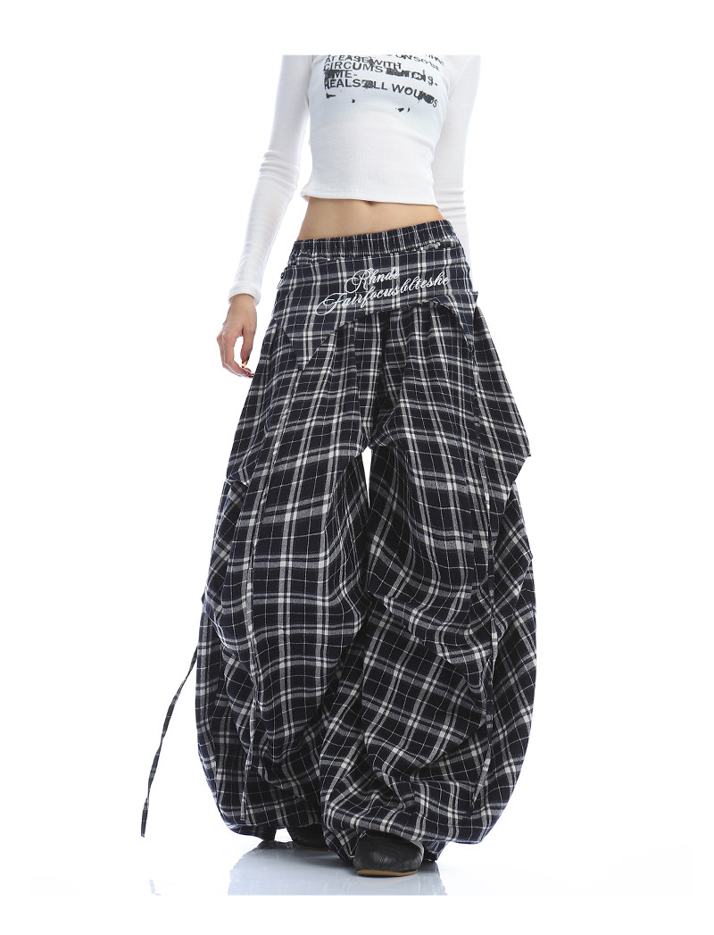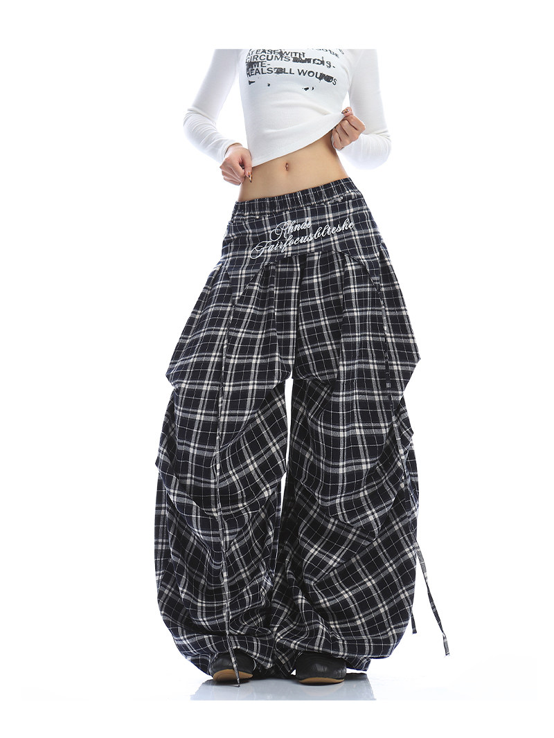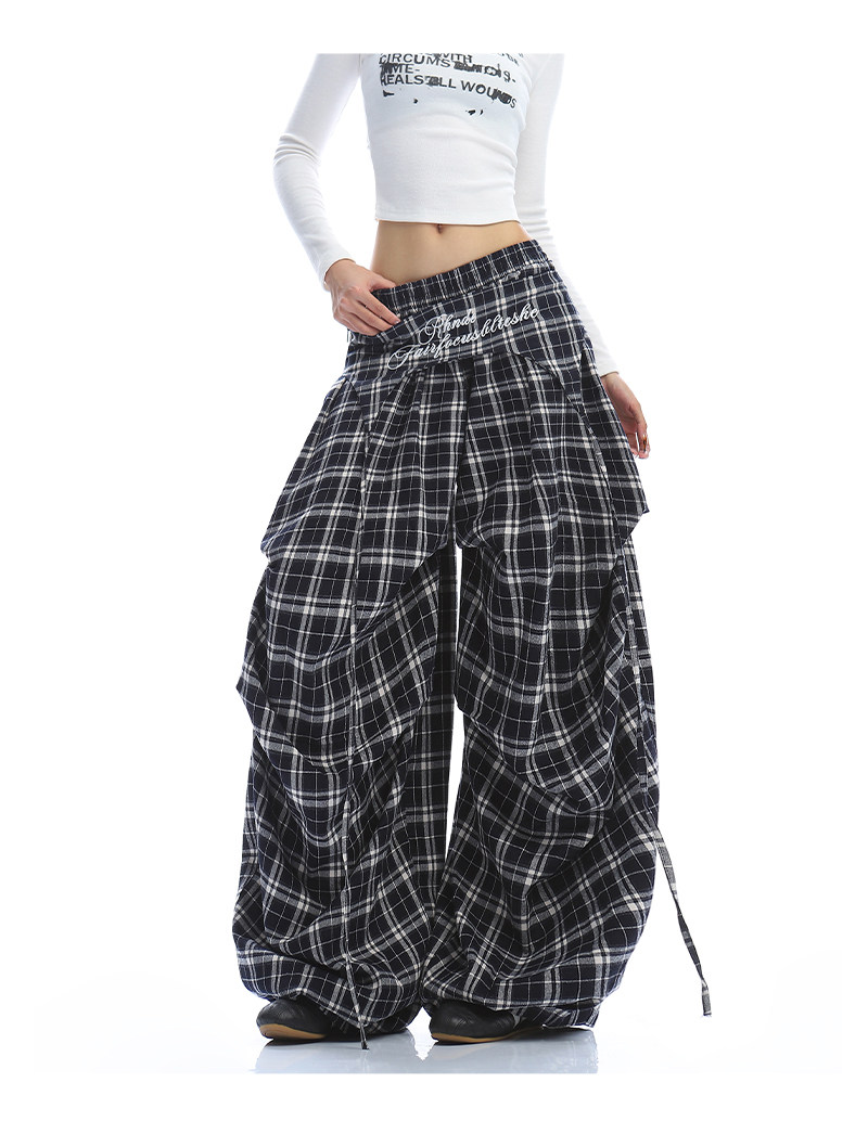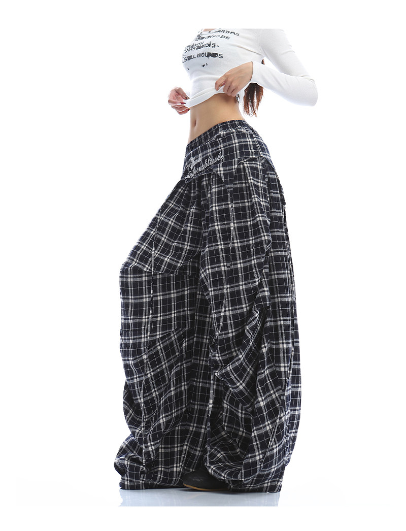 美式字母刺繡格子屁簾彎刀闊腿褲女休閑百搭闊腿拖地長褲