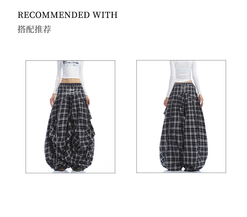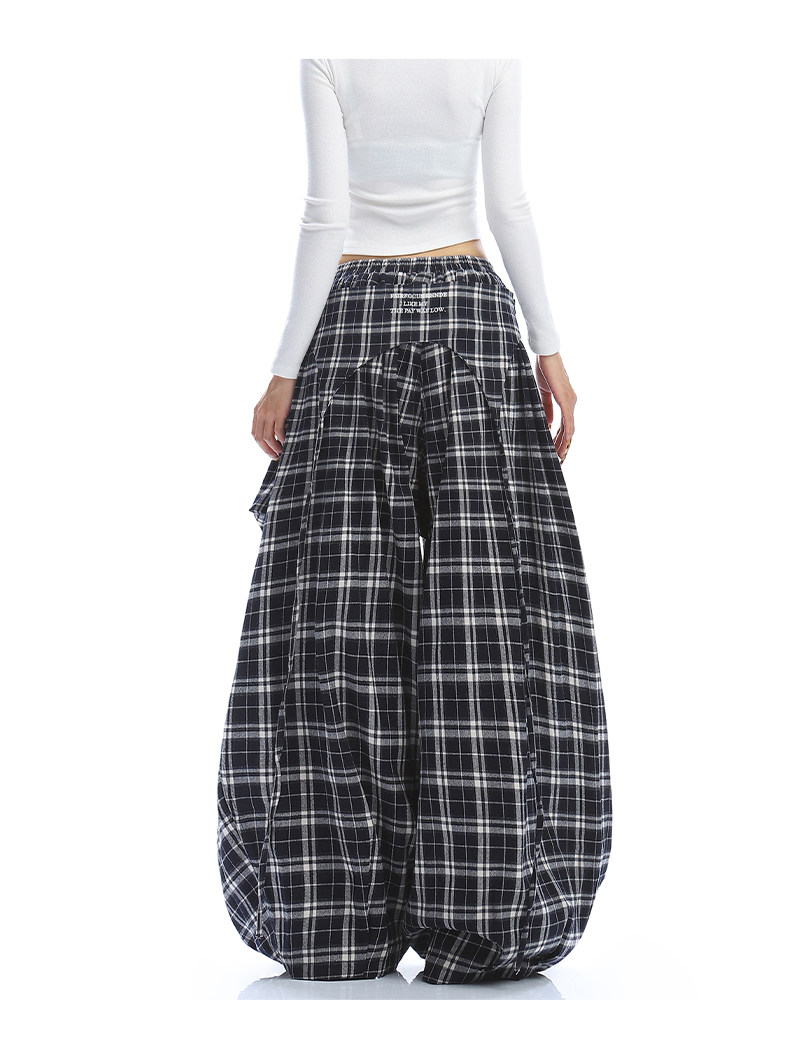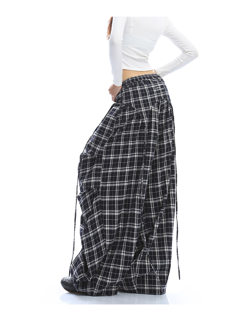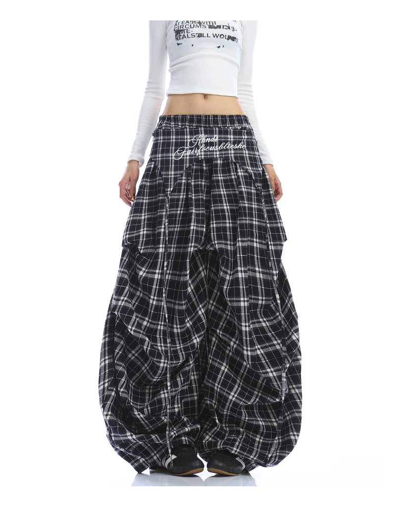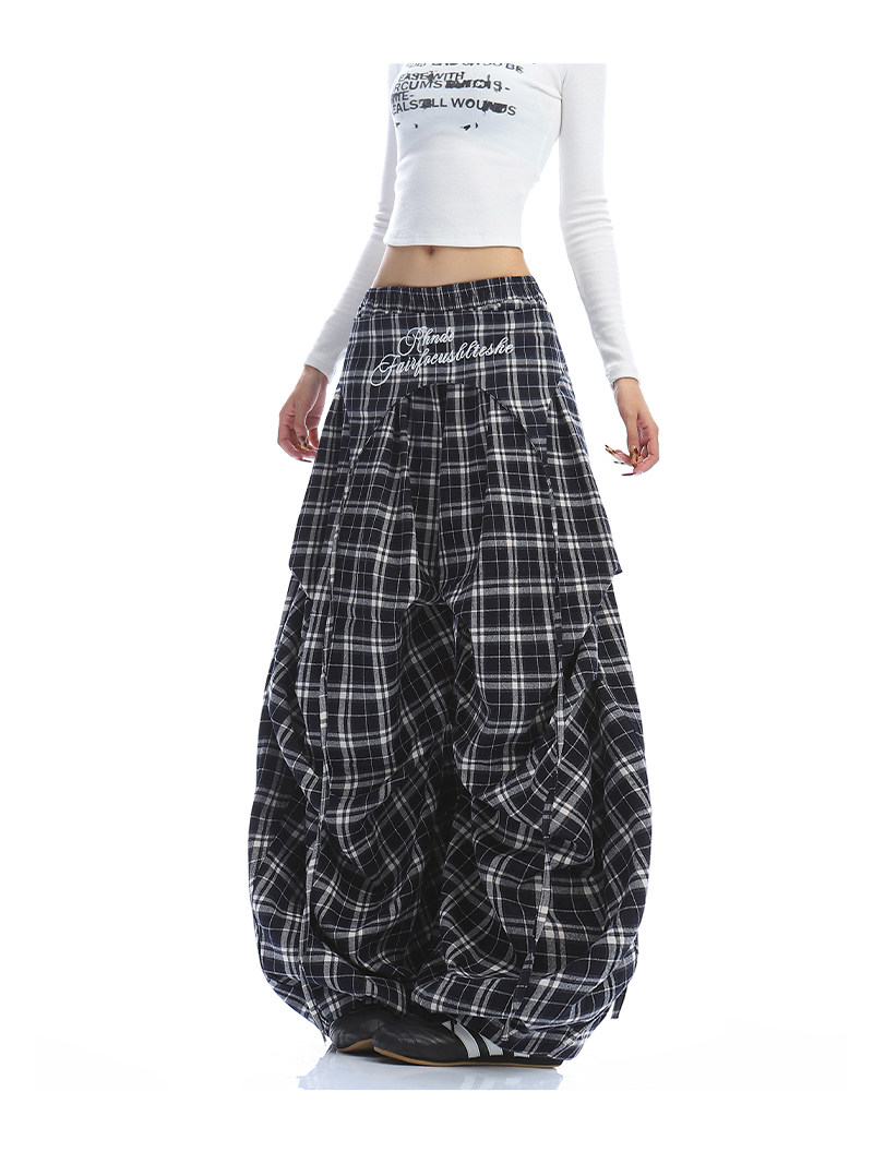 美式字母刺繡格子屁簾彎刀闊腿褲女休閑百搭闊腿拖地長褲