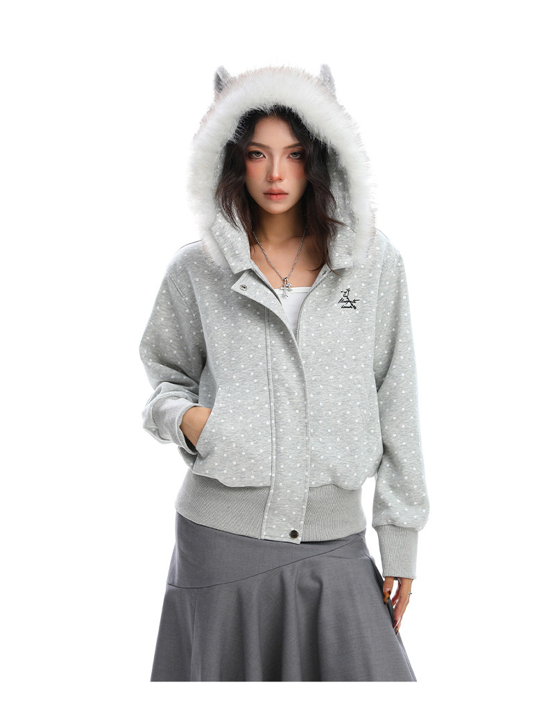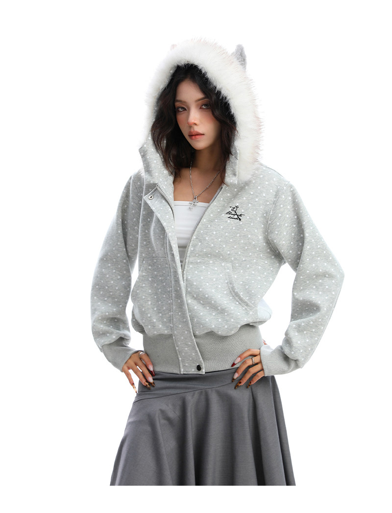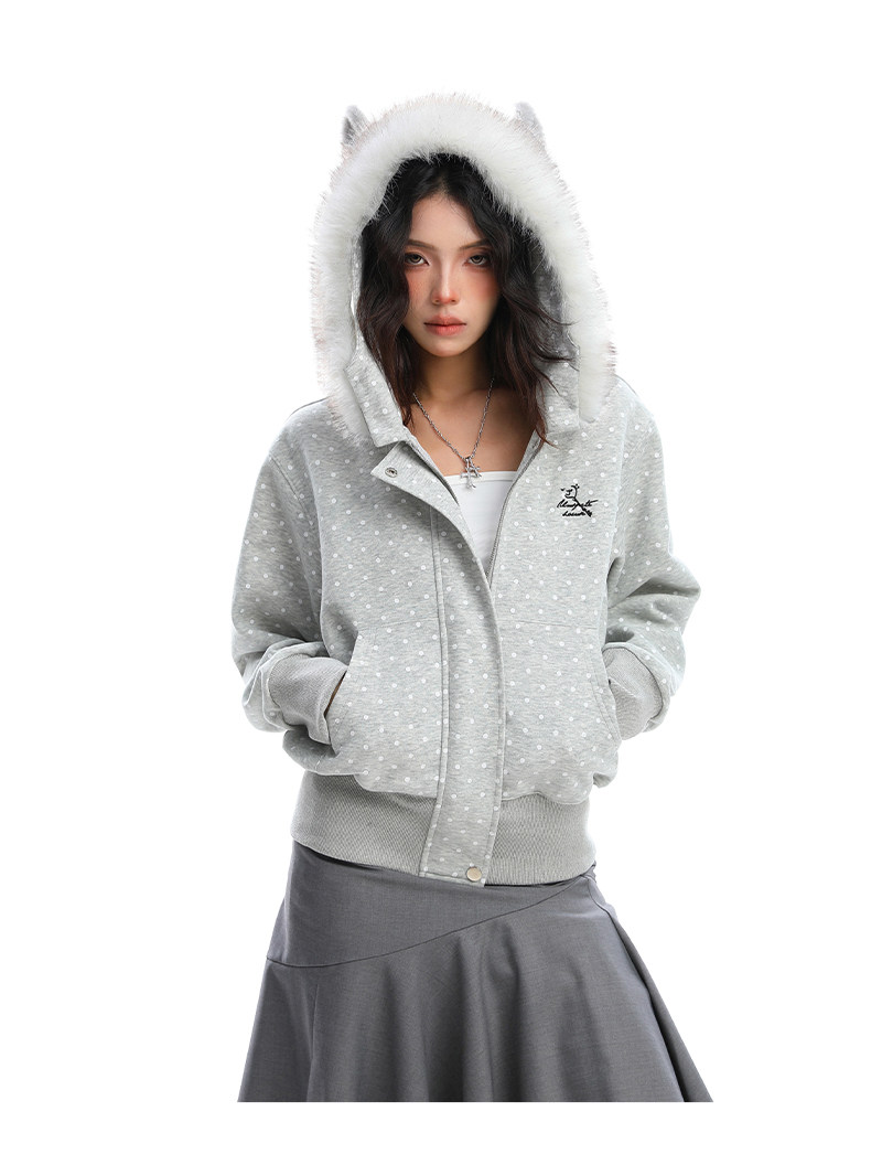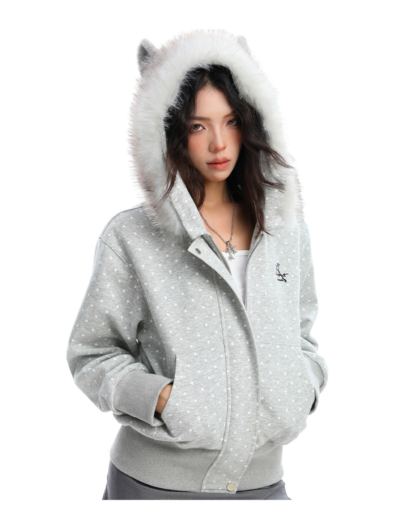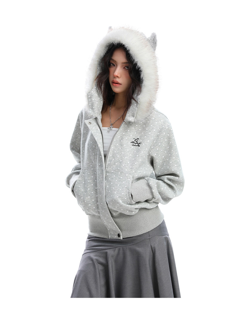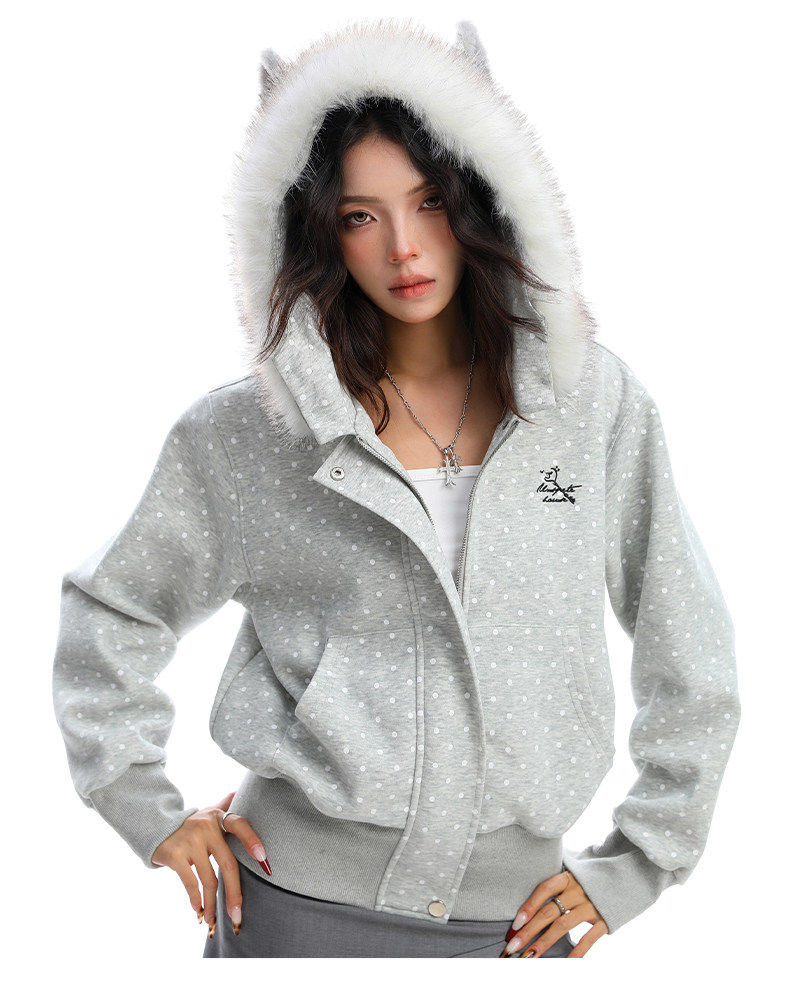 美式復古波點印花毛領貓耳朵連帽開衫衛衣女秋季休閑外套