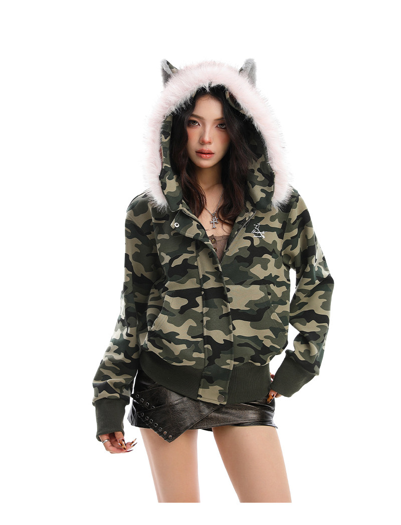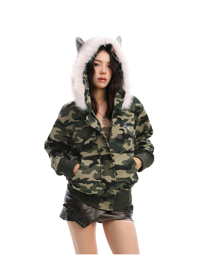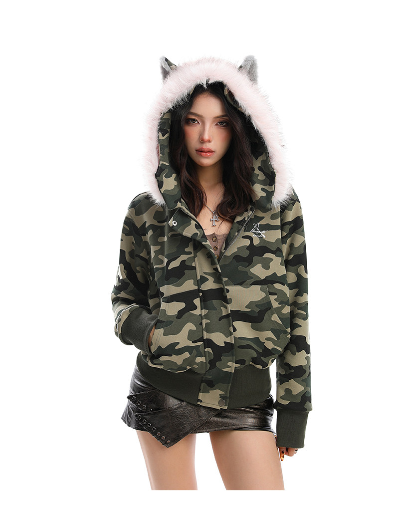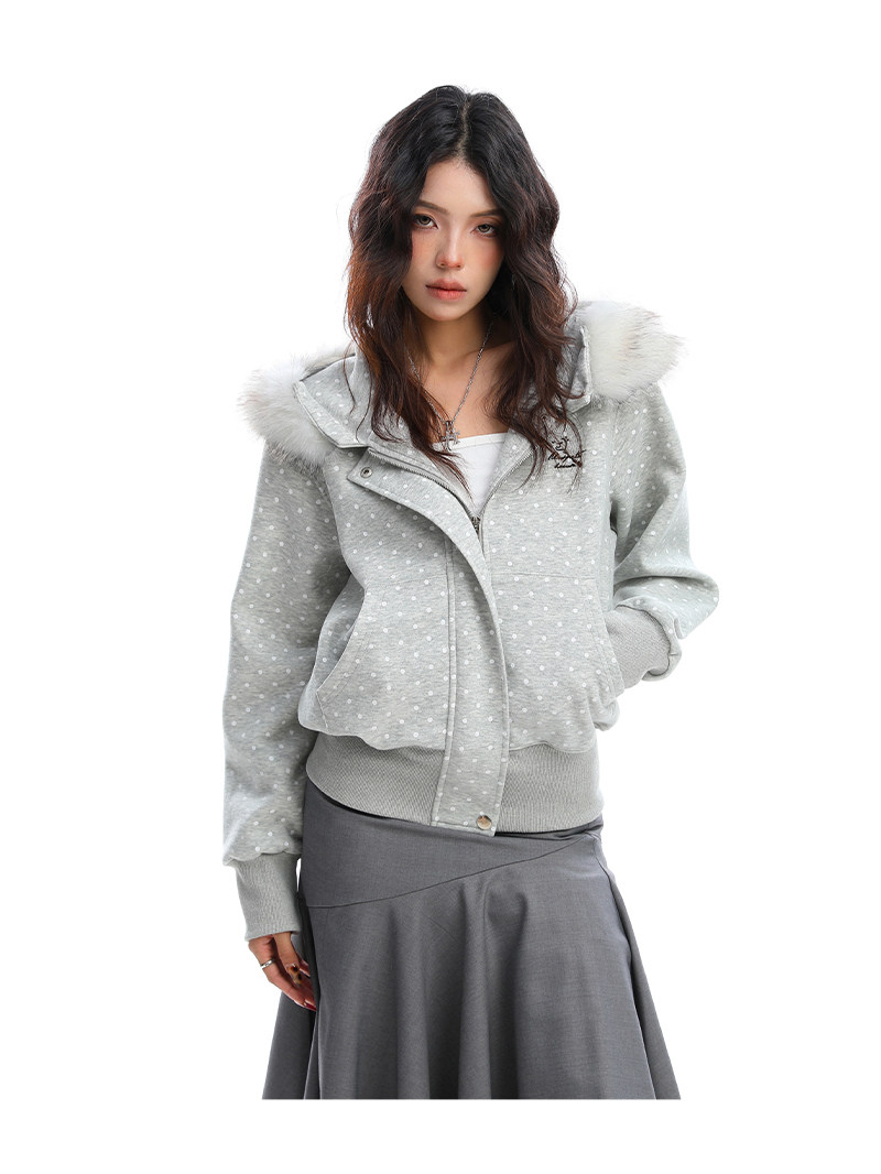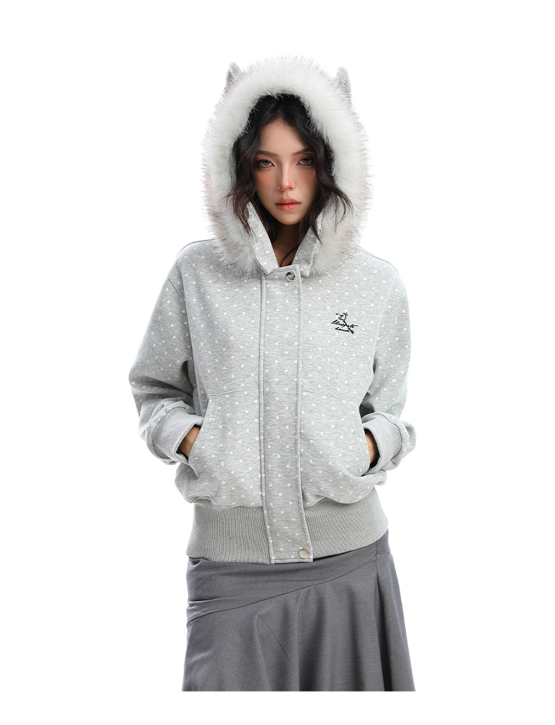 美式復古波點印花毛領貓耳朵連帽開衫衛衣女秋季休閑外套