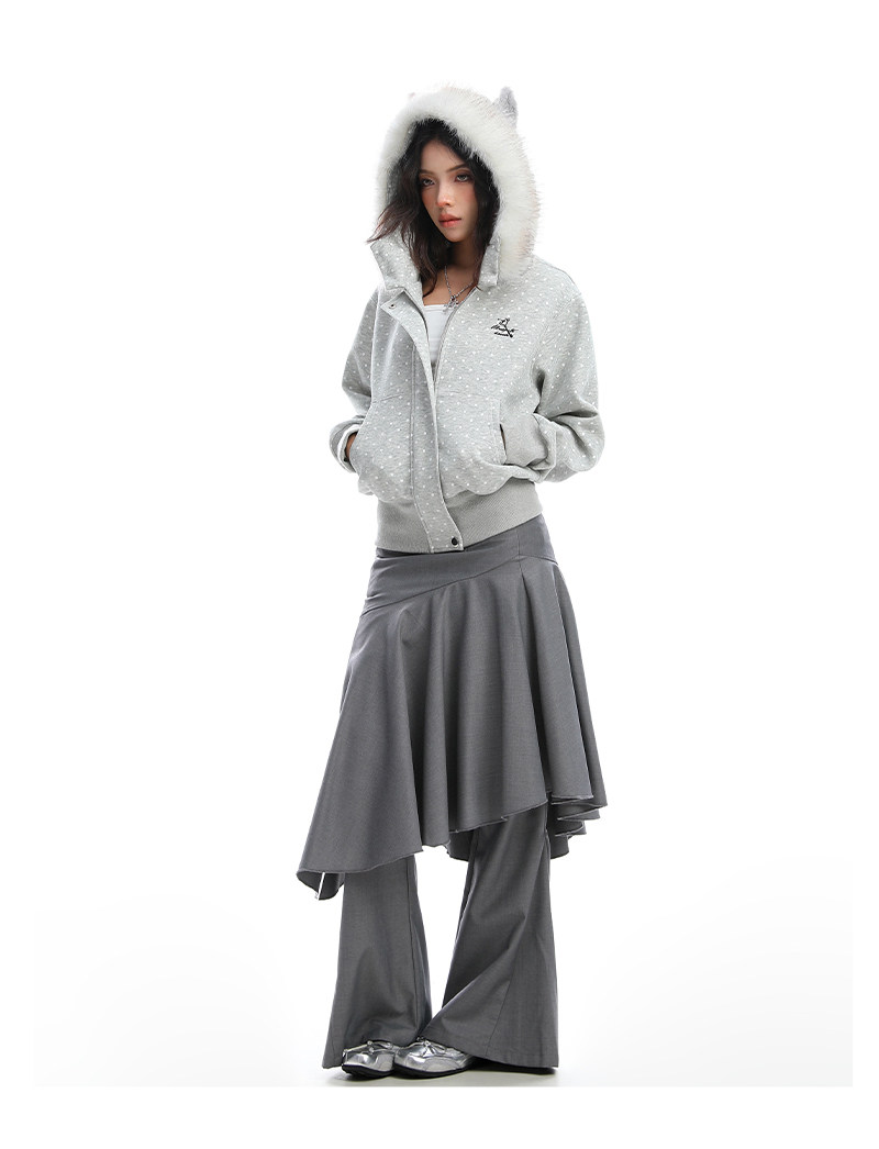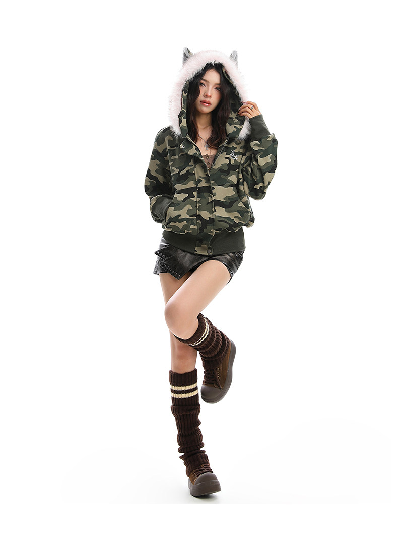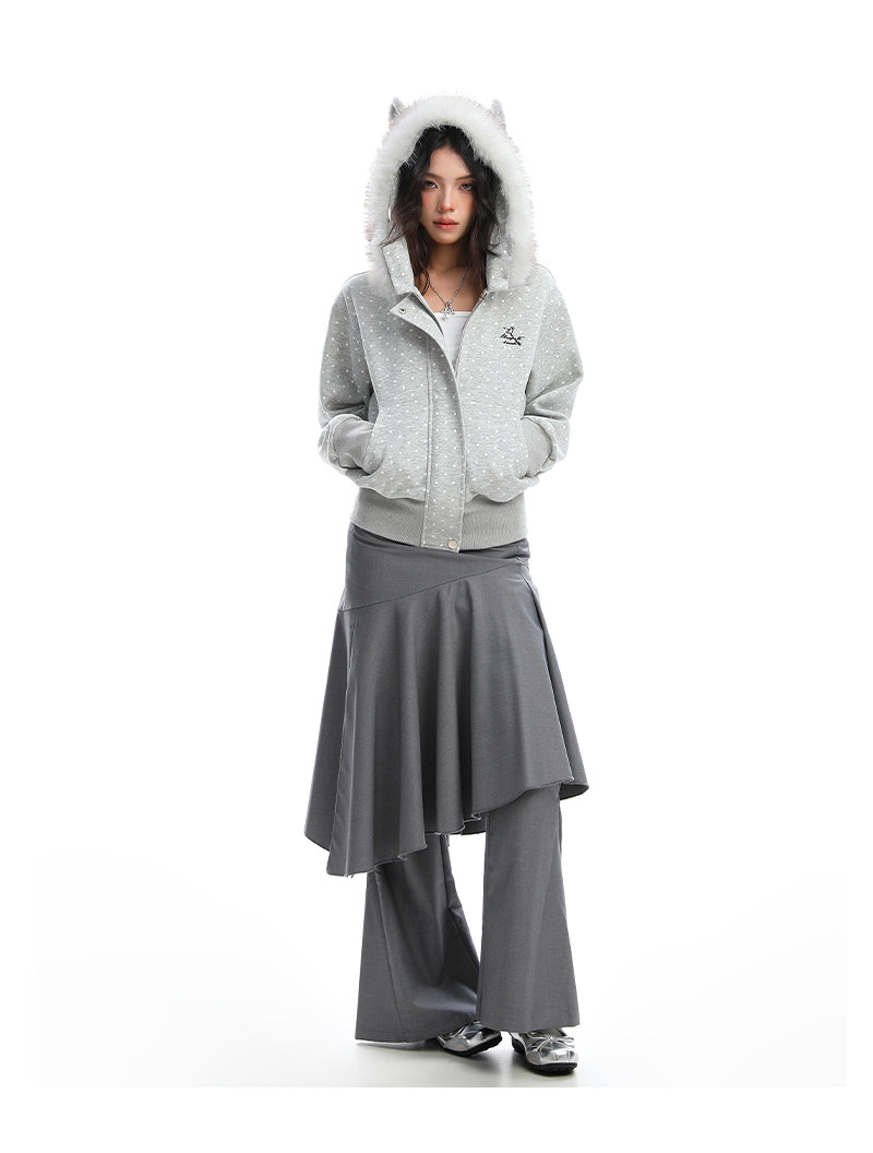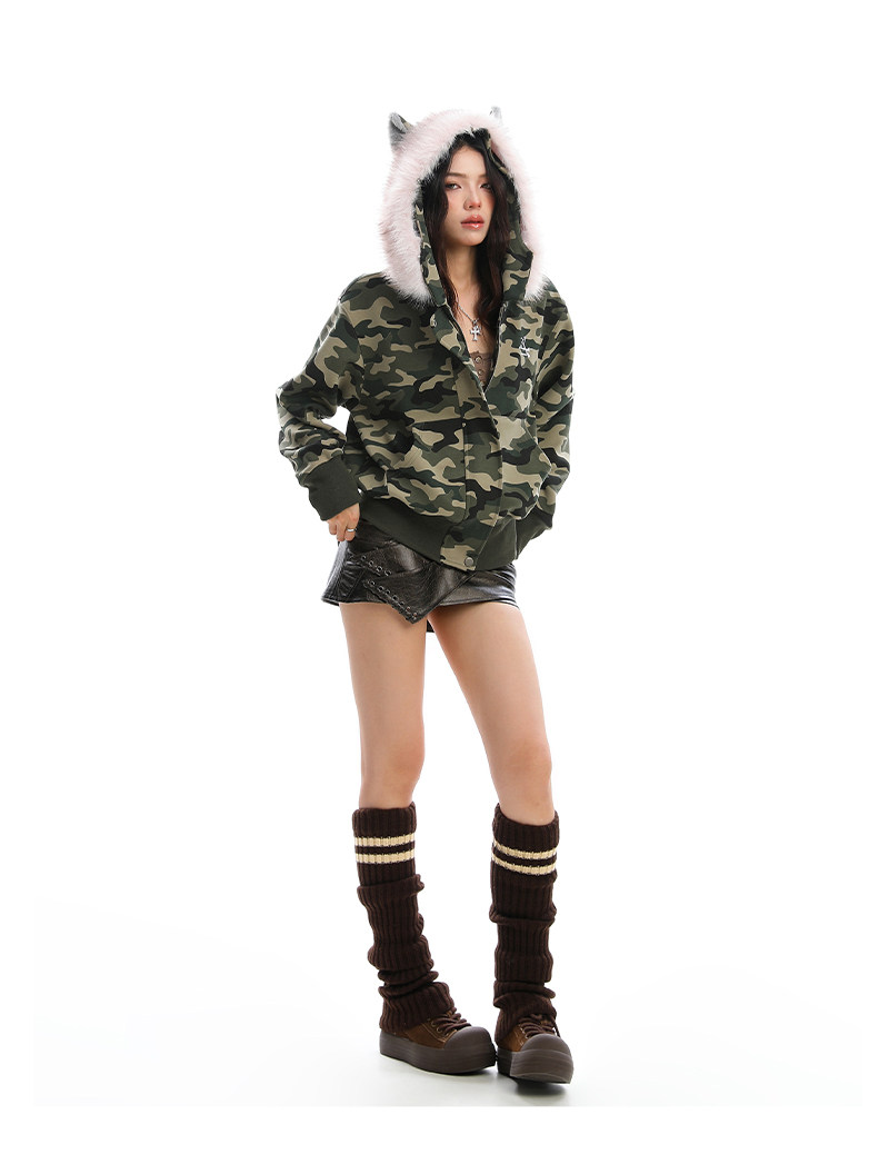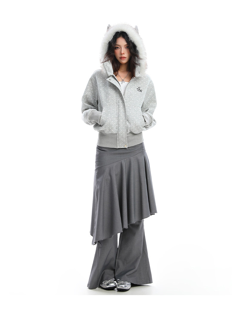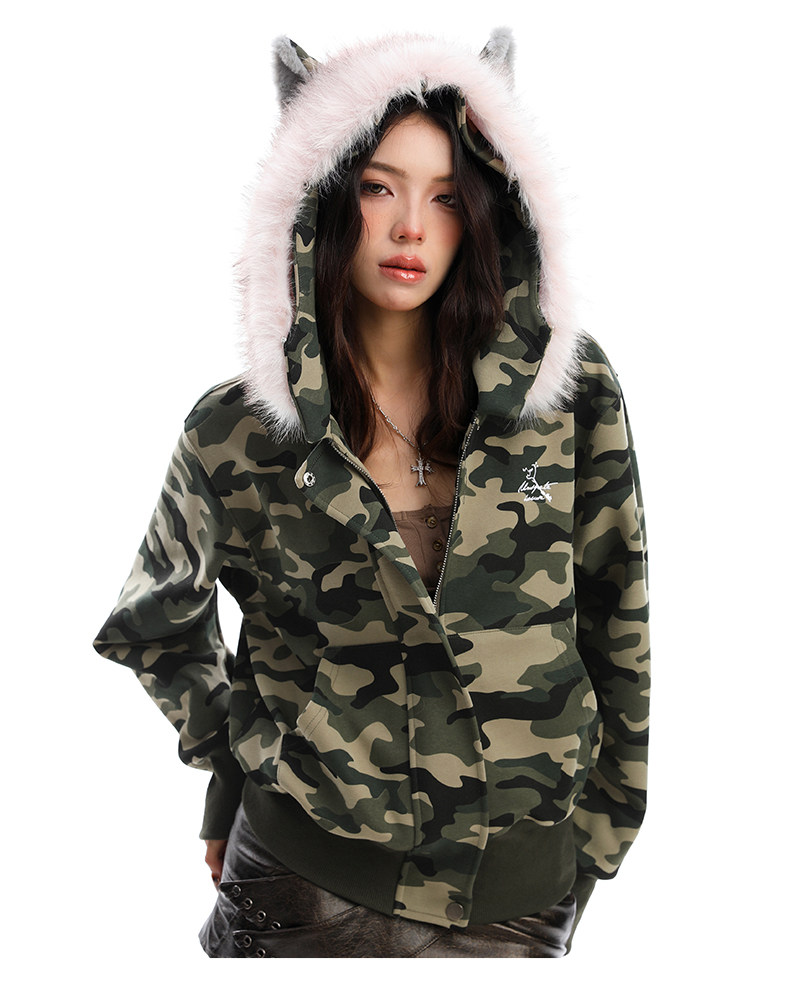 美式復古波點印花毛領貓耳朵連帽開衫衛衣女秋季休閑外套