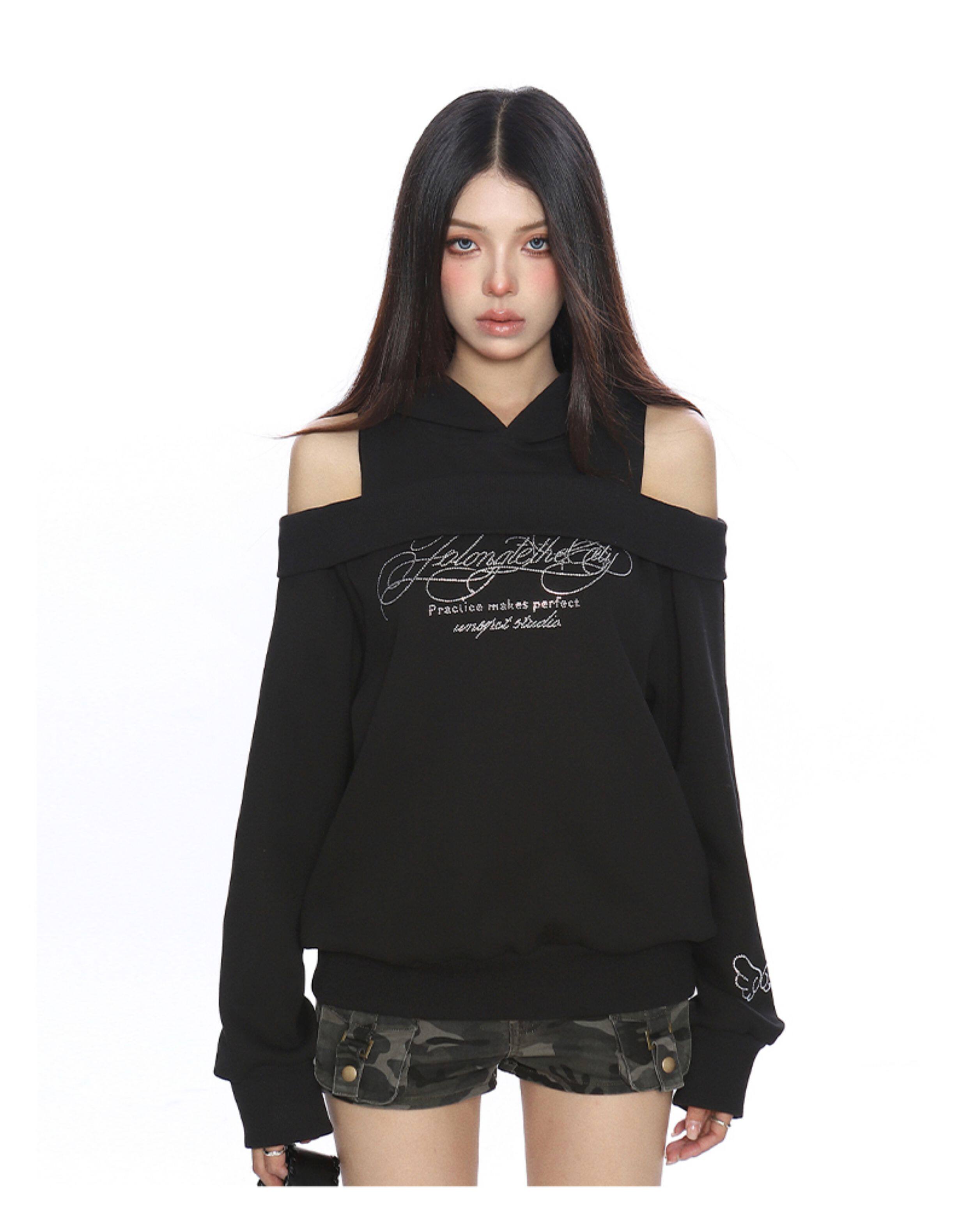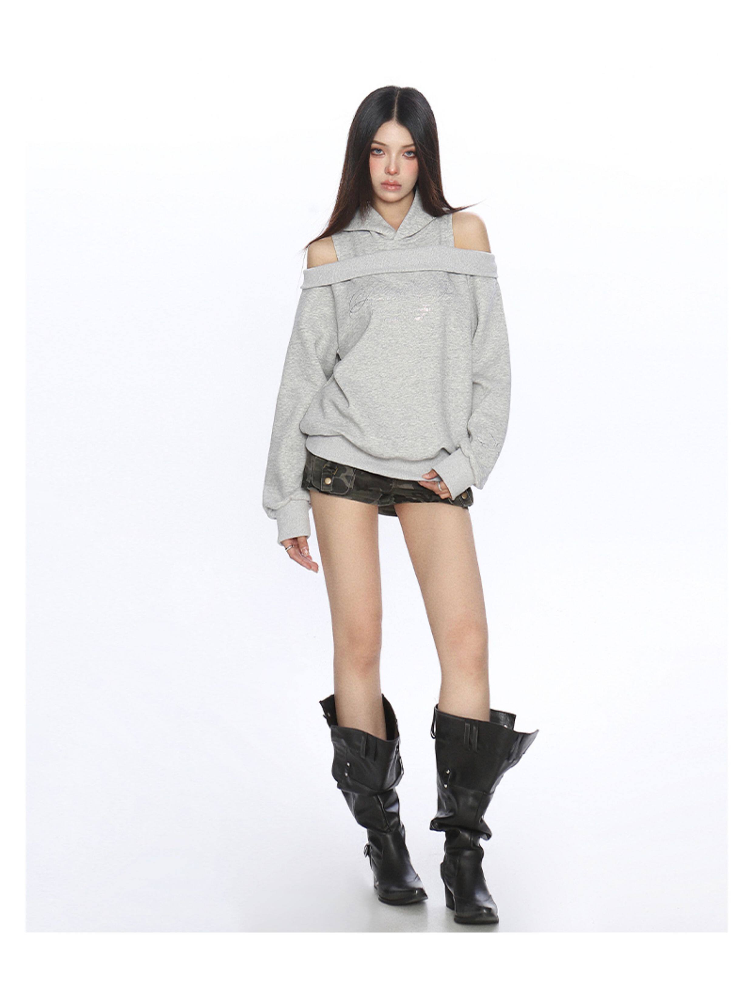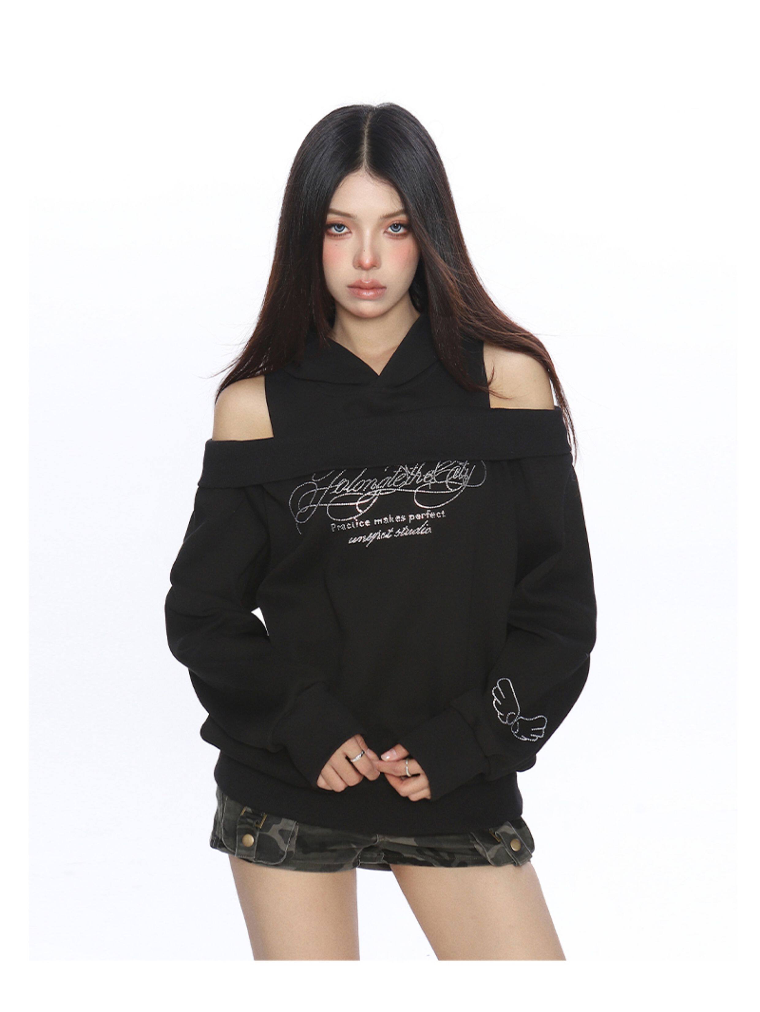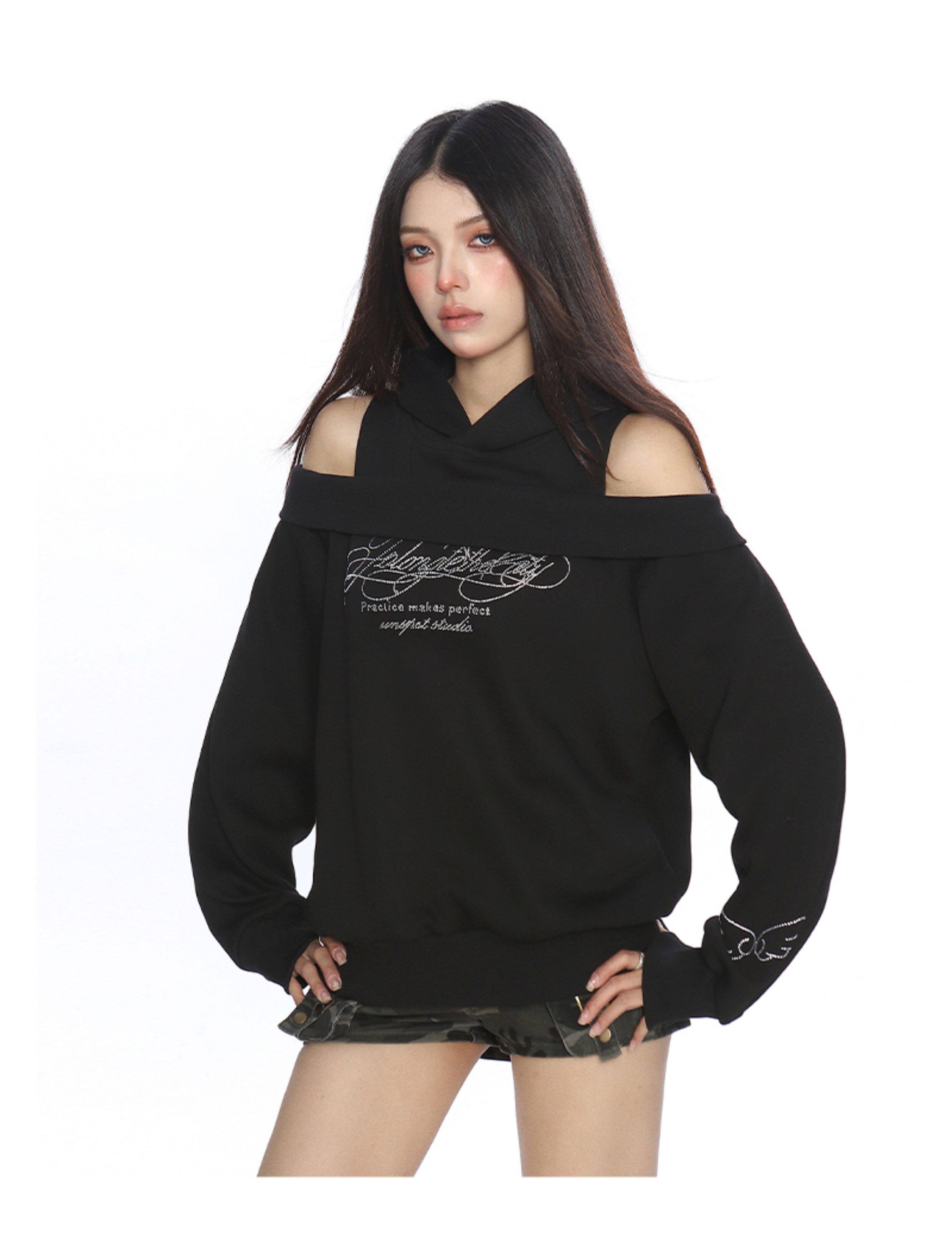 美式燙鉆露肩連帽衛衣女秋冬設計感假兩件寬松休閑上衣潮