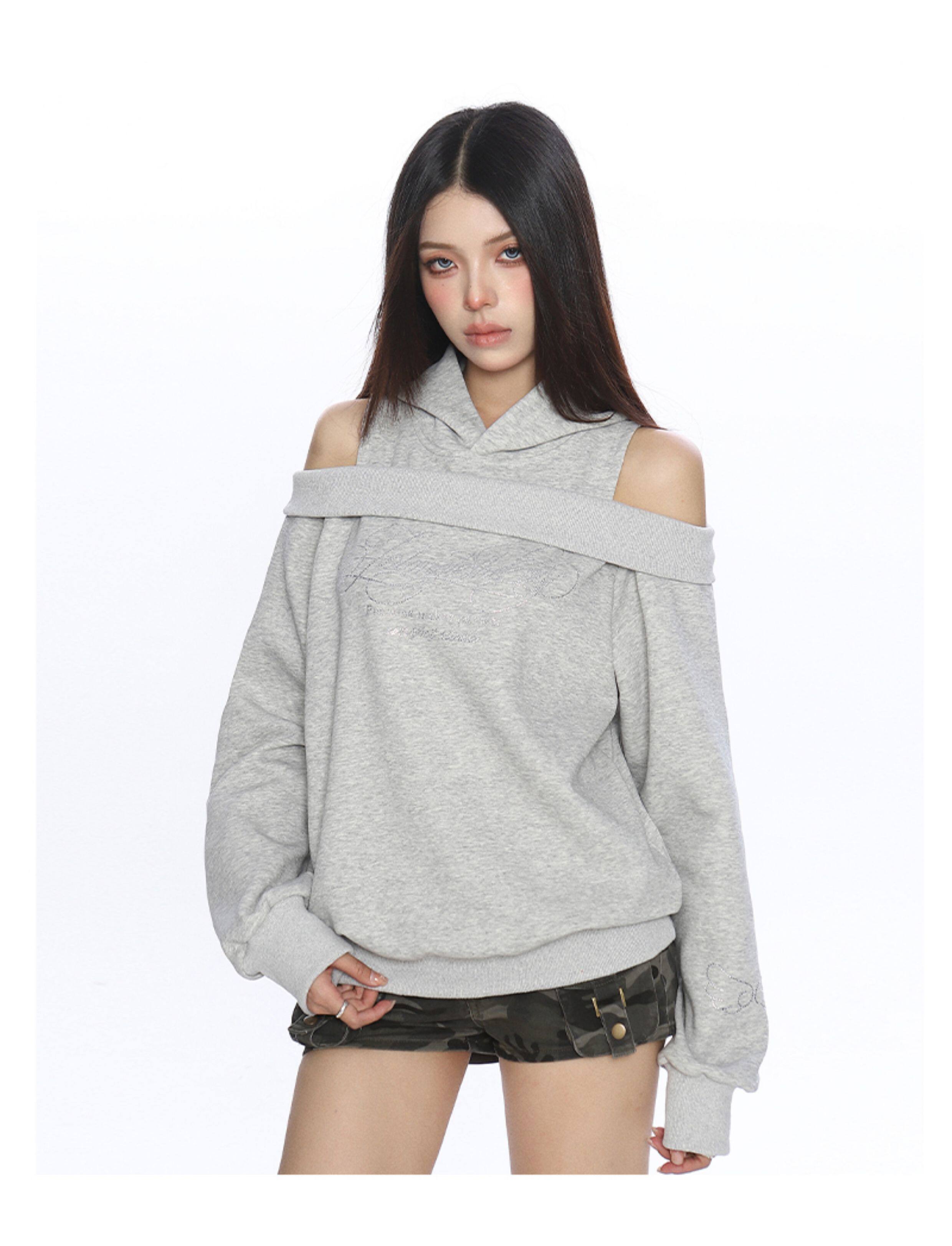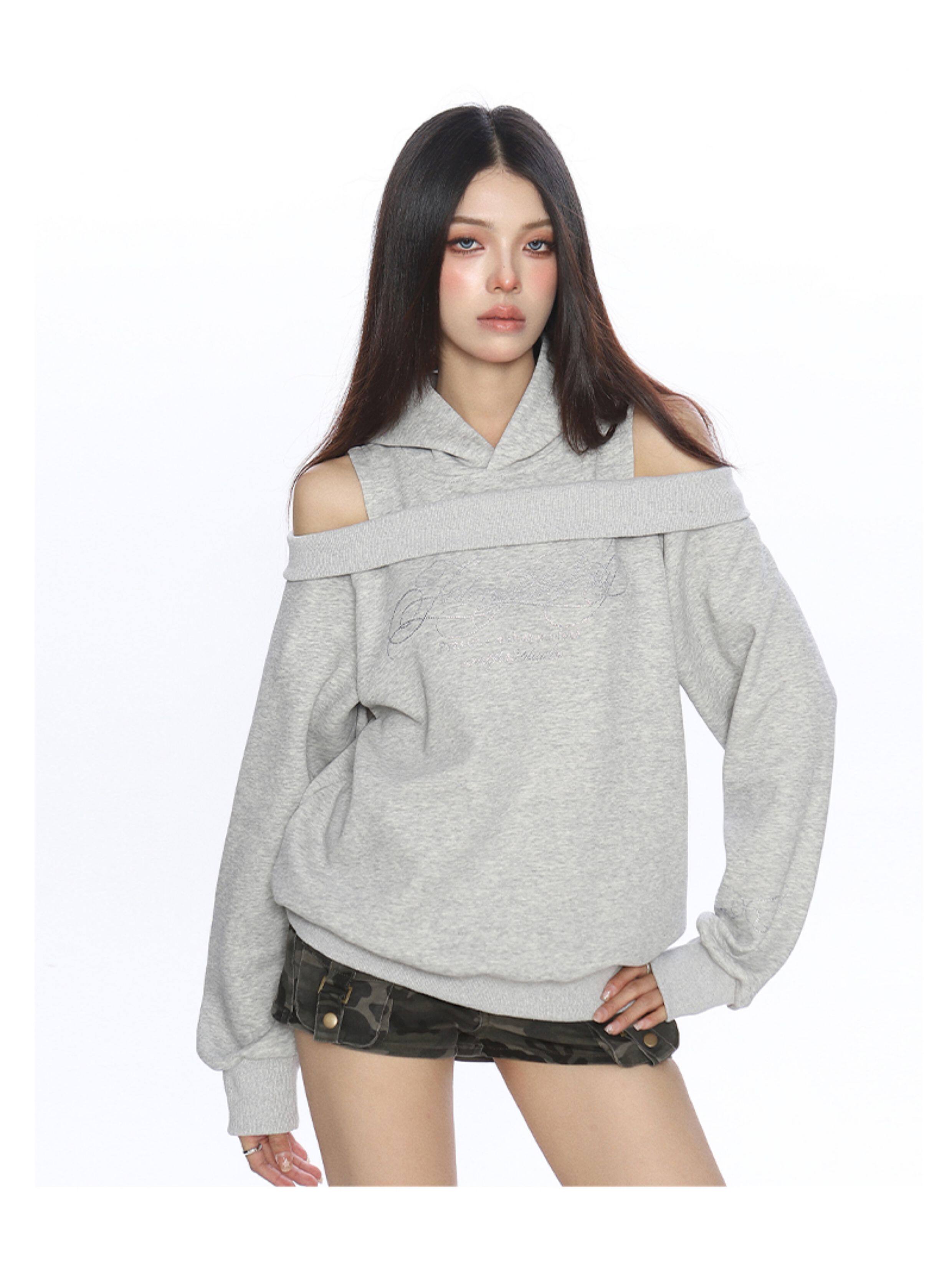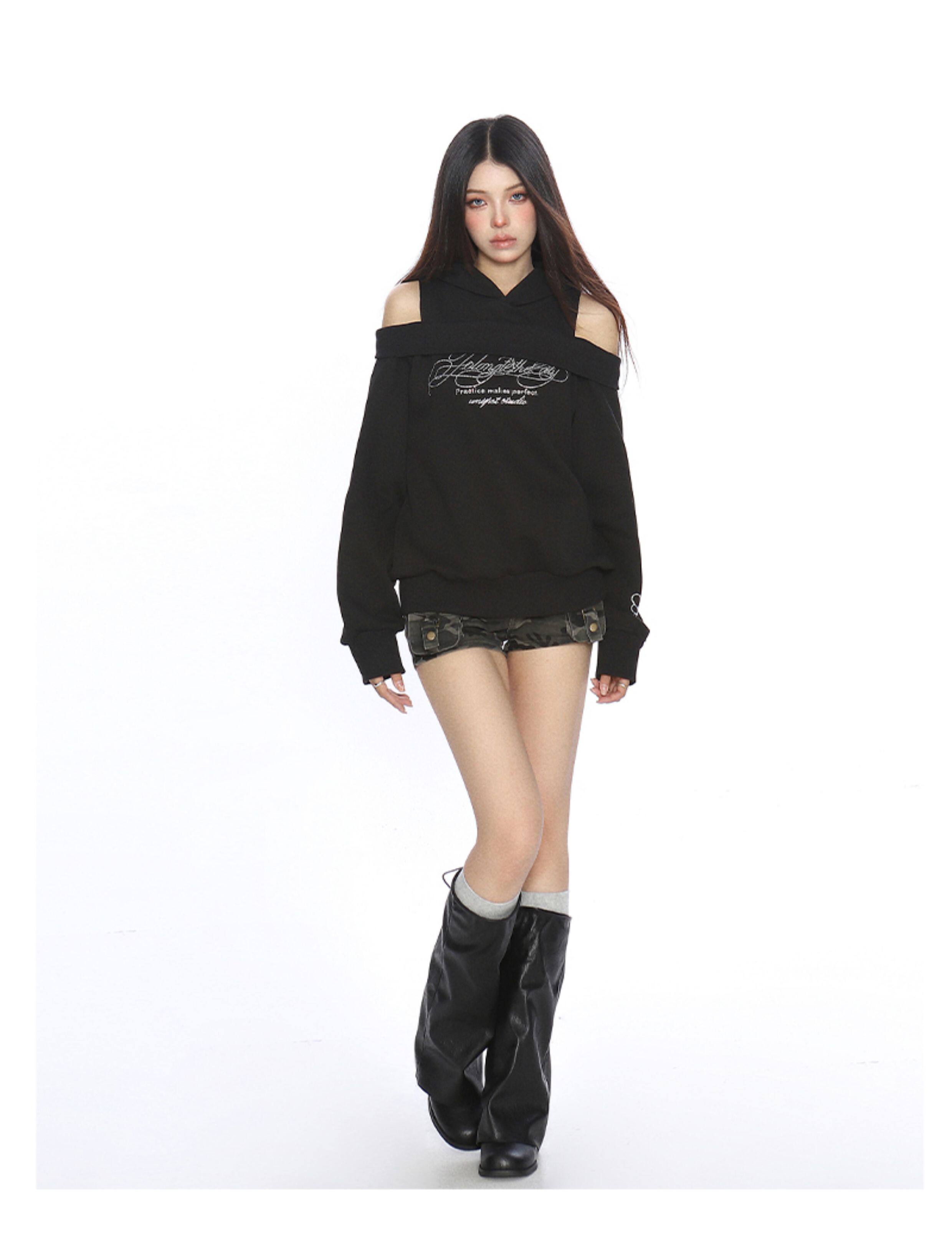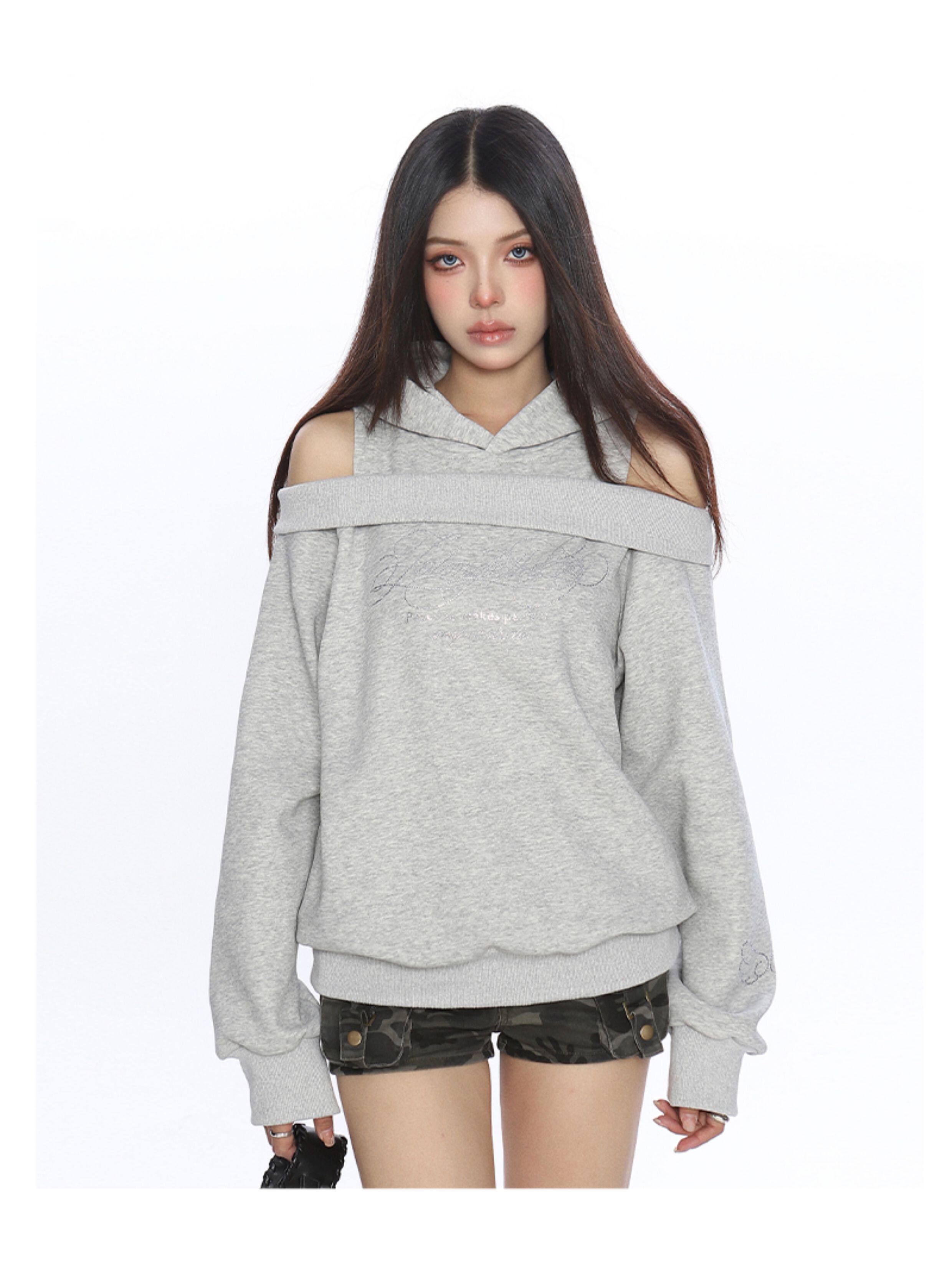 美式燙鉆露肩連帽衛衣女秋冬設計感假兩件寬松休閑上衣潮