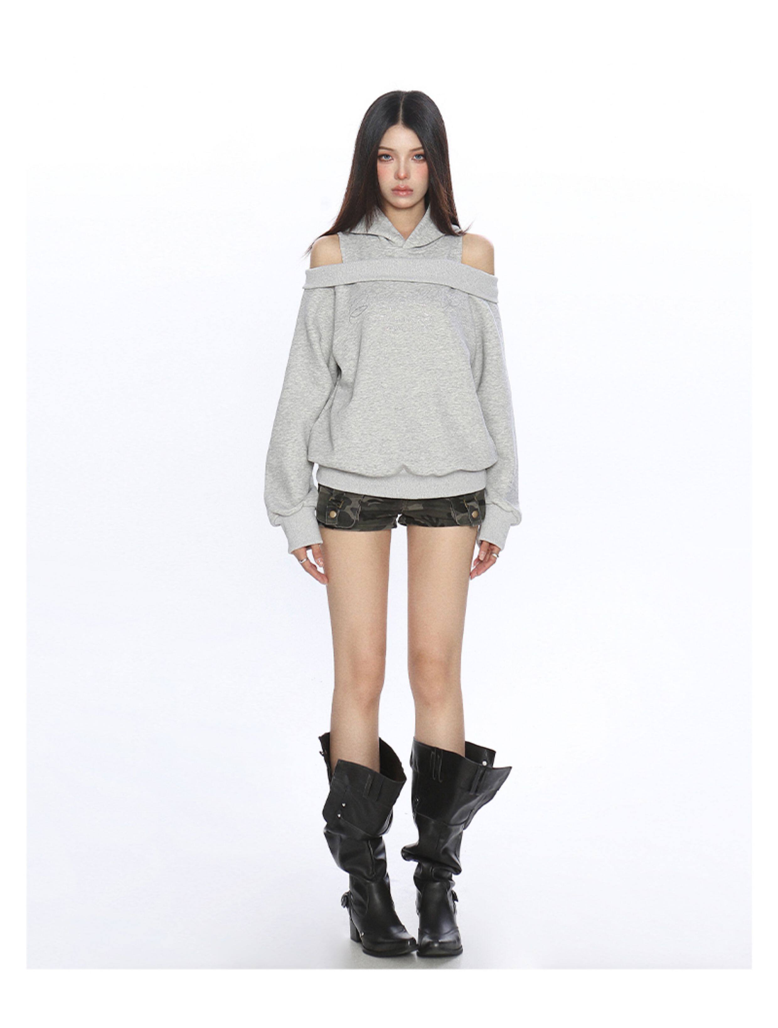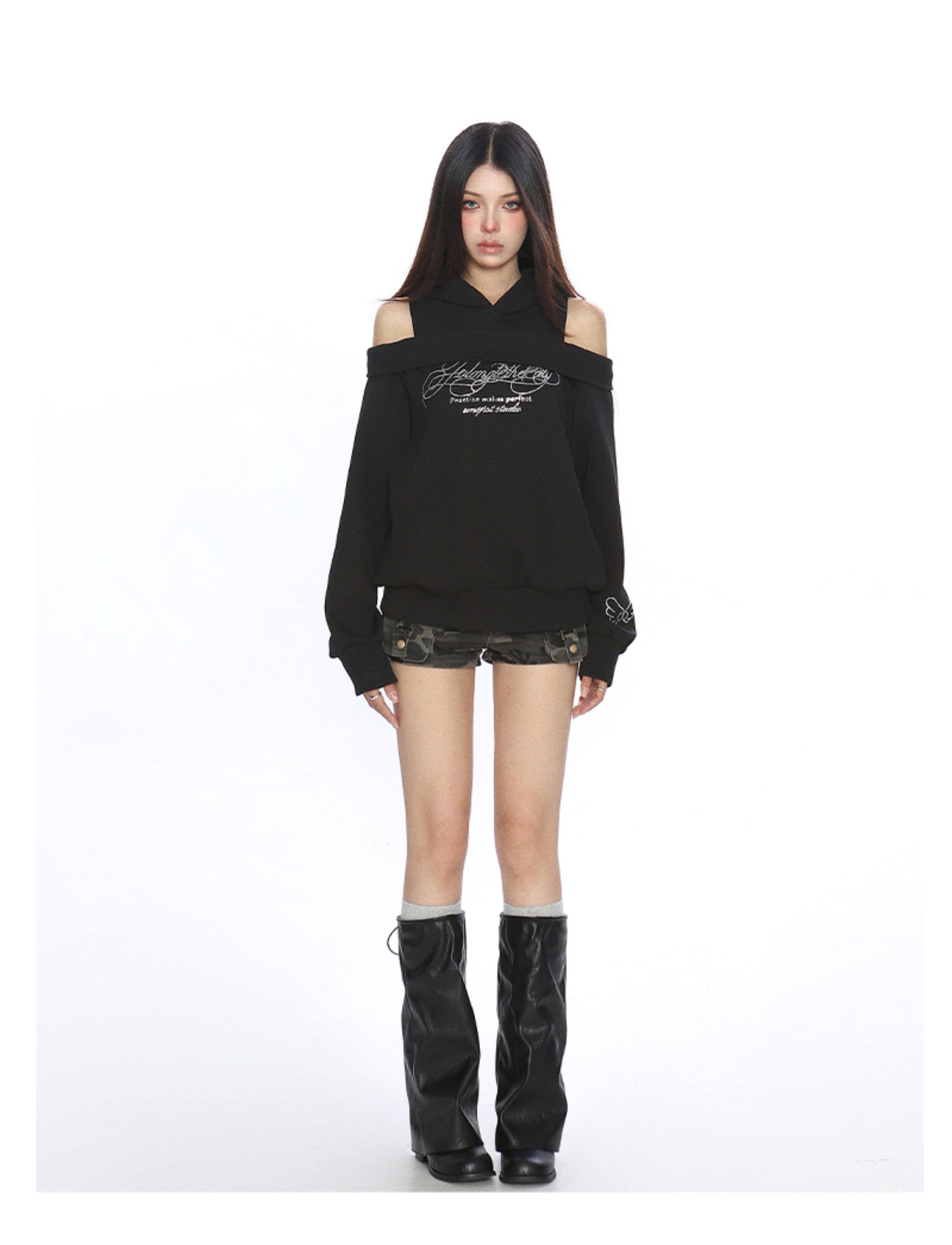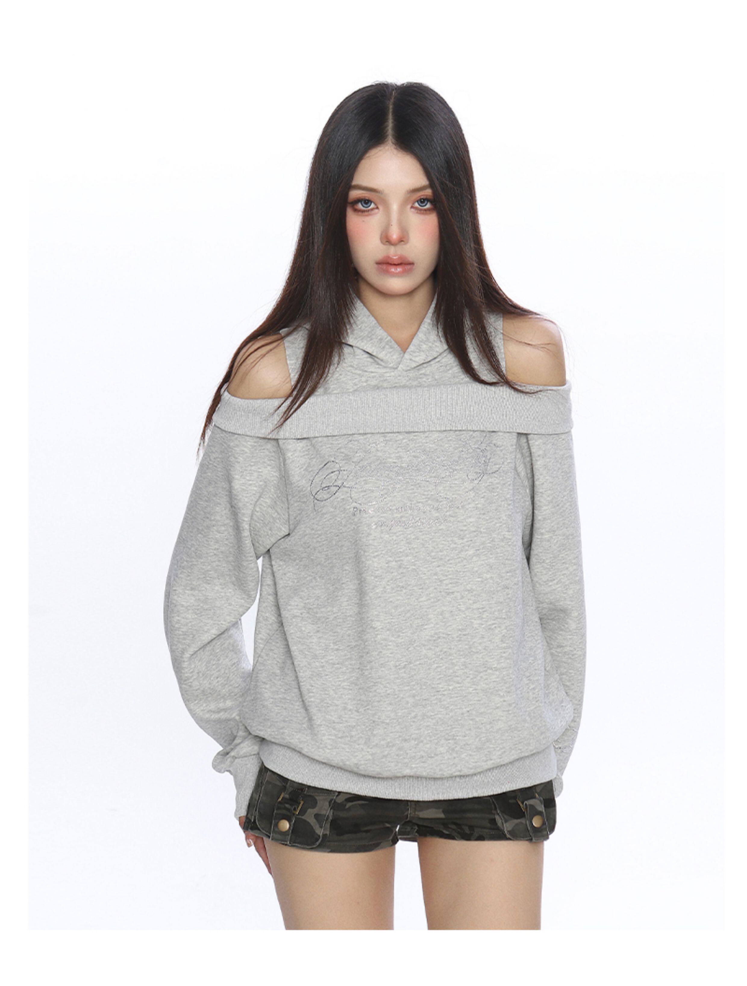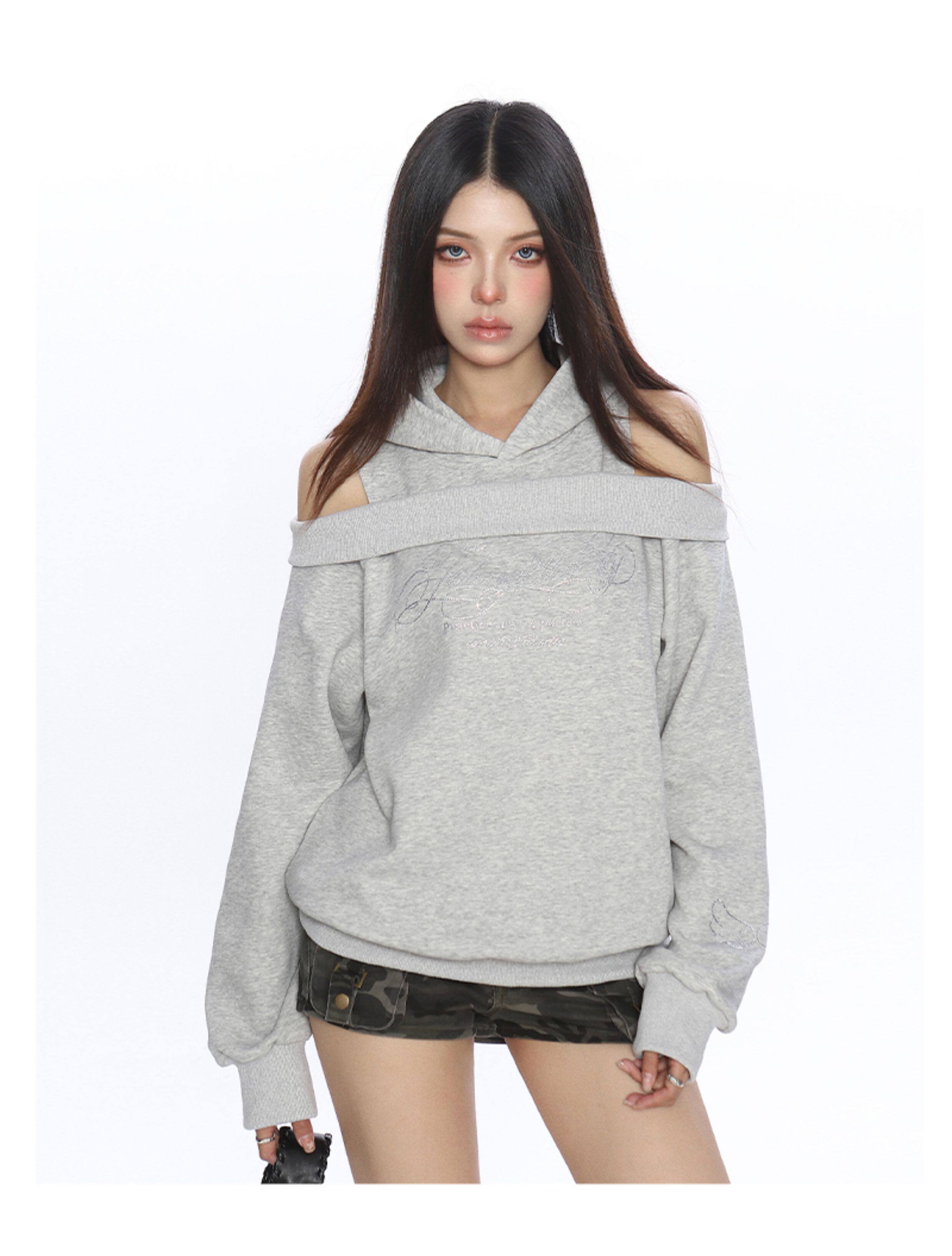 美式燙鉆露肩連帽衛衣女秋冬設計感假兩件寬松休閑上衣潮