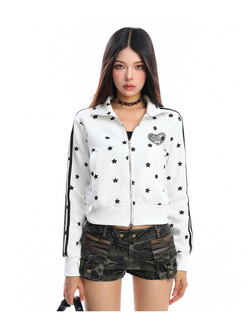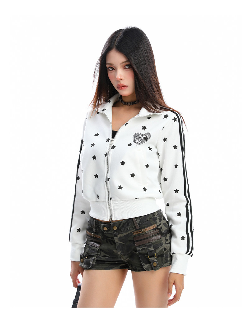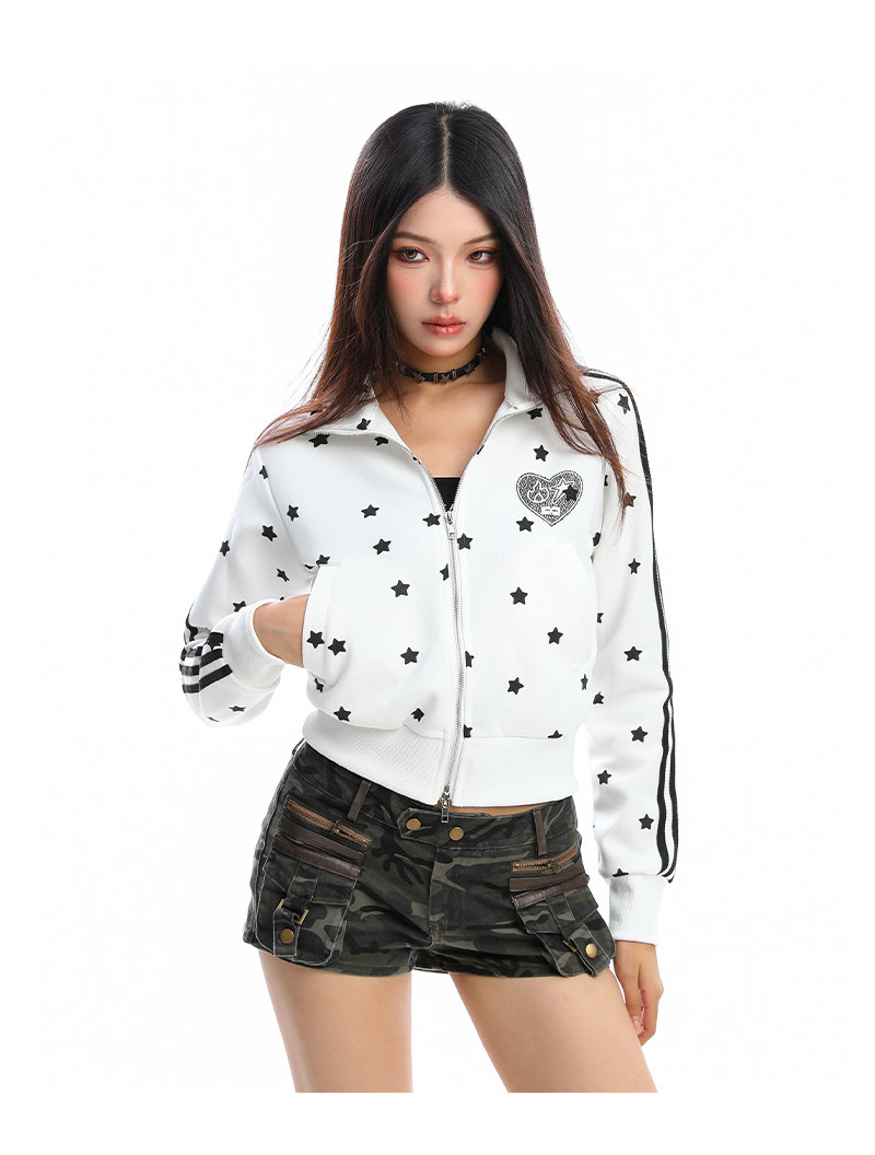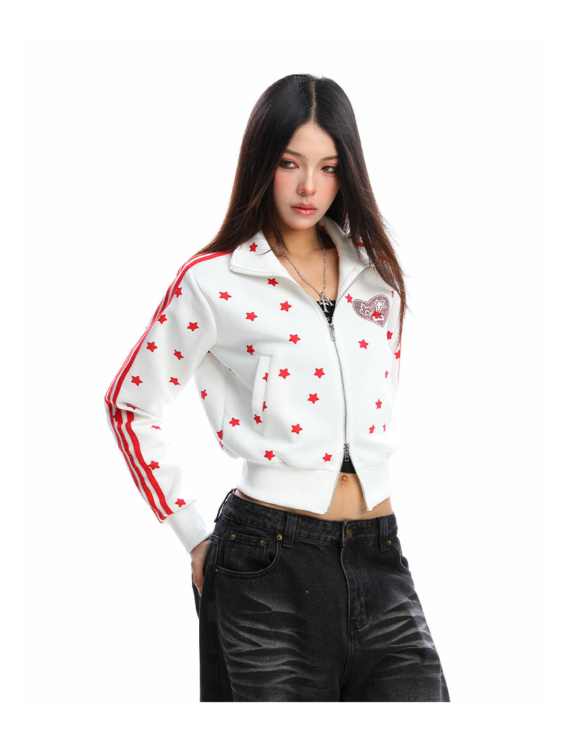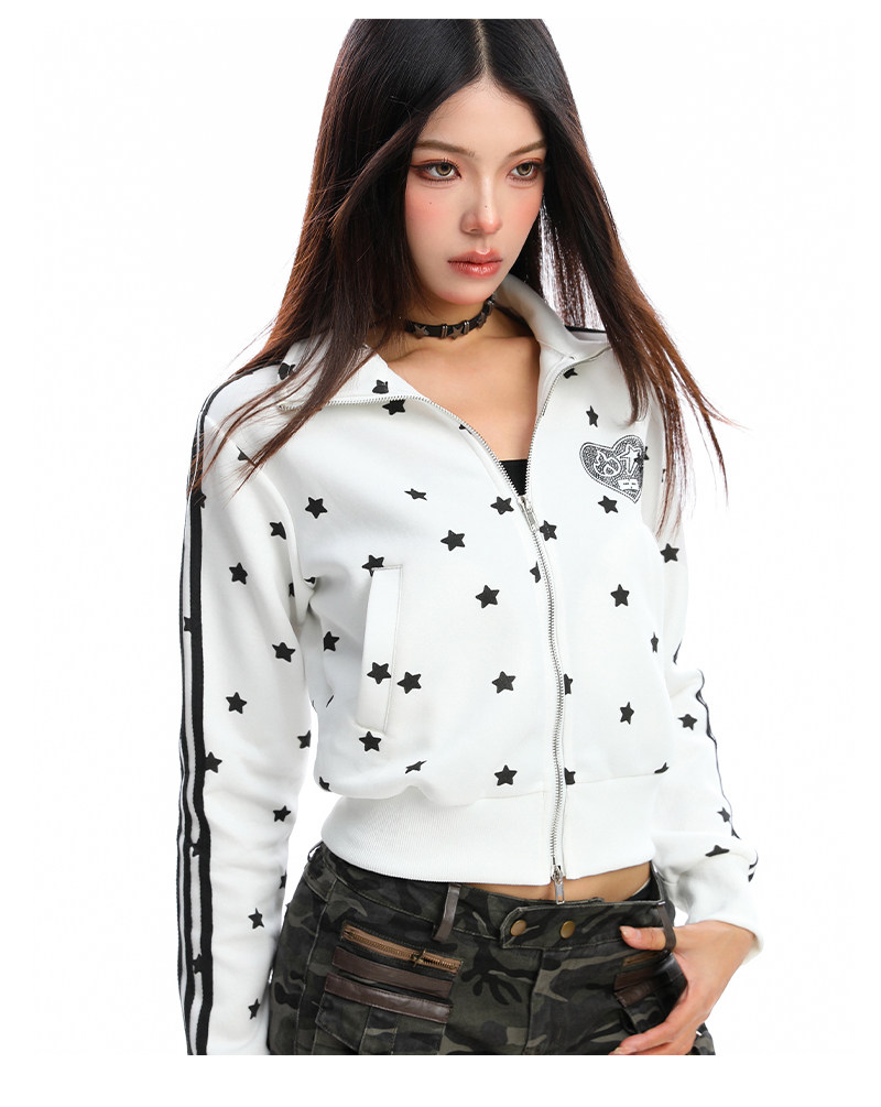 美式燙鉆星星杠條立領衛衣女秋季設計感顯瘦短款拉鏈外套