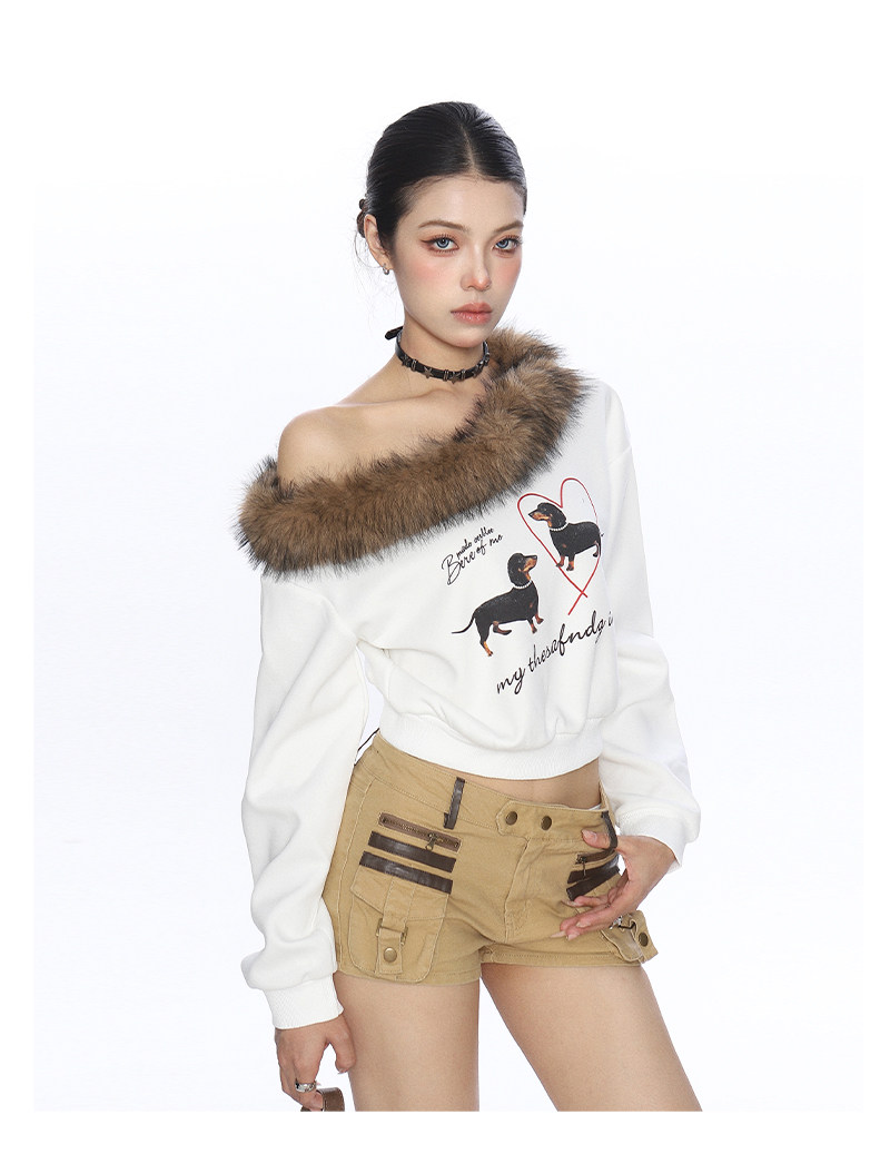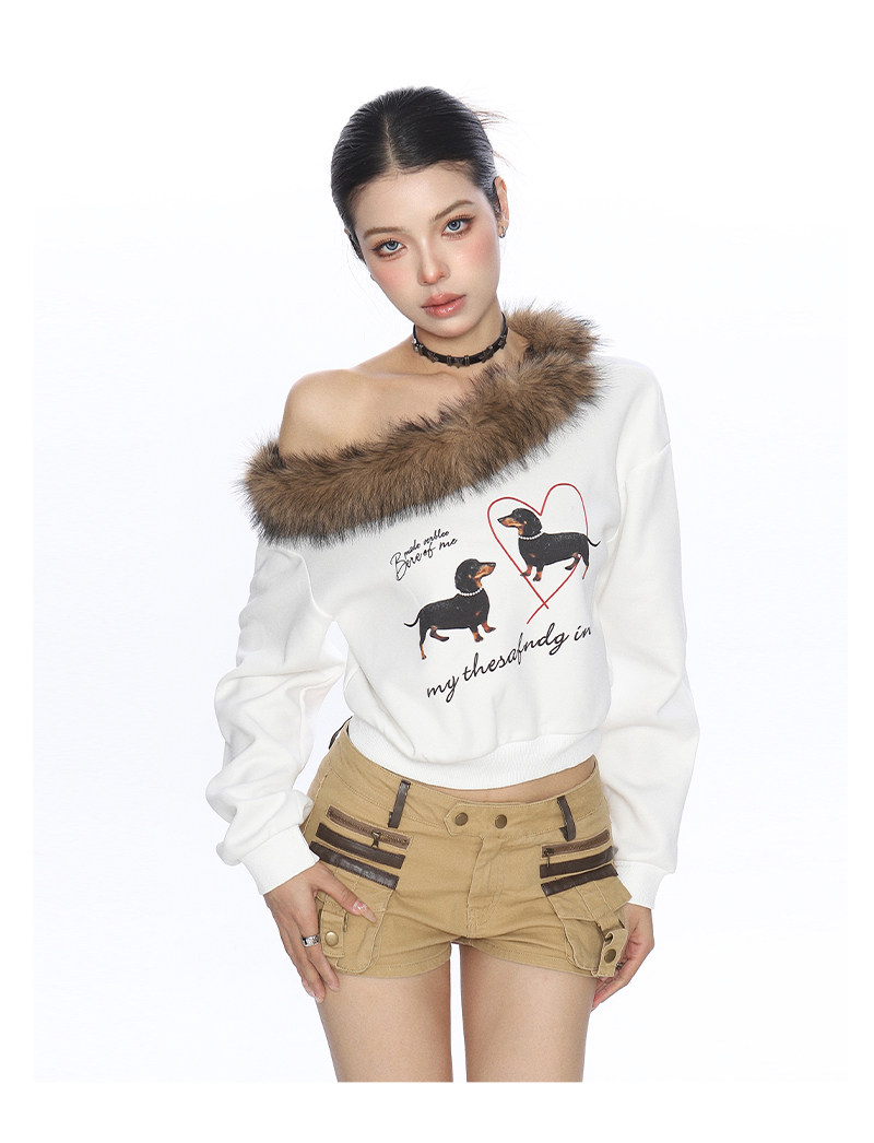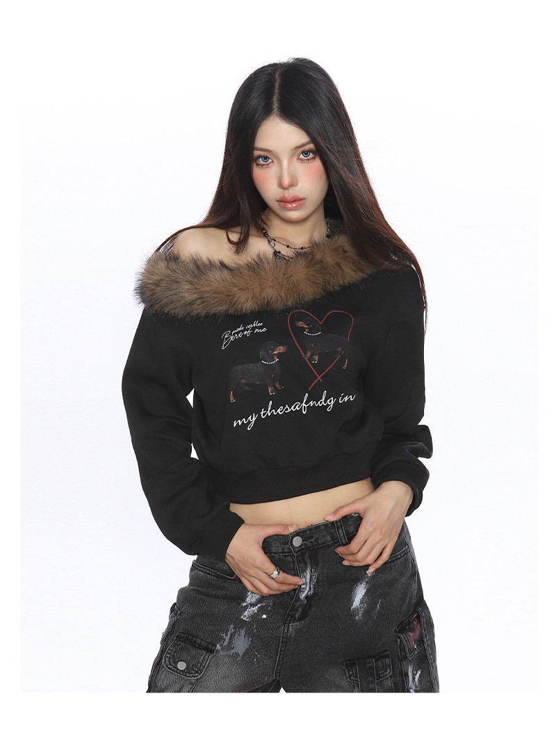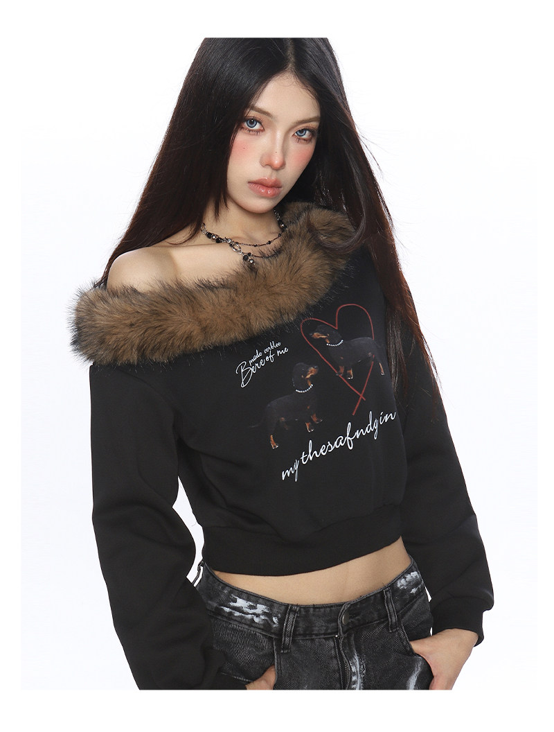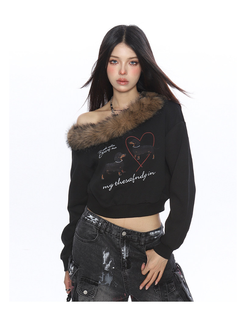 辣妹臘腸狗可拆卸毛領斜肩衛衣女秋冬設計感顯瘦露肩上衣