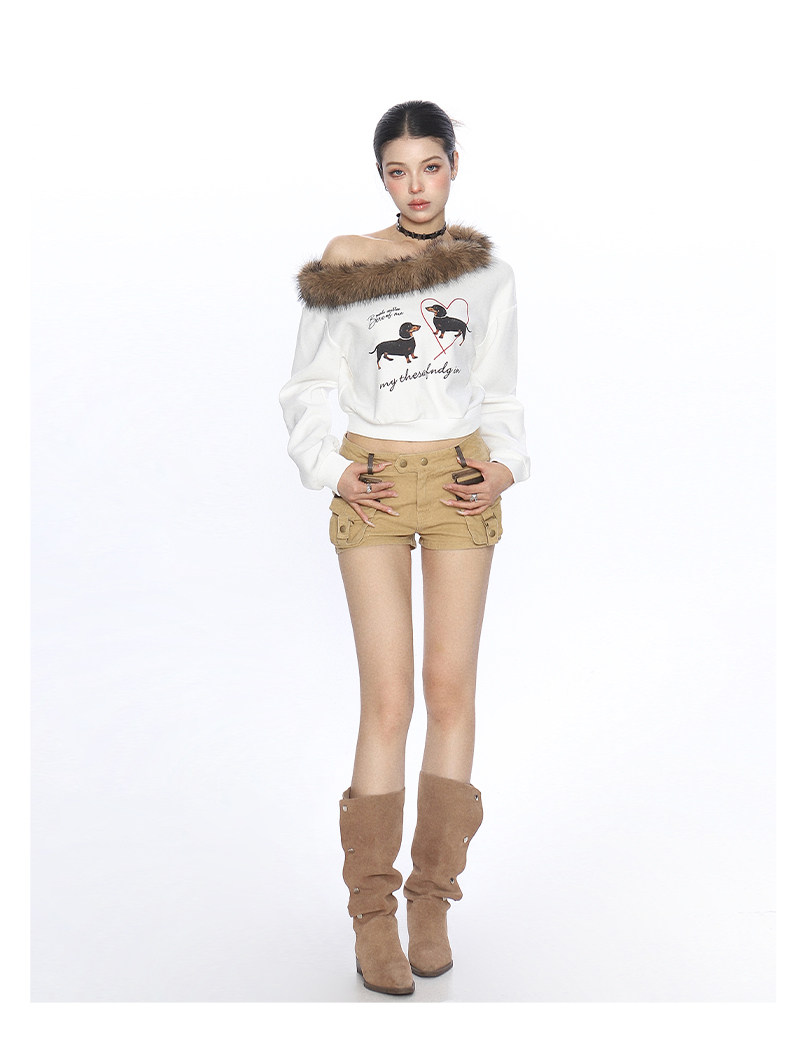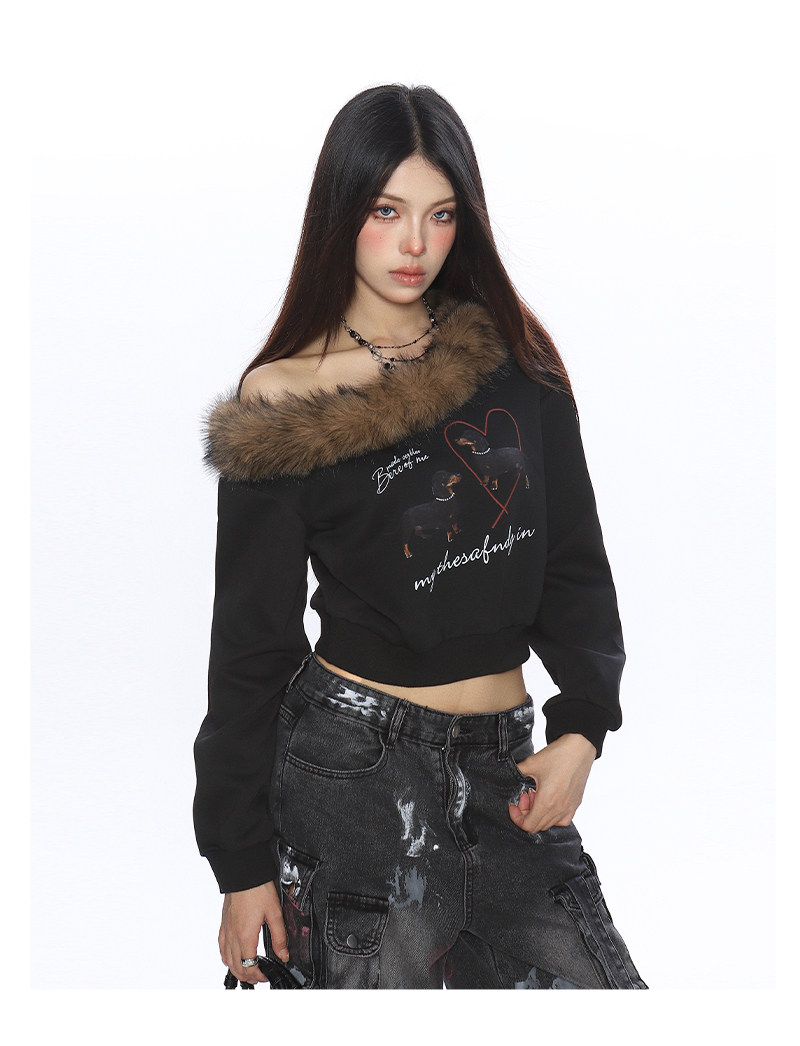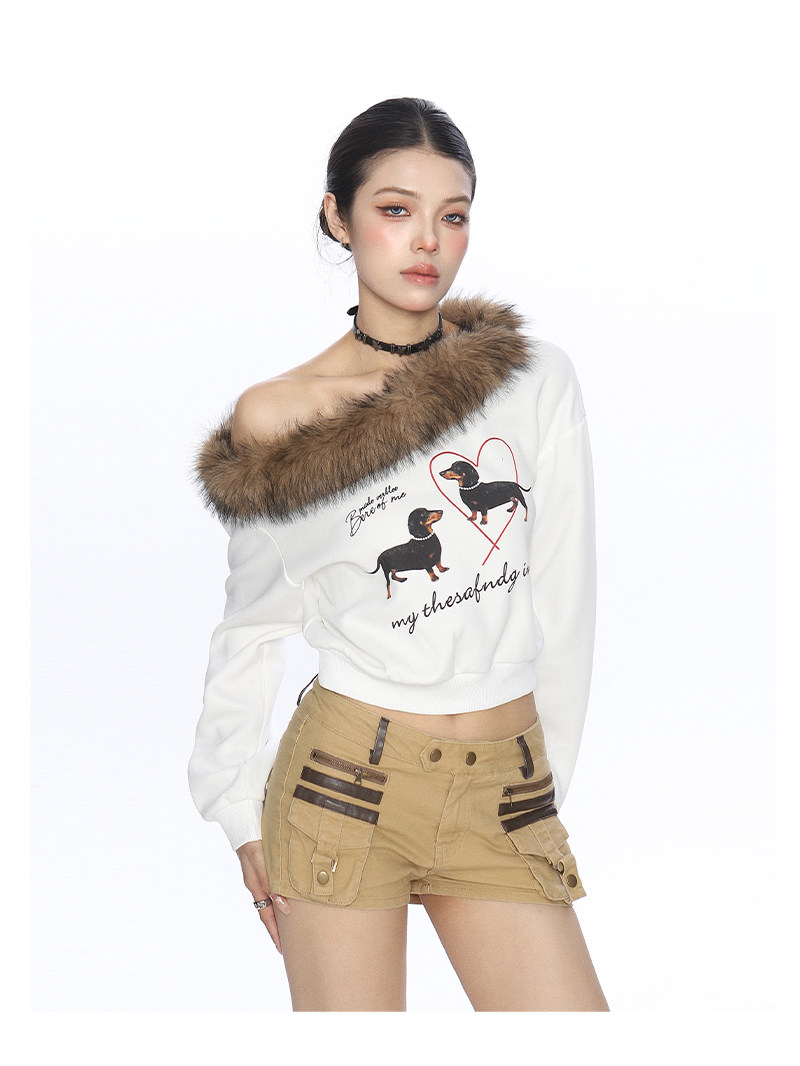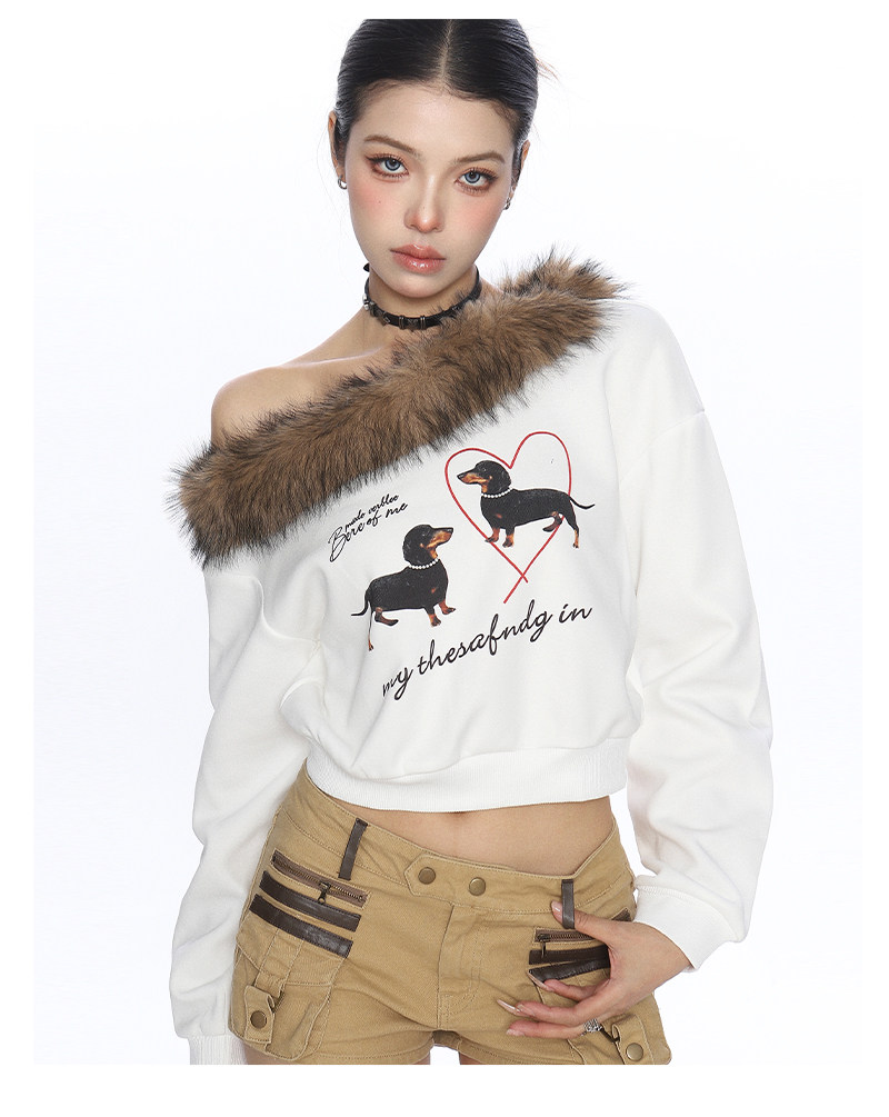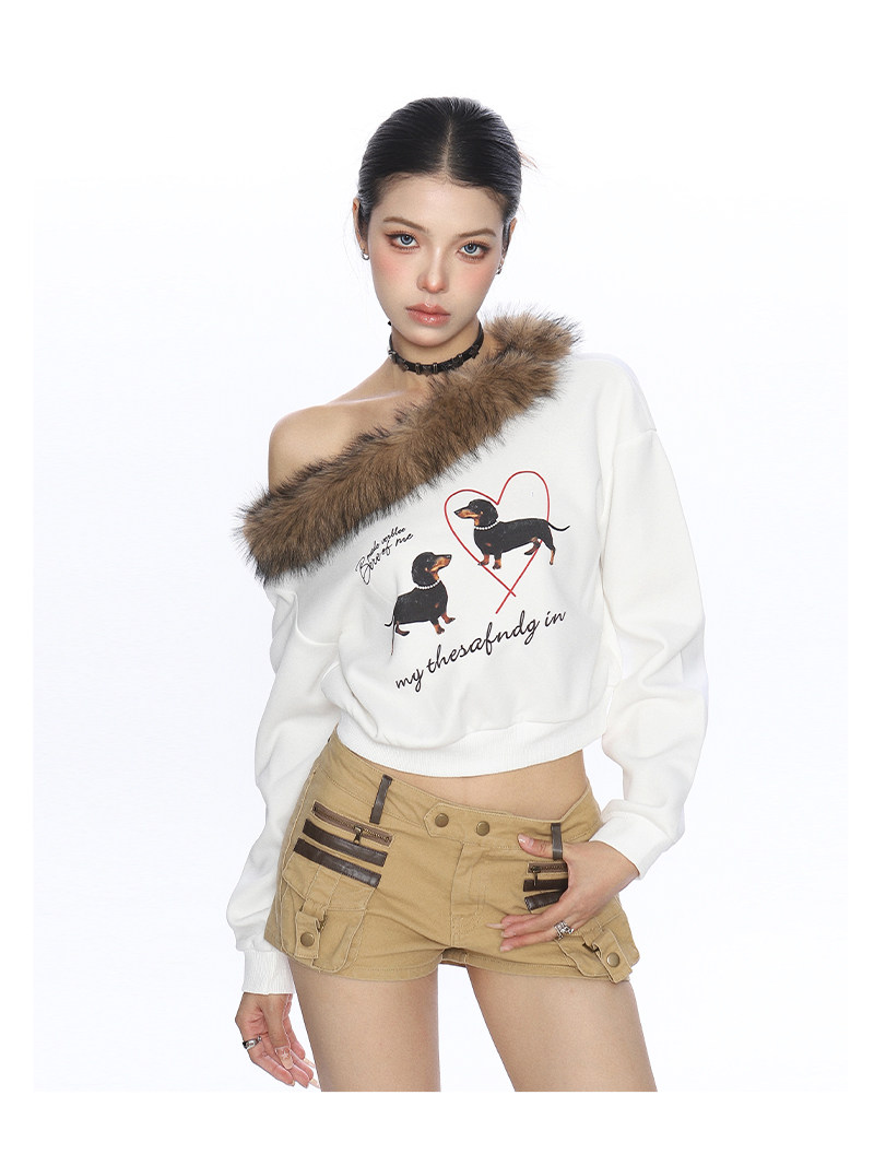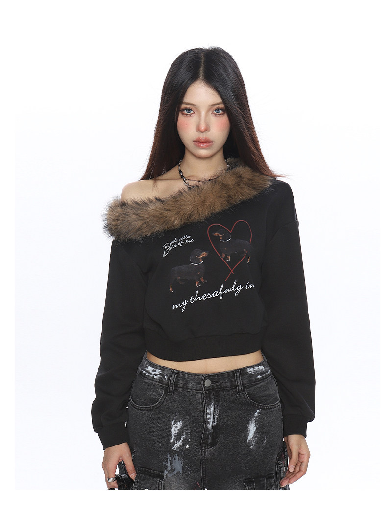 辣妹臘腸狗可拆卸毛領斜肩衛衣女秋冬設計感顯瘦露肩上衣