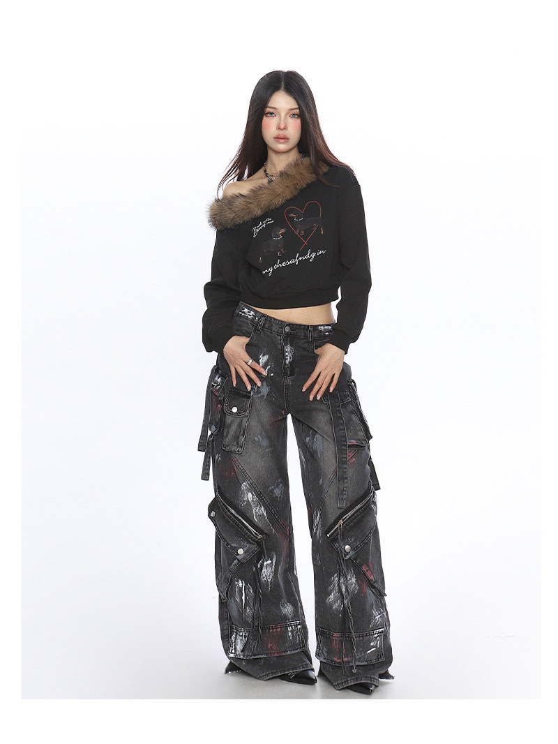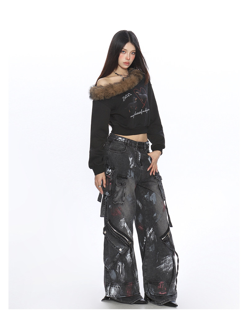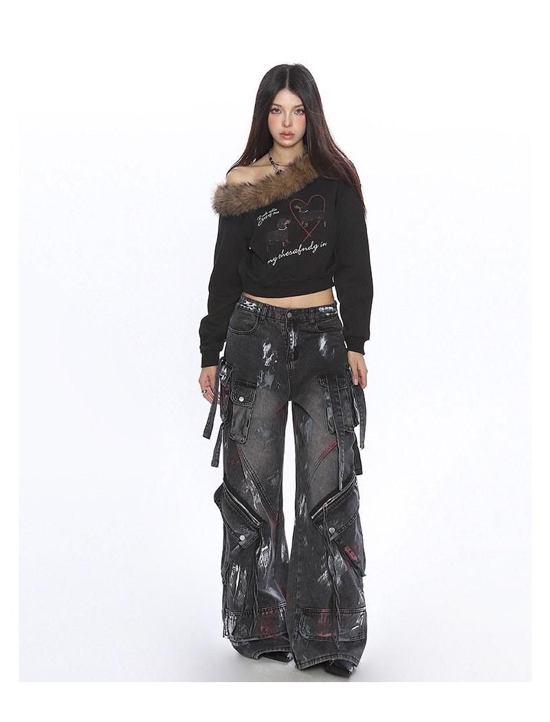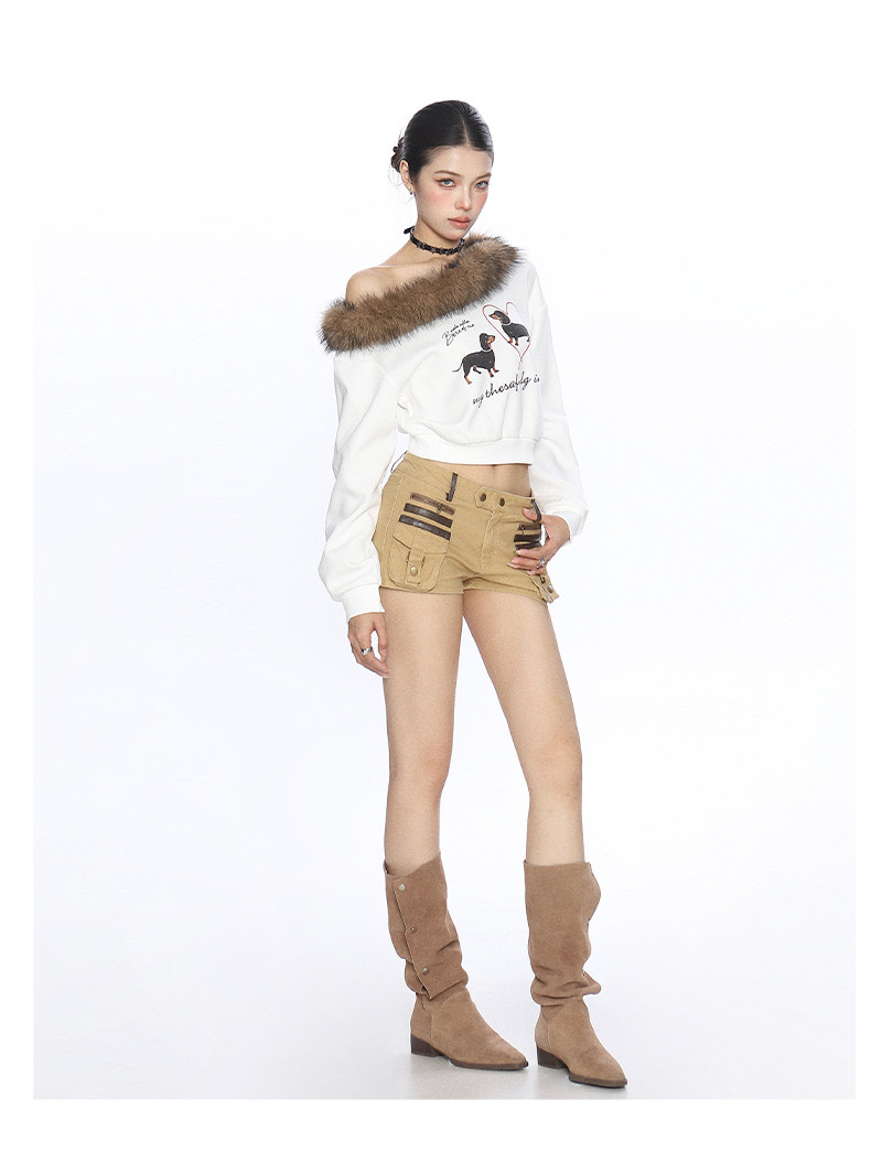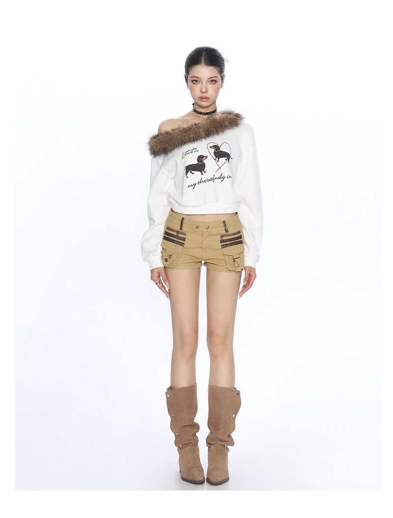 辣妹臘腸狗可拆卸毛領斜肩衛衣女秋冬設計感顯瘦露肩上衣