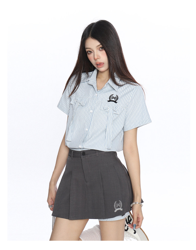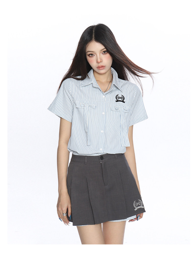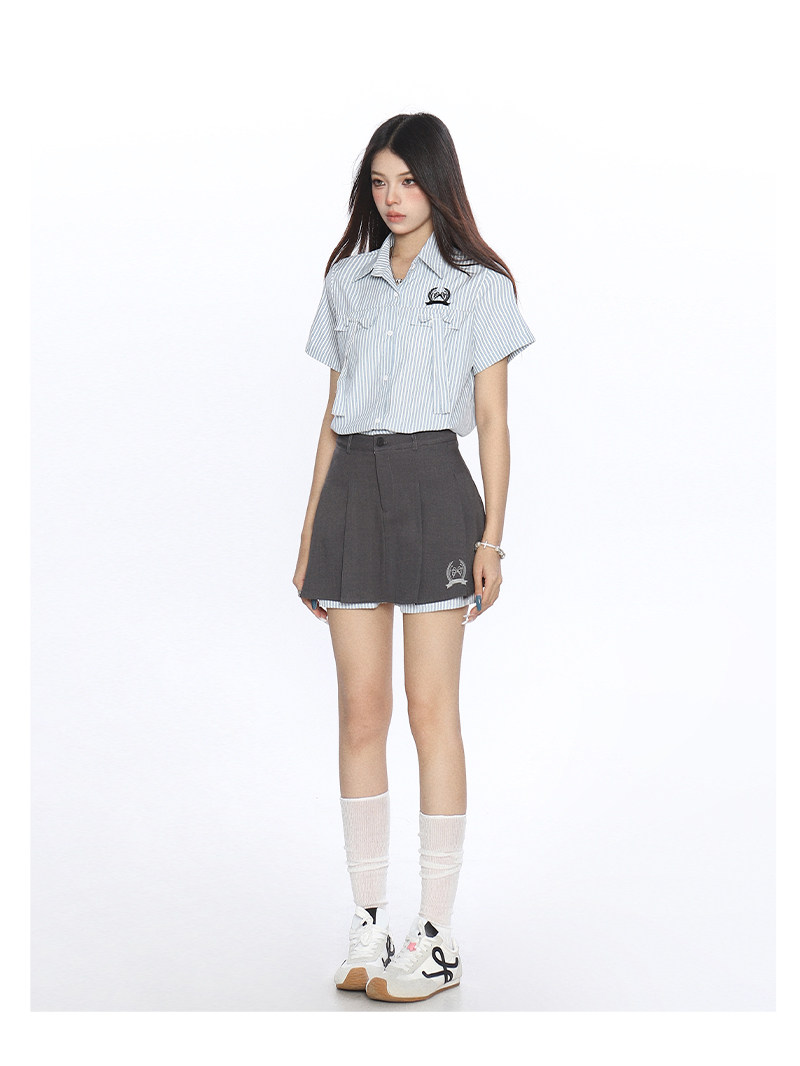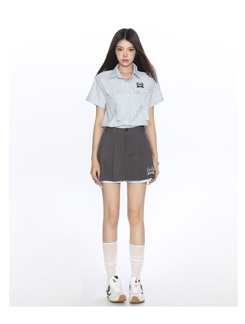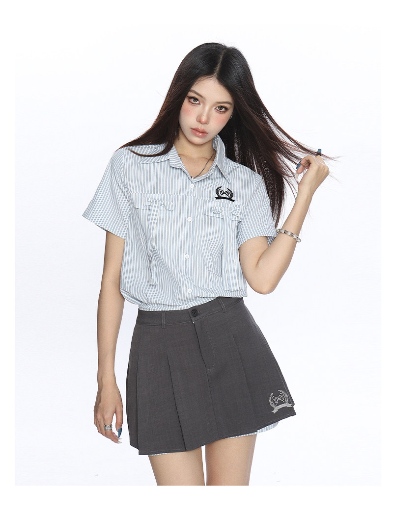 韓系穿搭豎條紋Polo領襯衫套裝女夏季a字顯瘦百褶裙兩件套