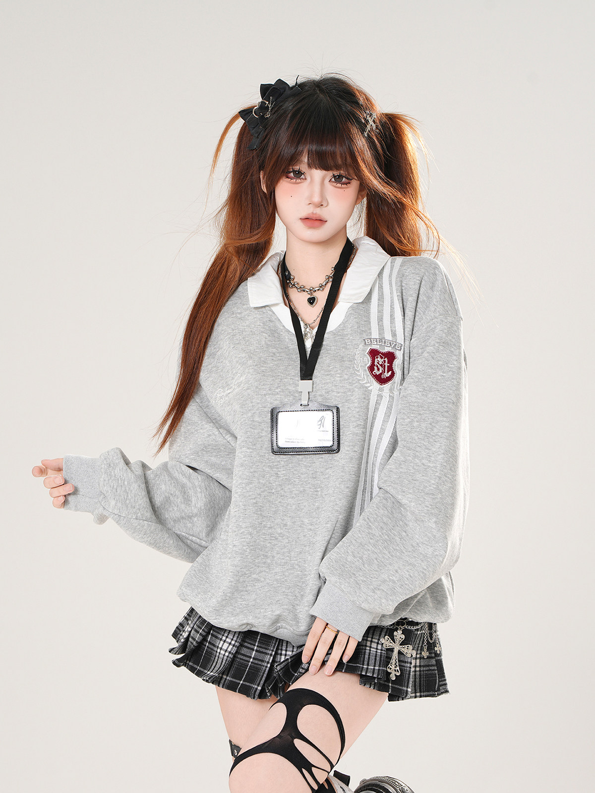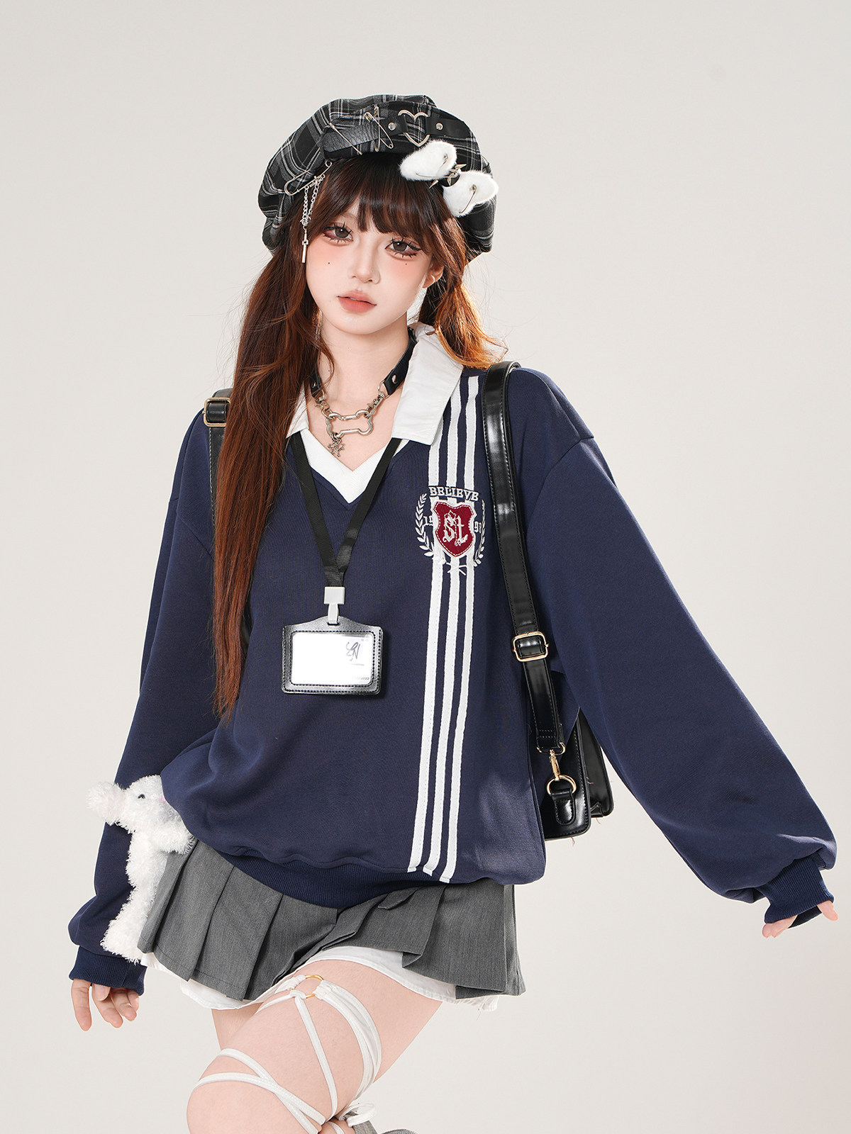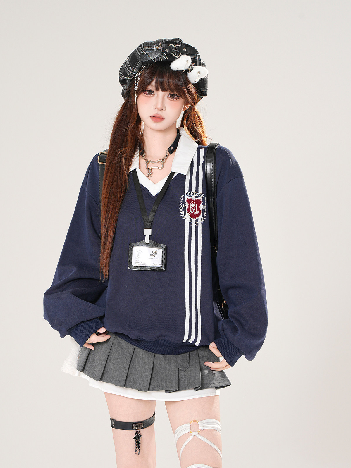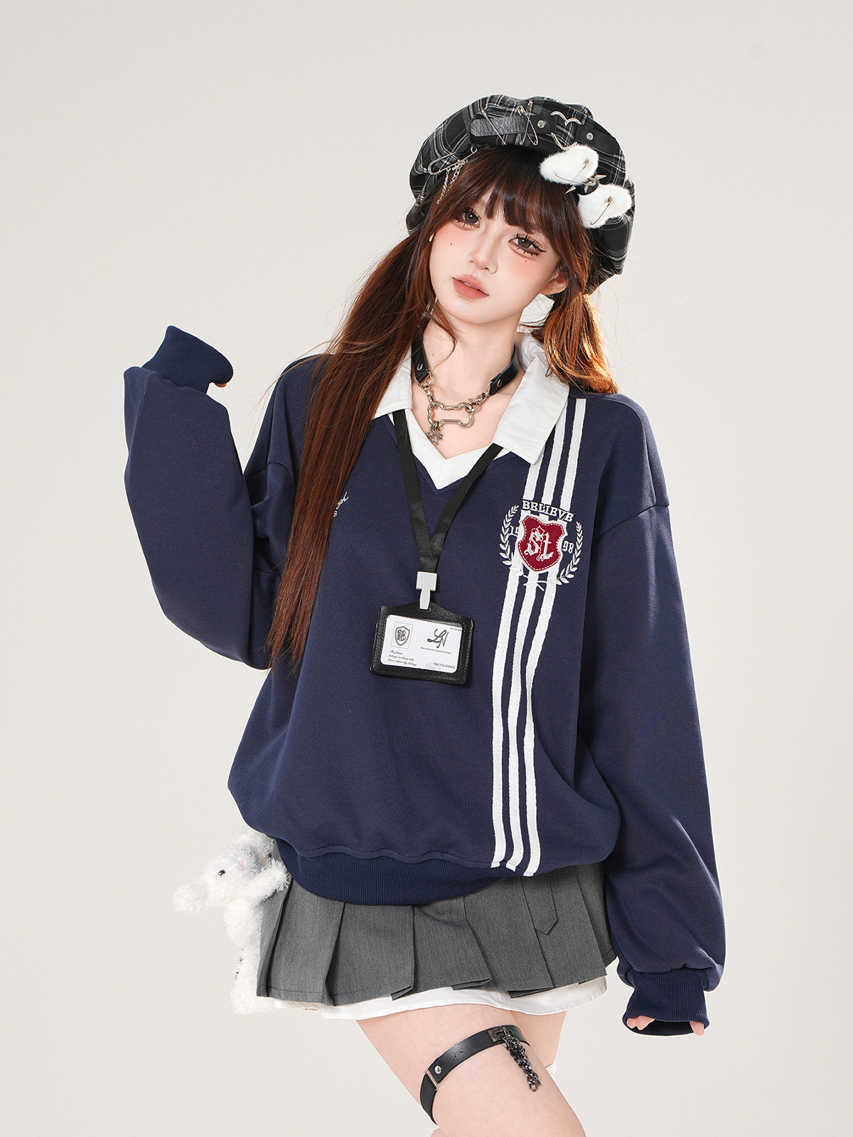 韓女范本 美式學院風衛衣女秋寬松顯瘦polo領運動上衣