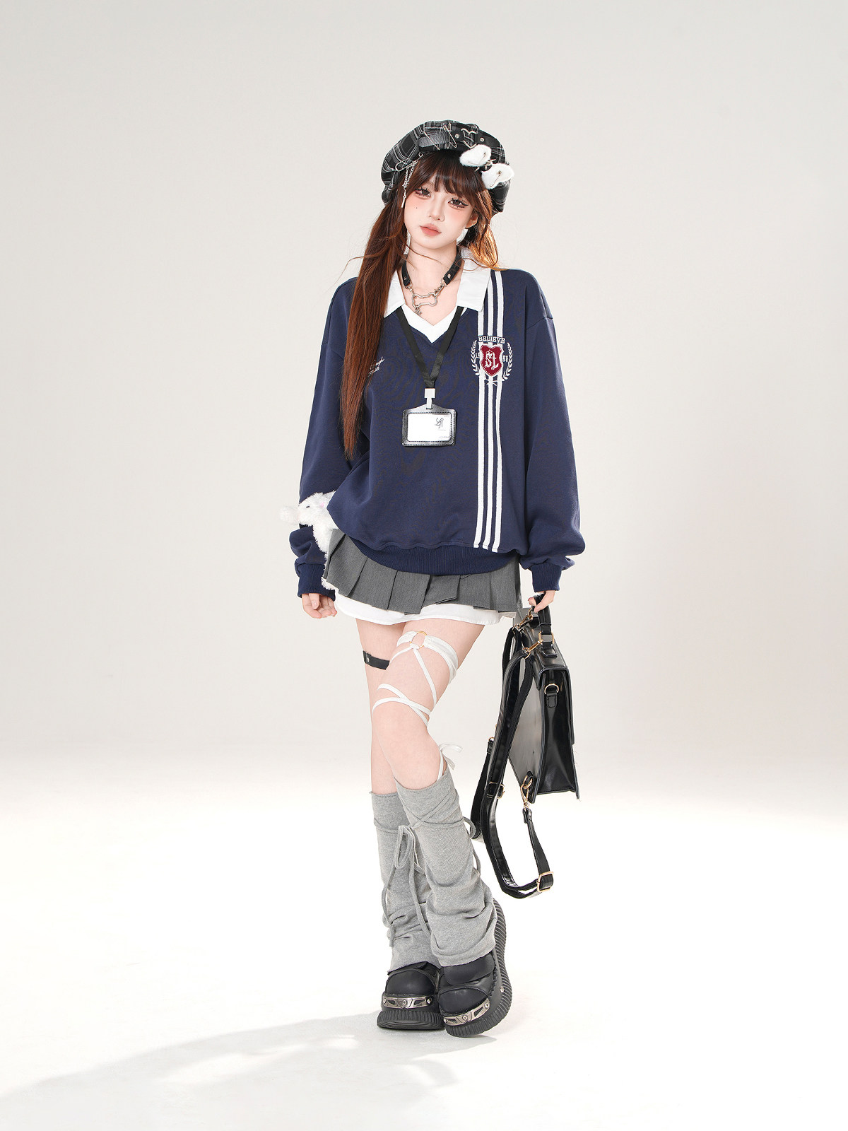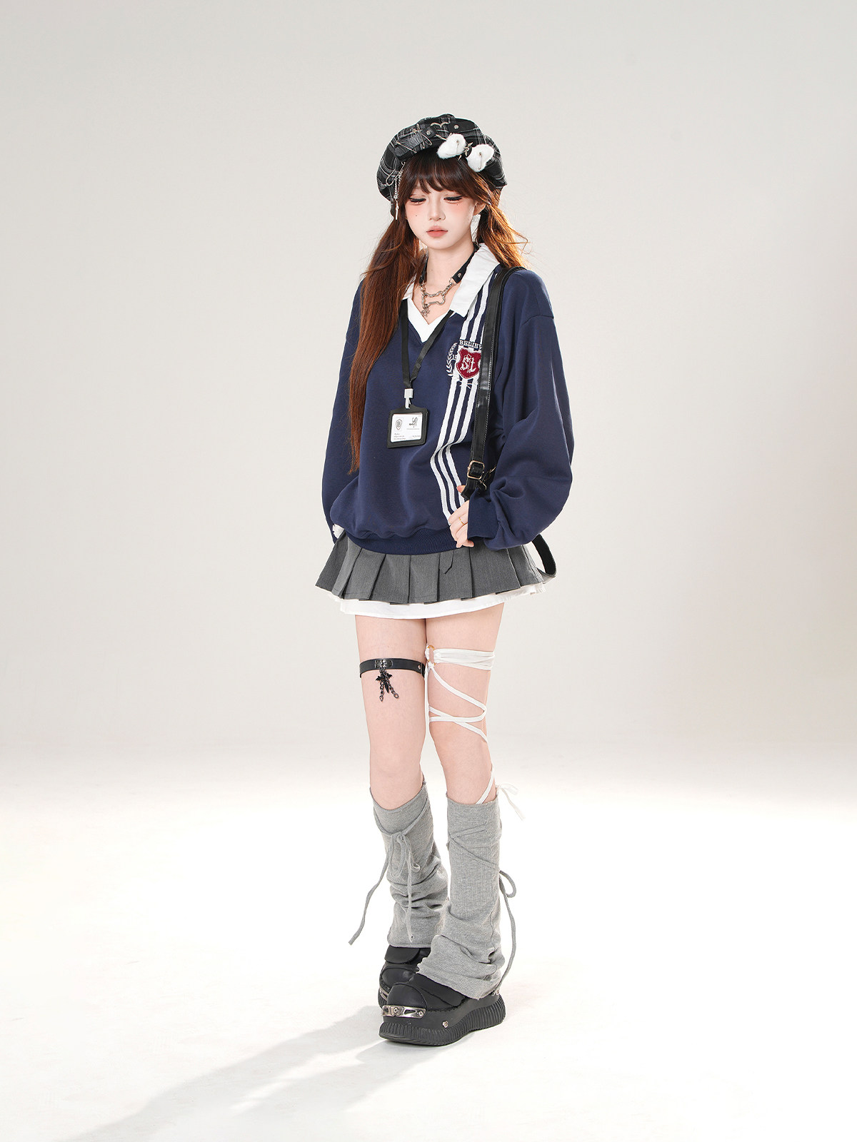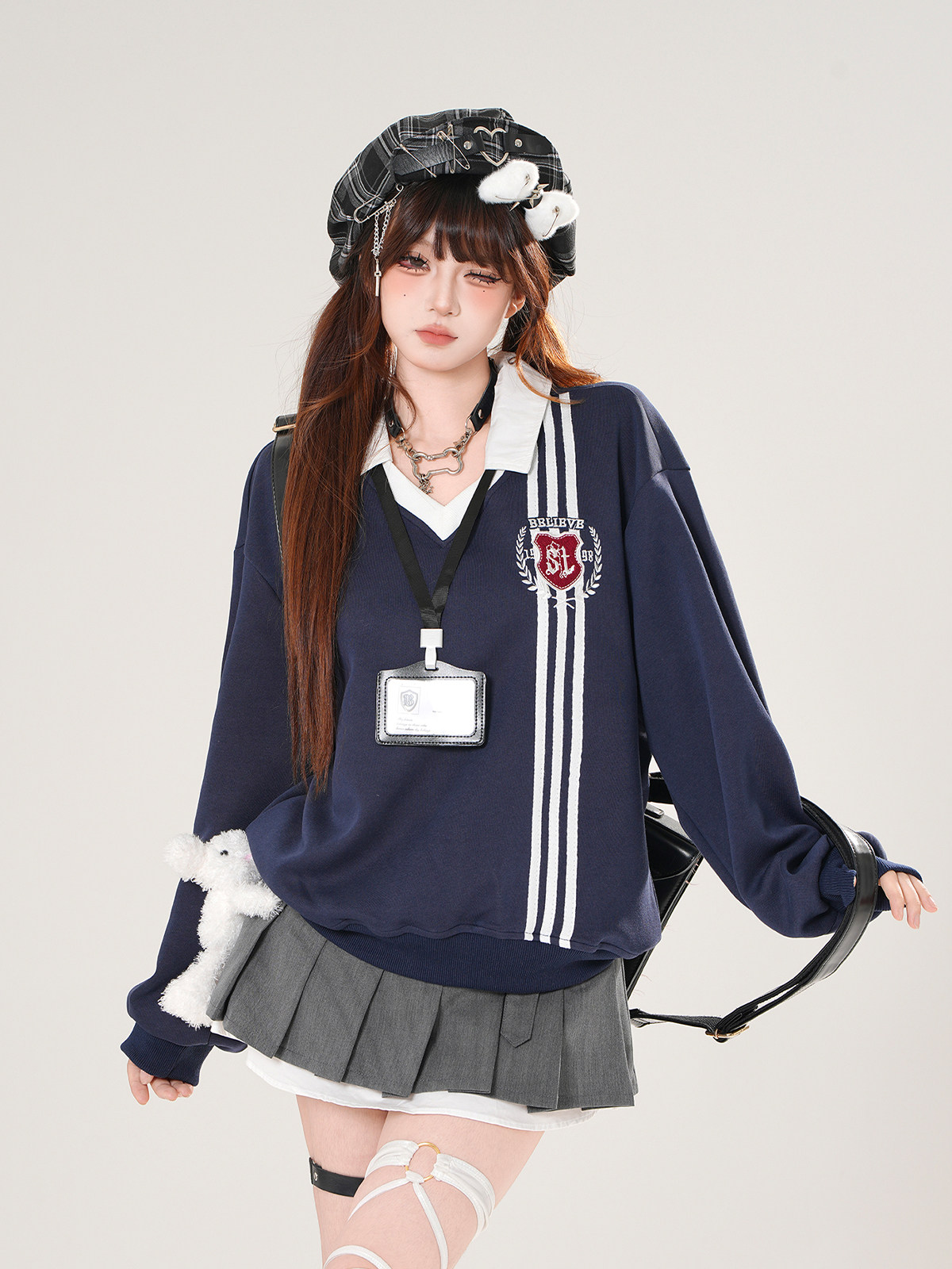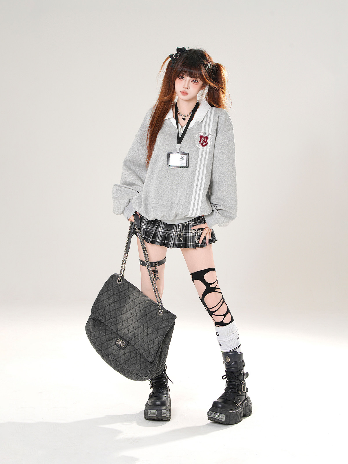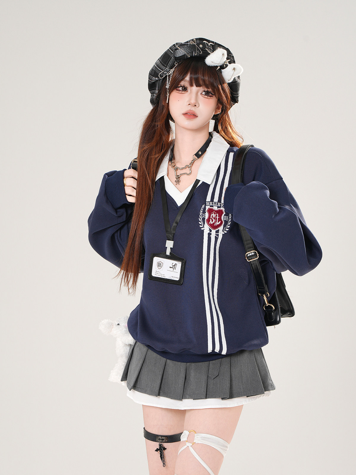 韓女范本 美式學院風衛衣女秋寬松顯瘦polo領運動上衣