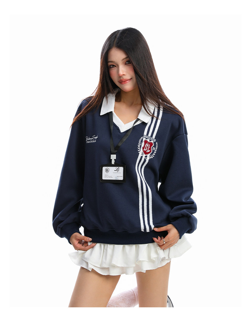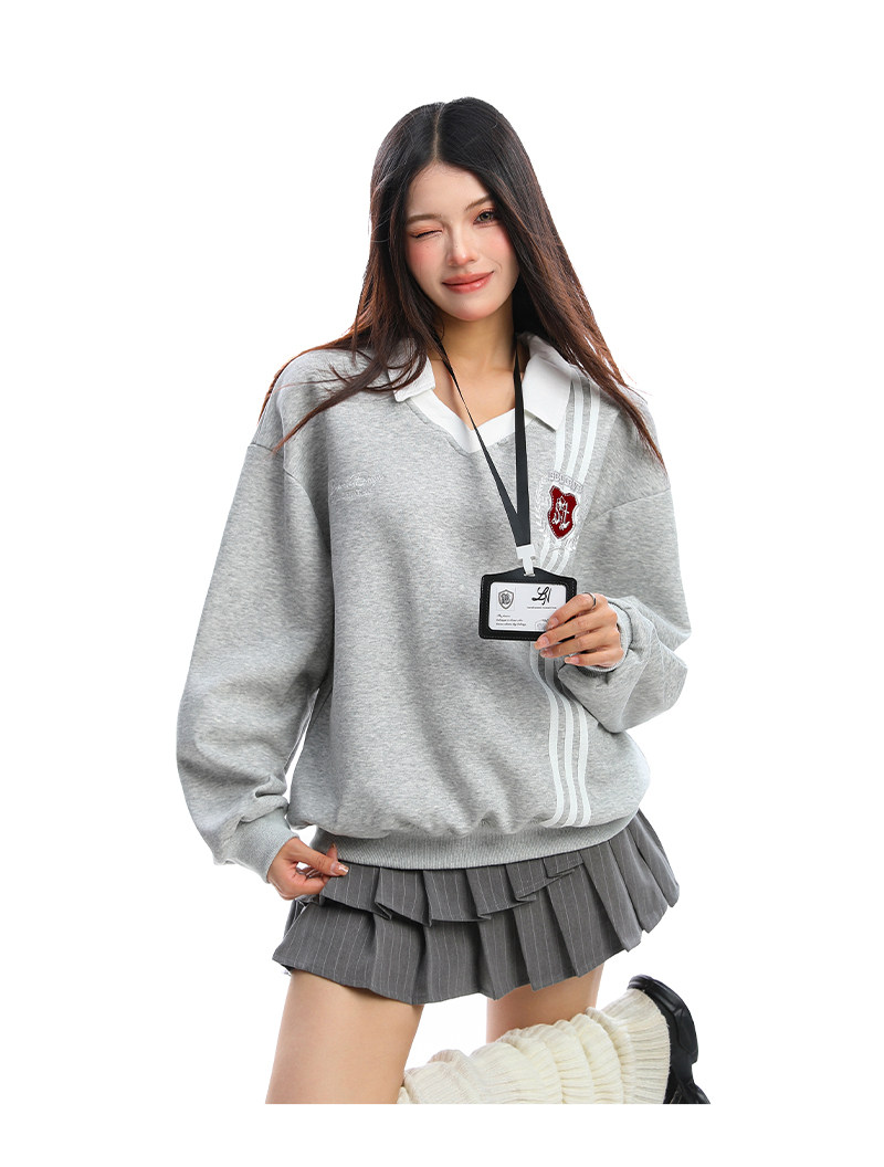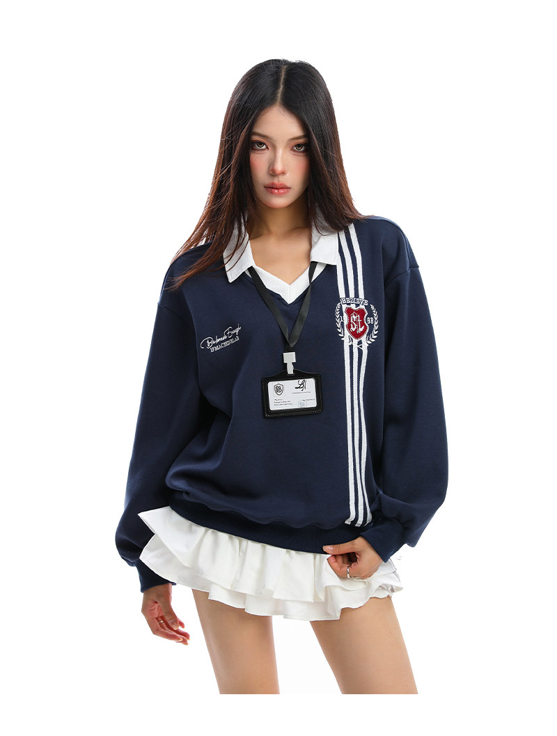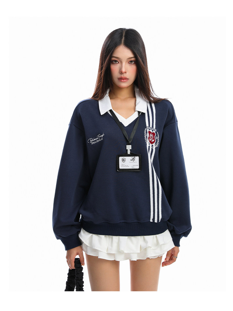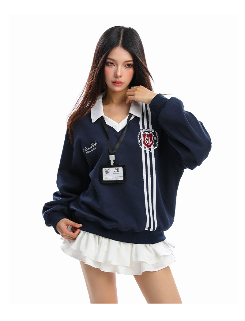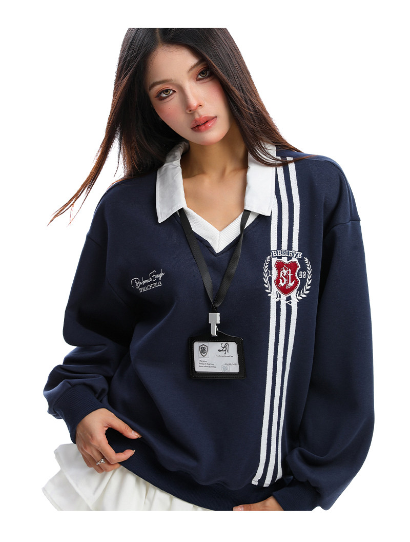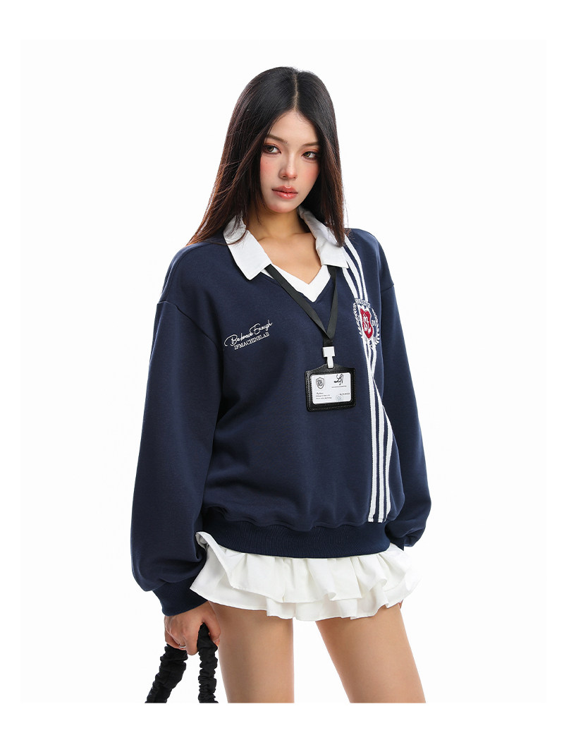 學院風Polo領杠條衛衣女秋冬帶校牌運動風假兩件情侶上衣