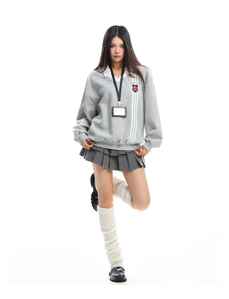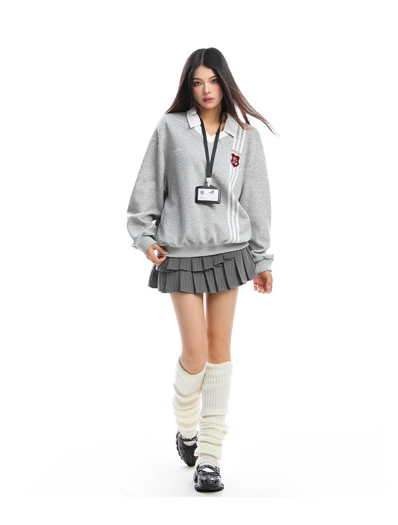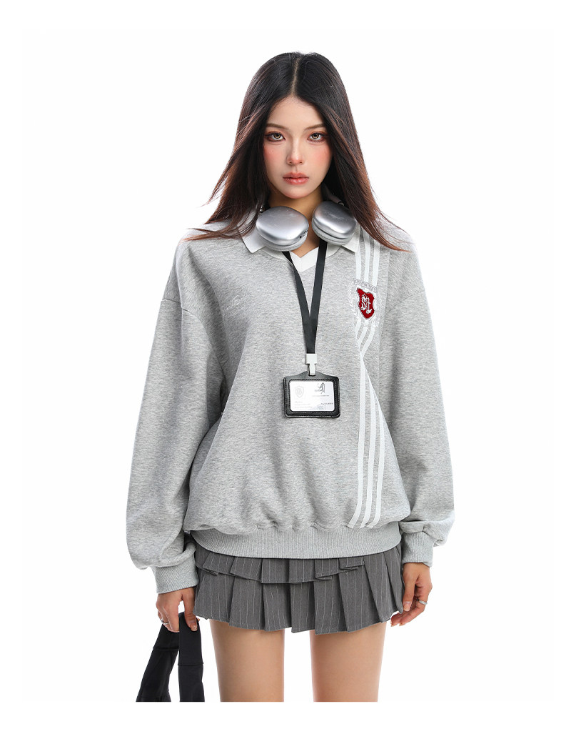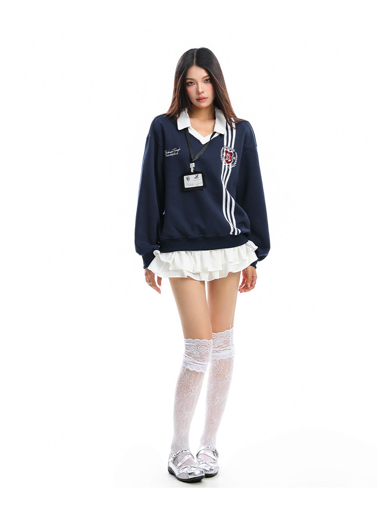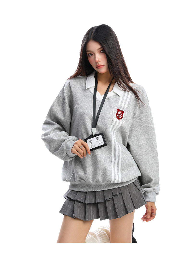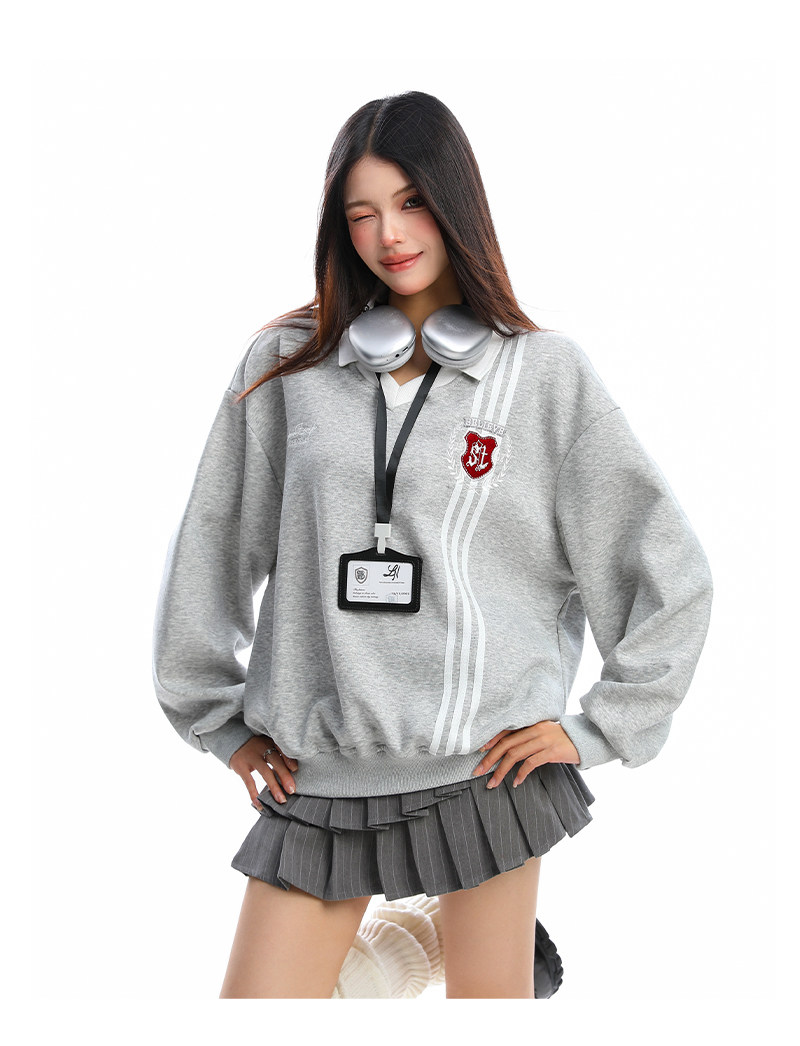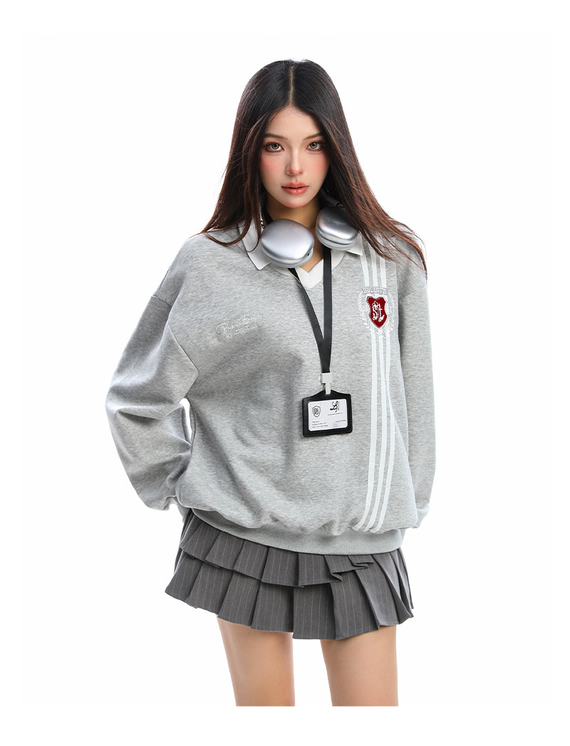 學院風Polo領杠條衛衣女秋冬帶校牌運動風假兩件情侶上衣