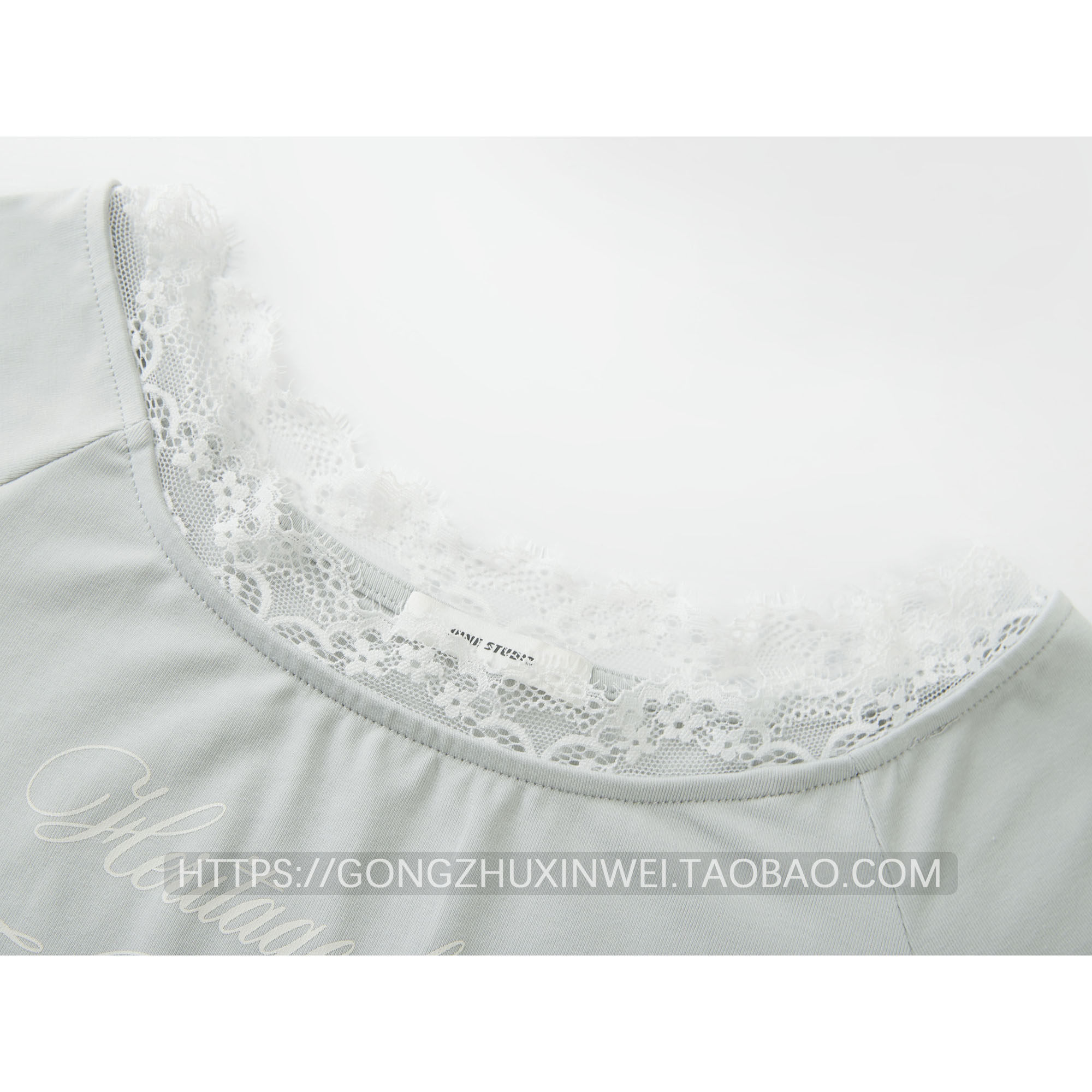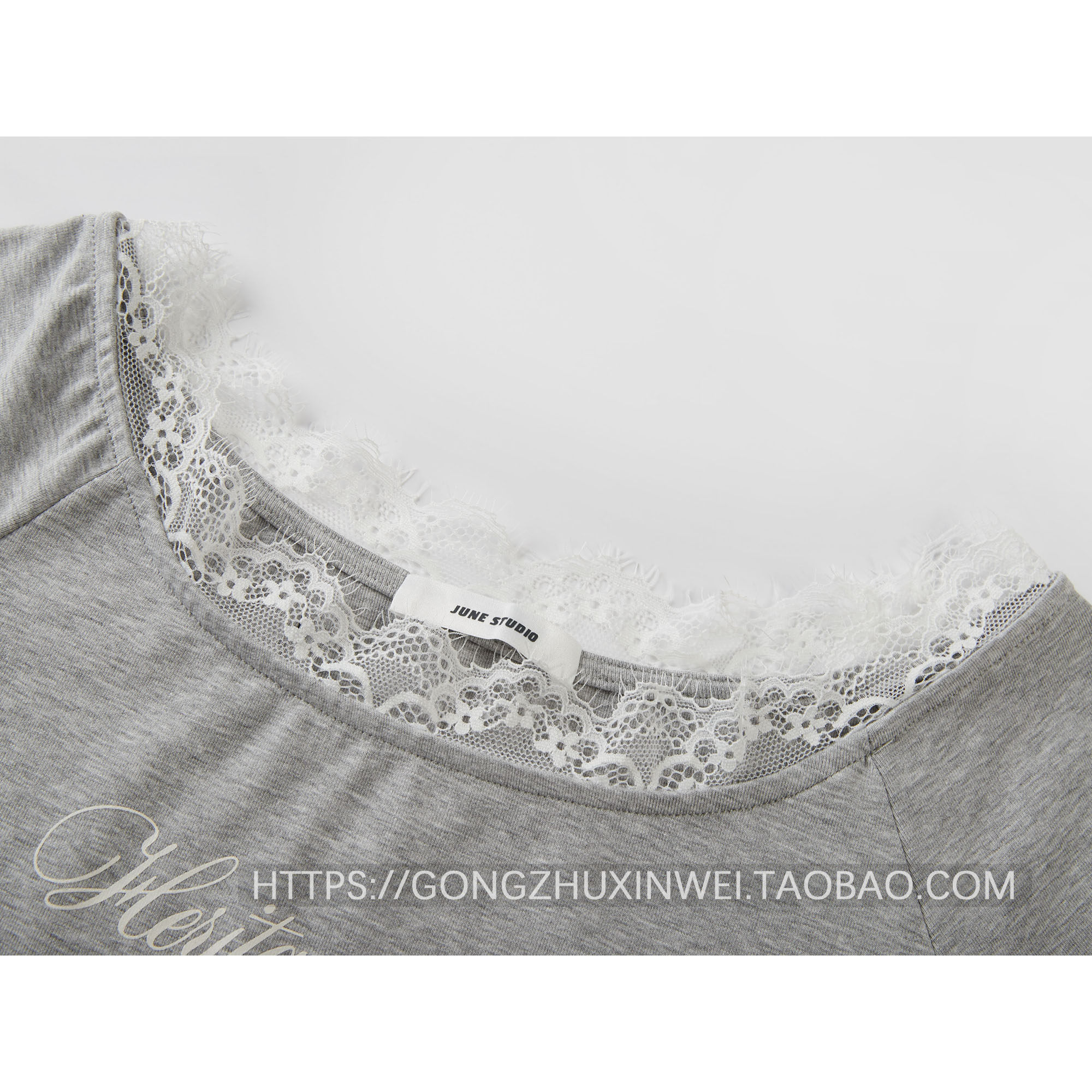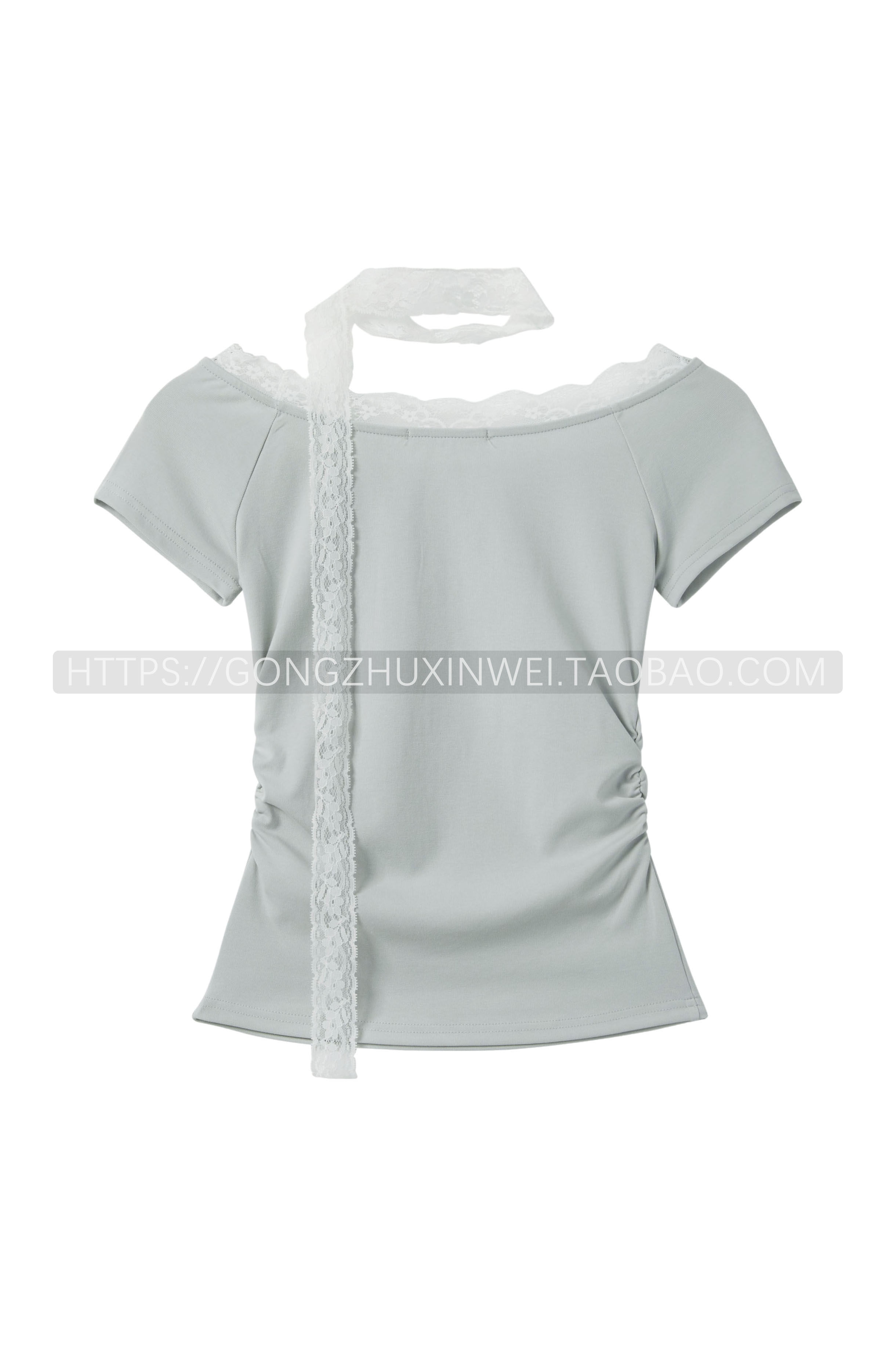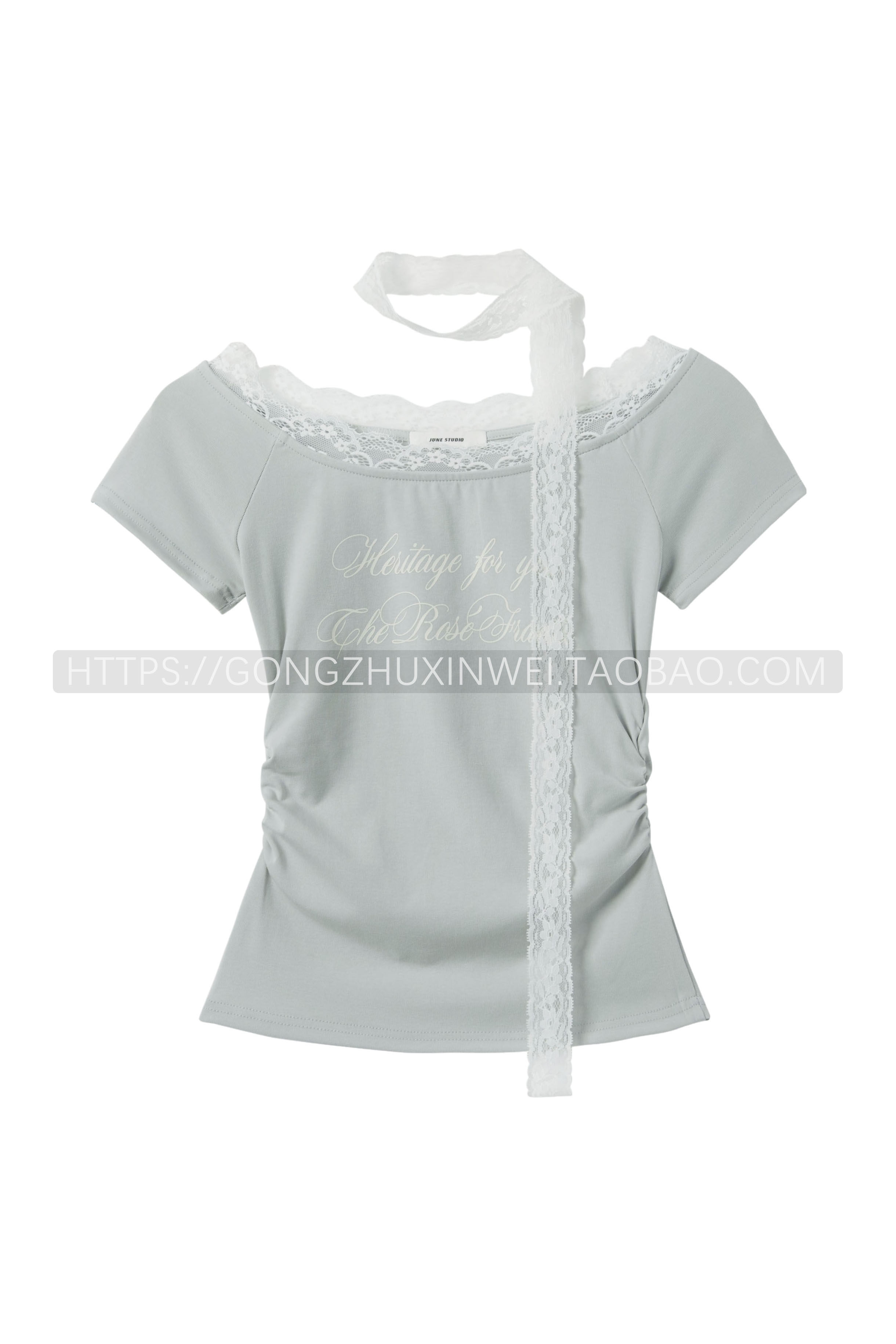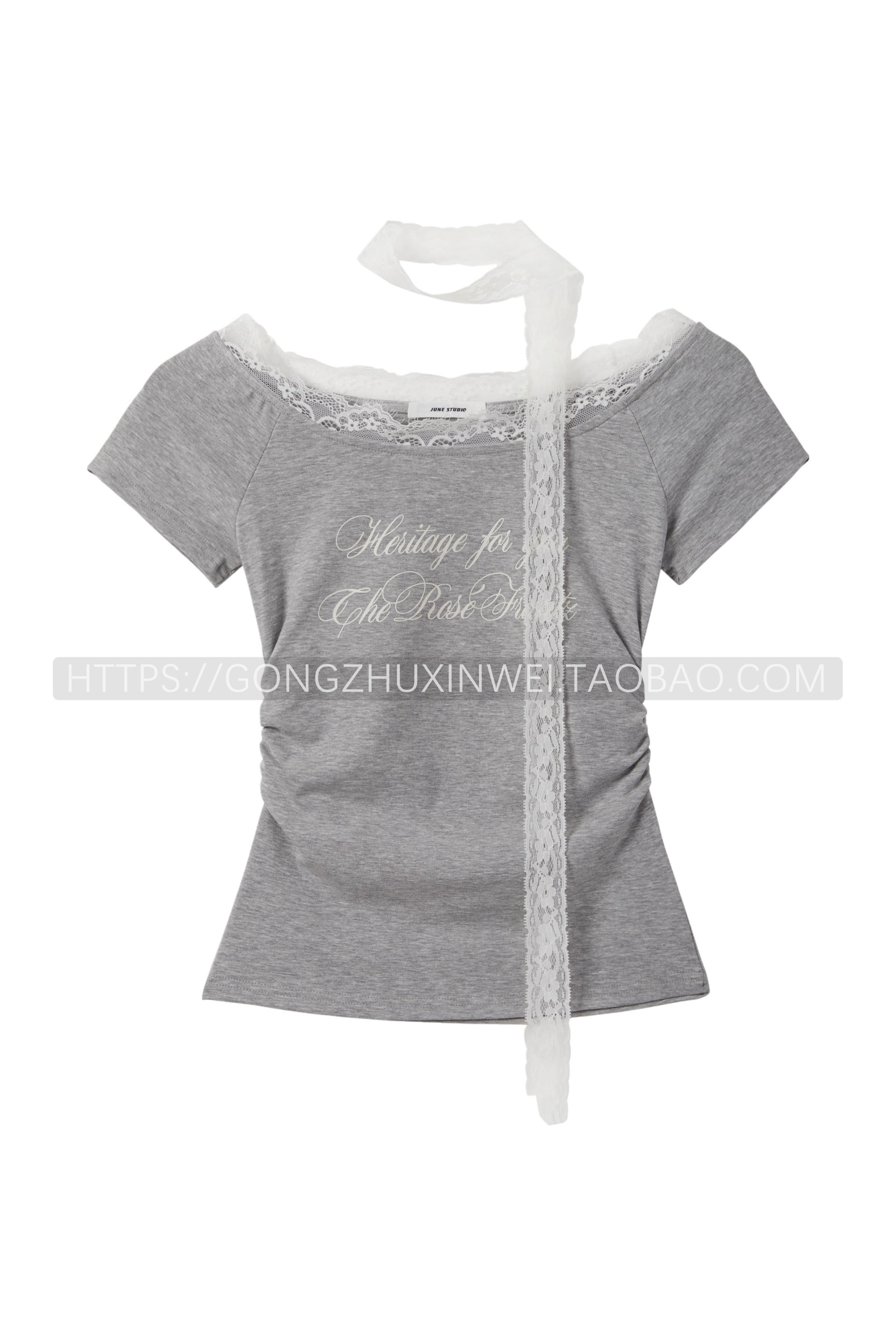 甜辣一字肩蕾絲邊短袖印花T恤女2025春夏新款收腰修身顯瘦上衣