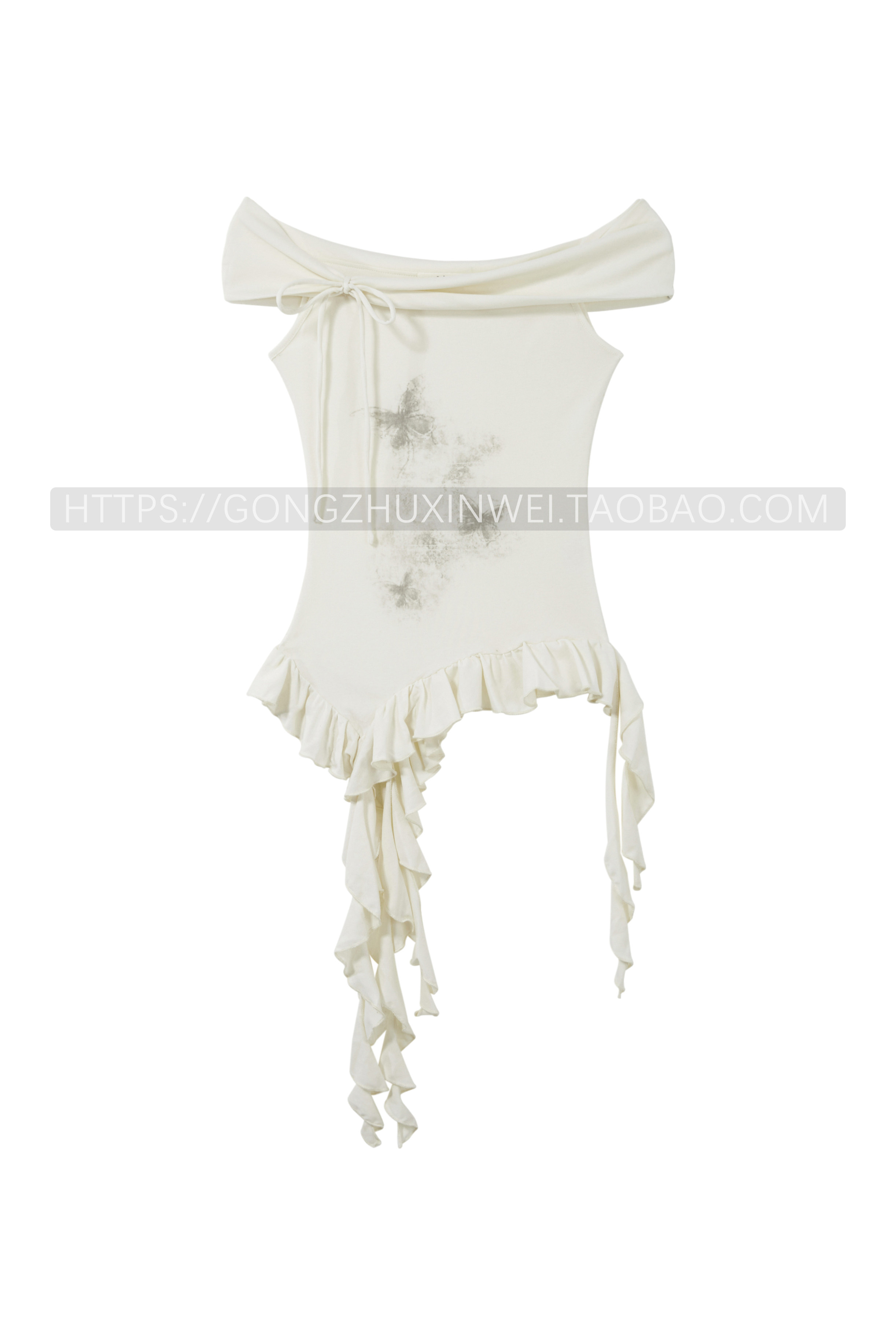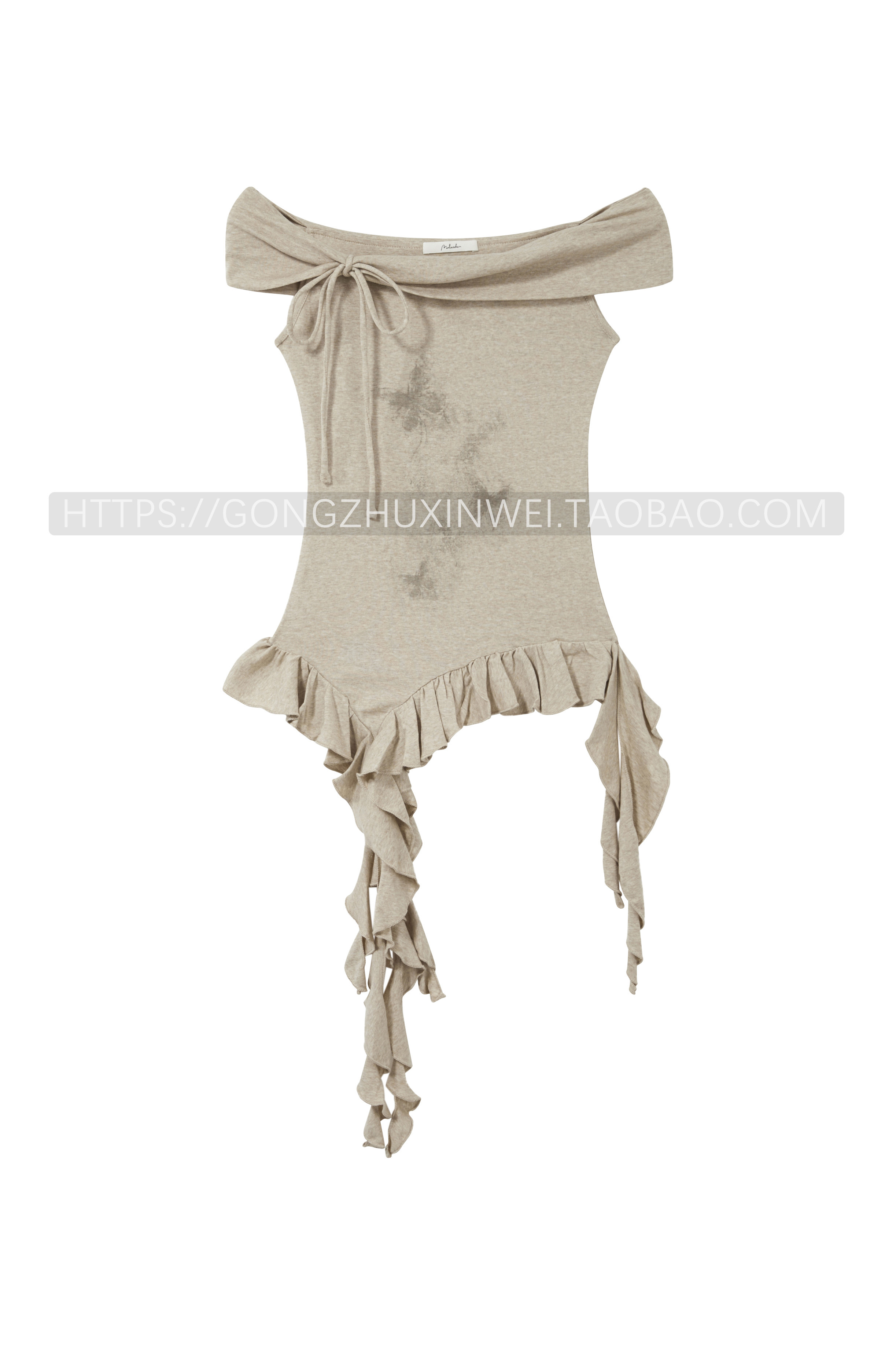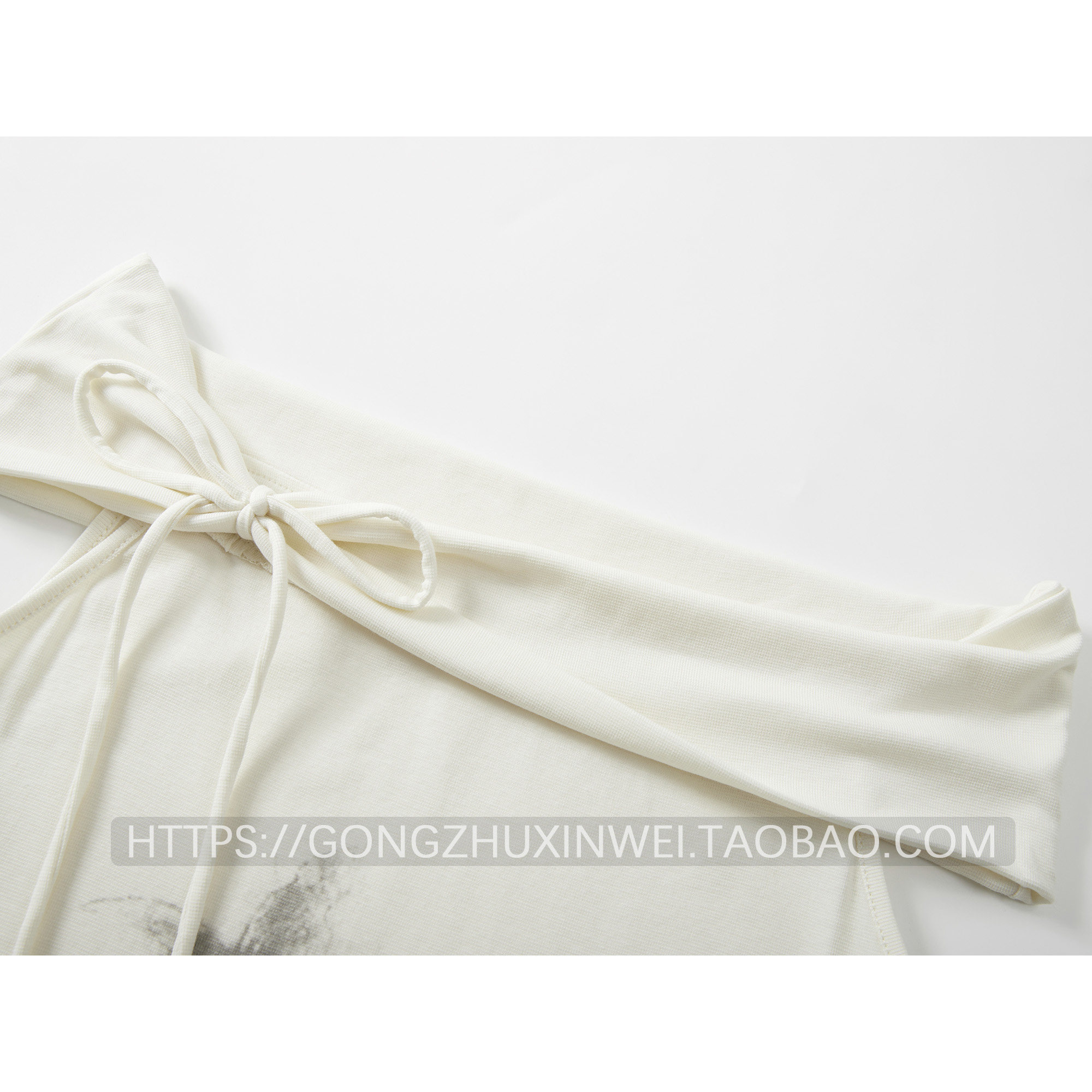 系帶蝴蝶結一字肩短袖T恤女2025春夏新款休閑修身飄帶印花上衣