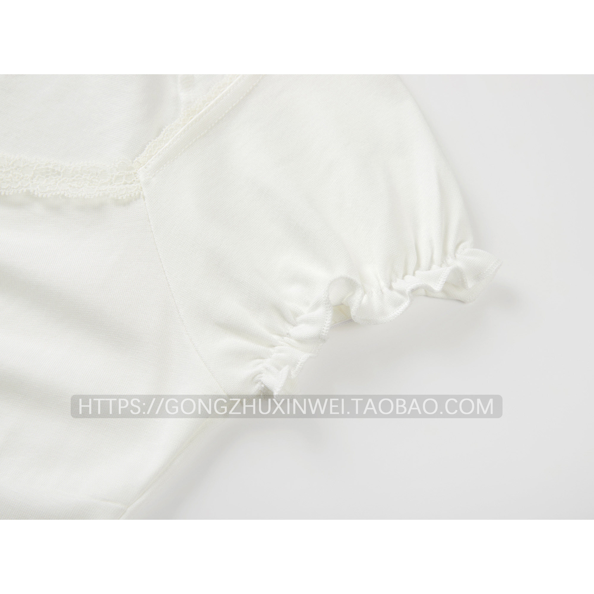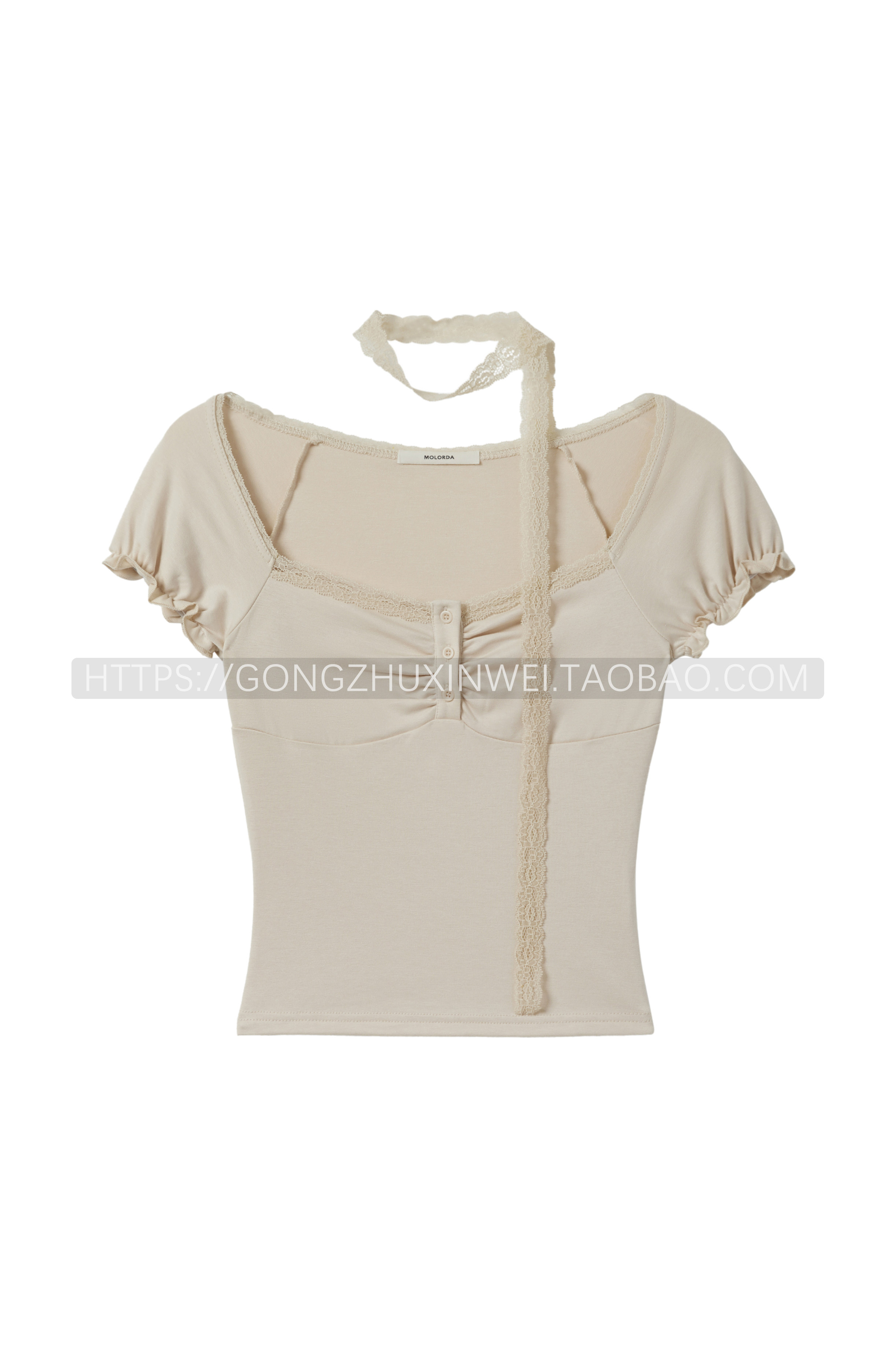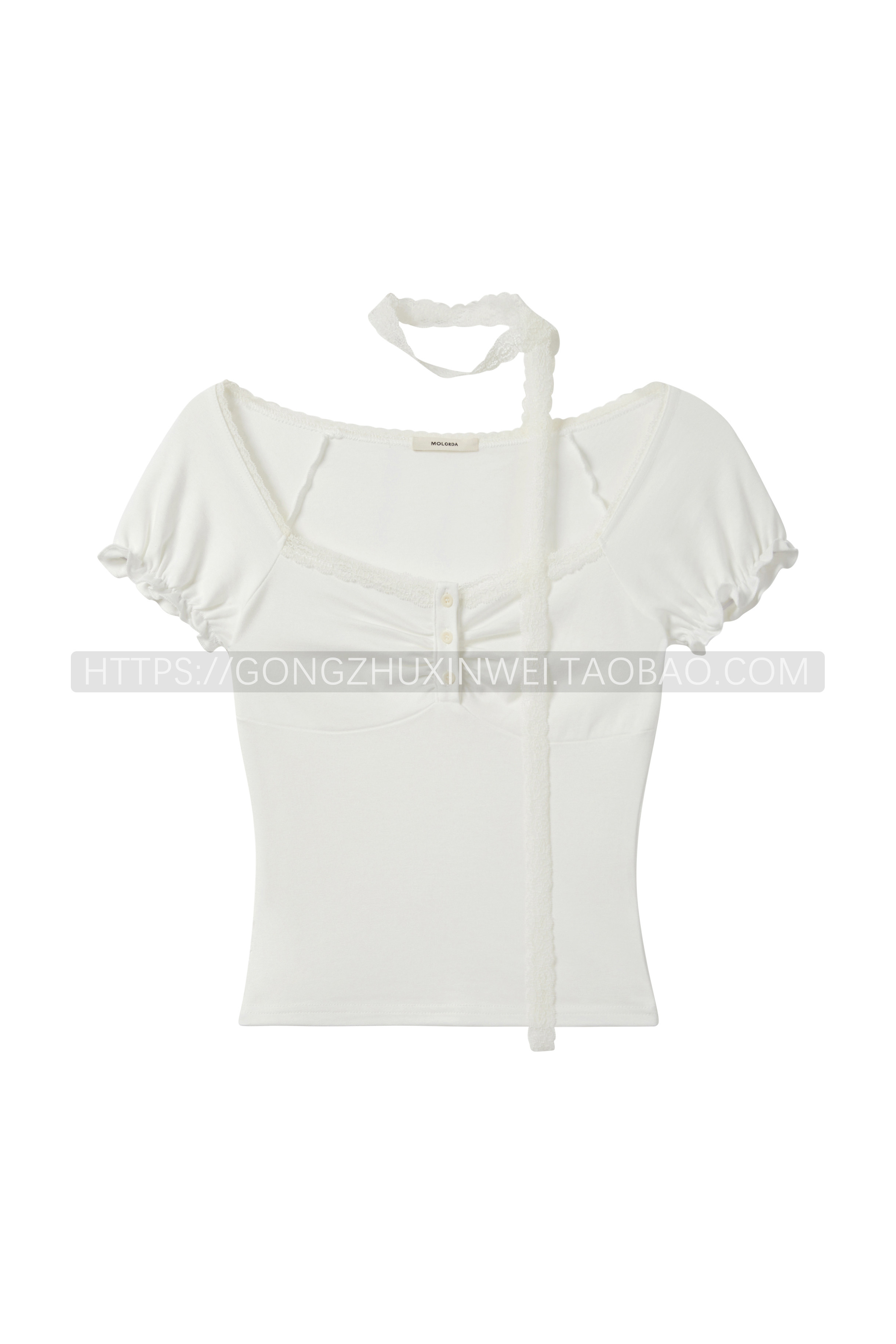 純欲甜辣蕾絲邊方領短袖T恤女2025夏季新款短款褶皺收腰修身上衣
