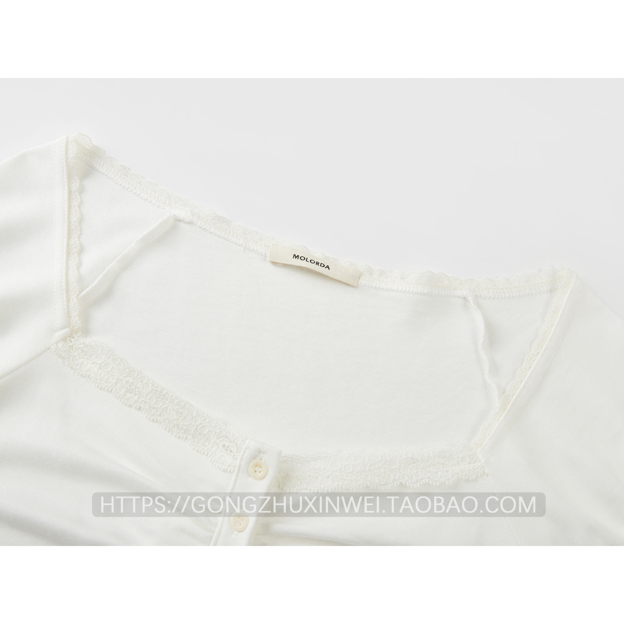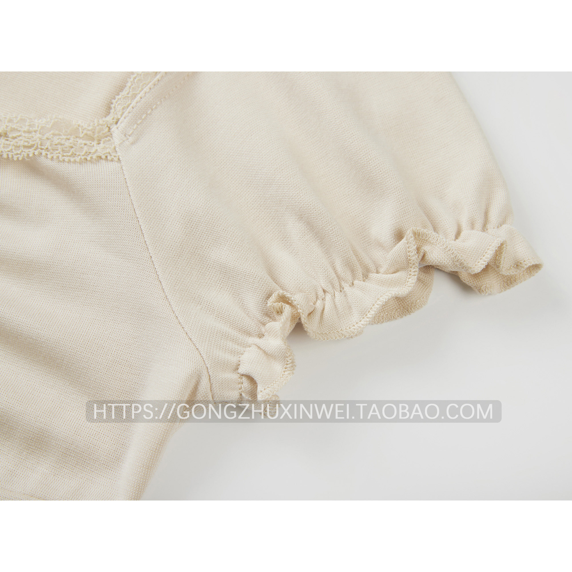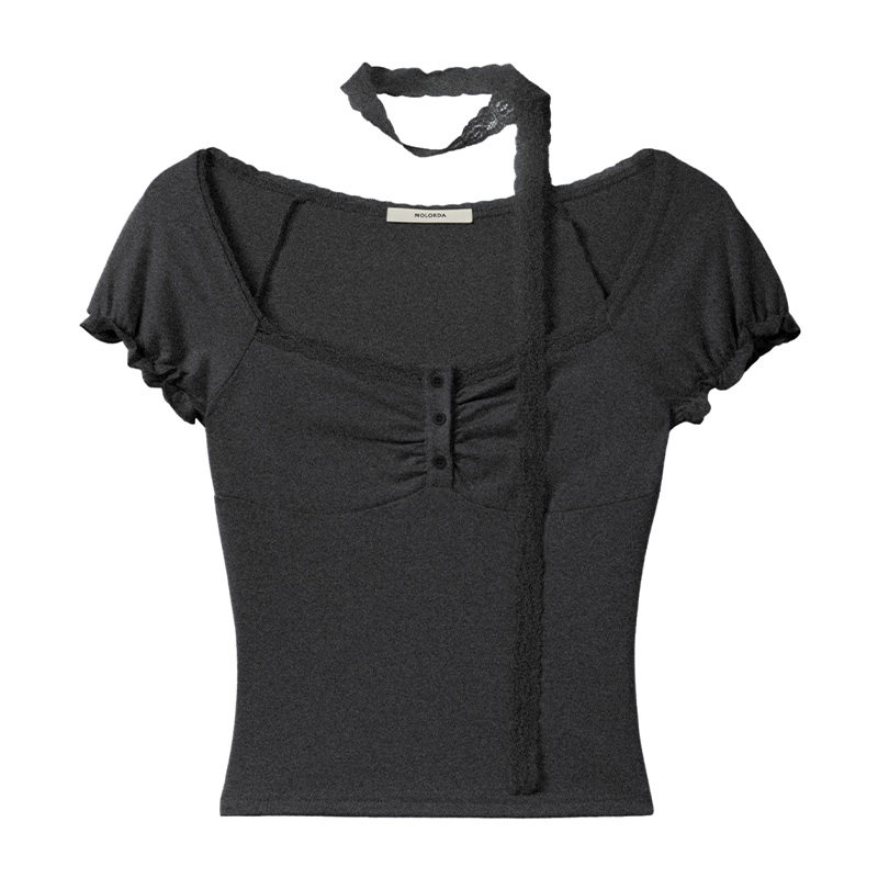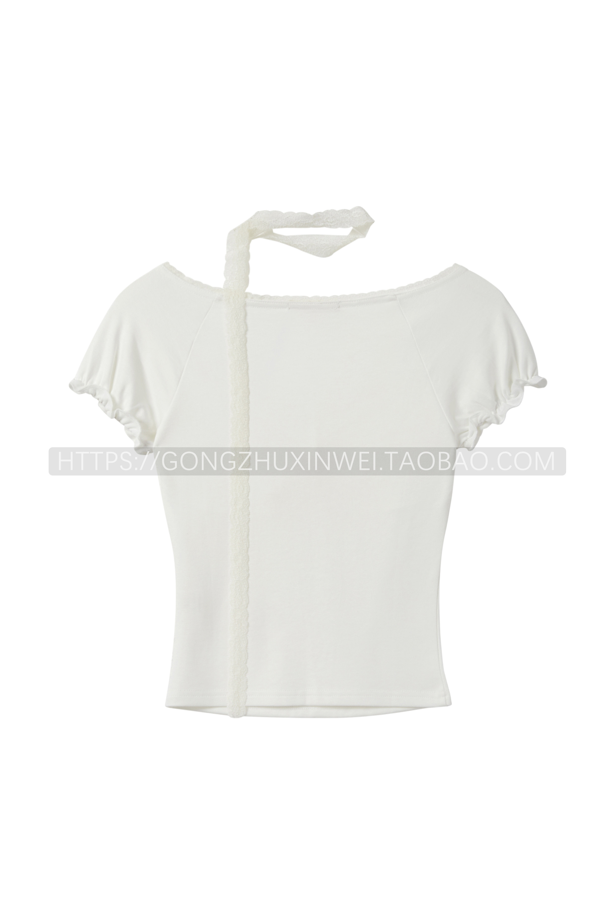 純欲甜辣蕾絲邊方領短袖T恤女2025夏季新款短款褶皺收腰修身上衣