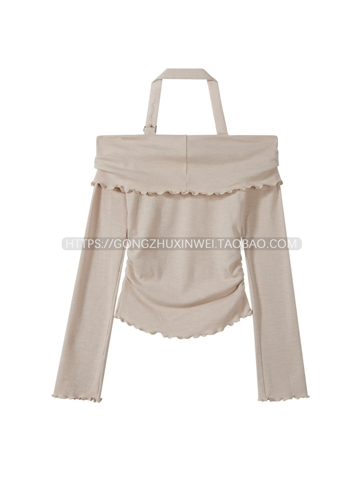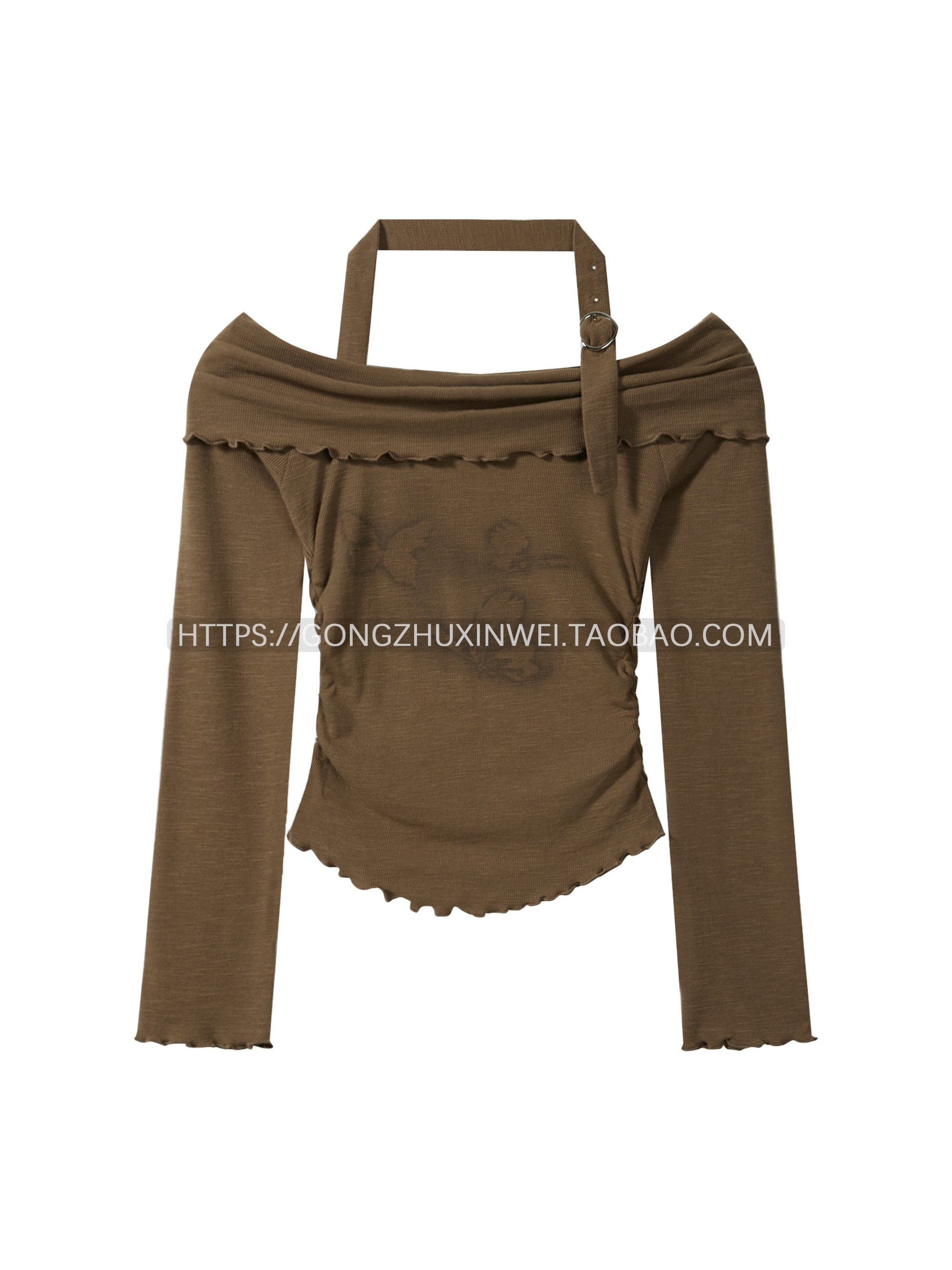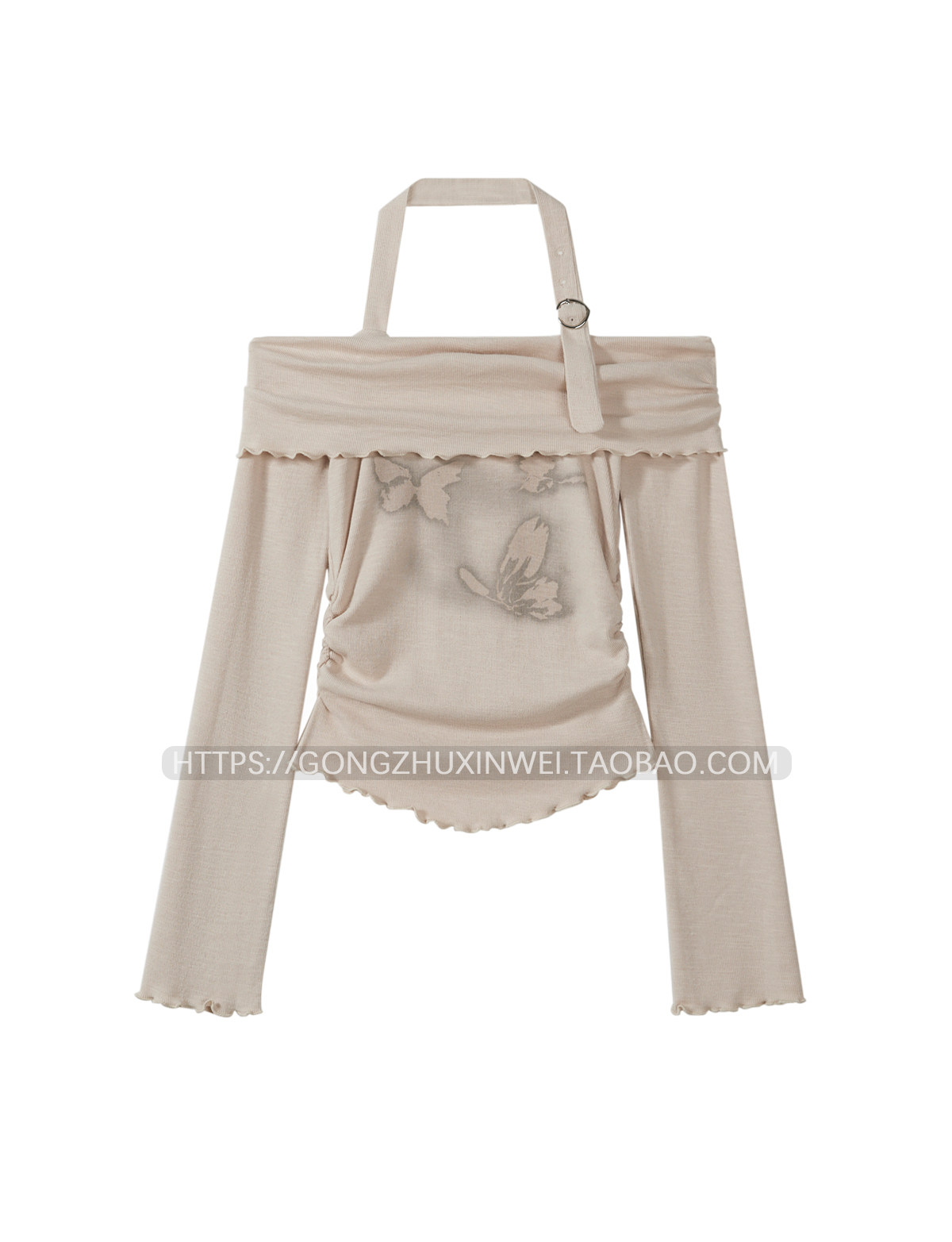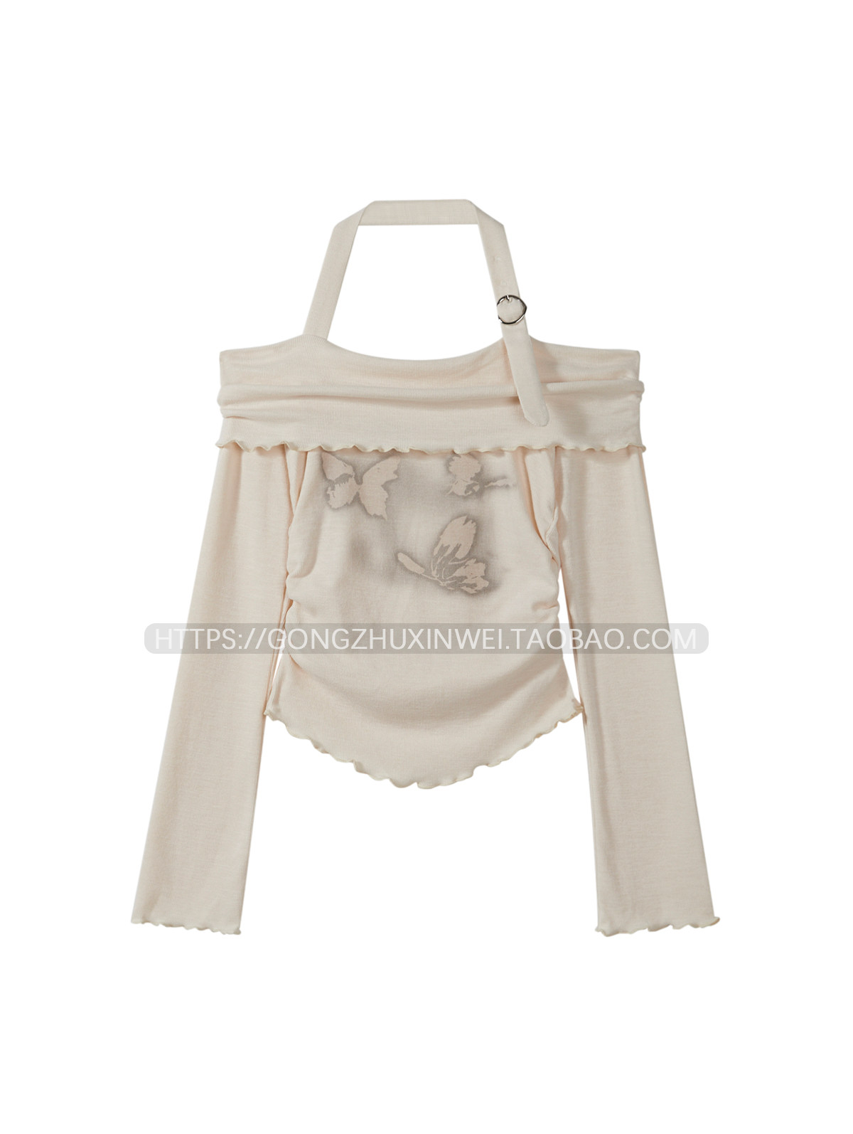 甜辣妹一字肩掛脖木耳邊長袖T恤女2025早秋季新款蝴蝶印花上衣
