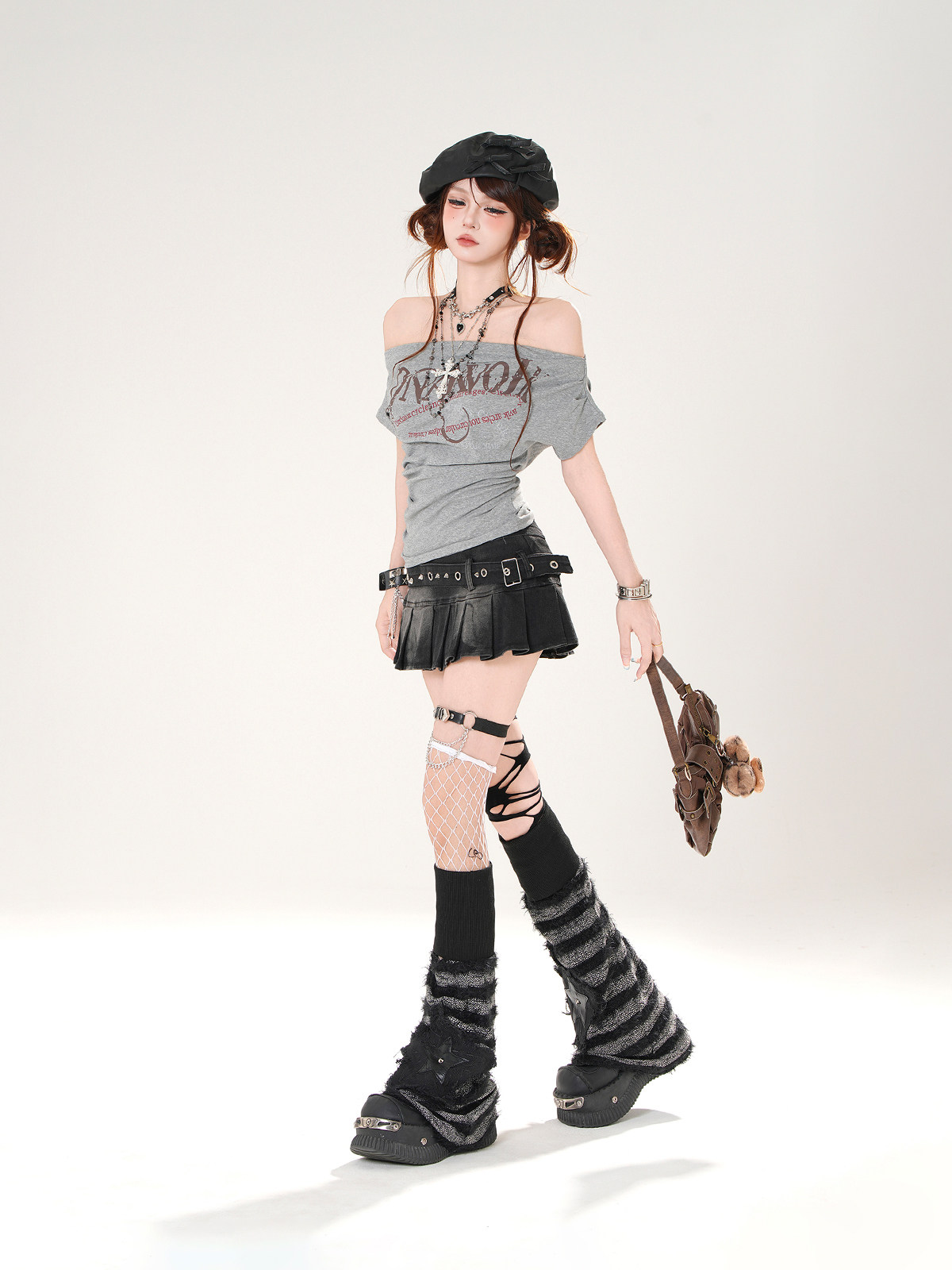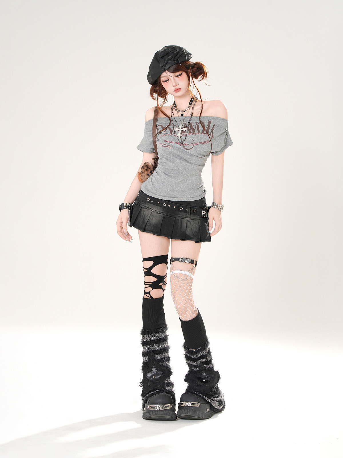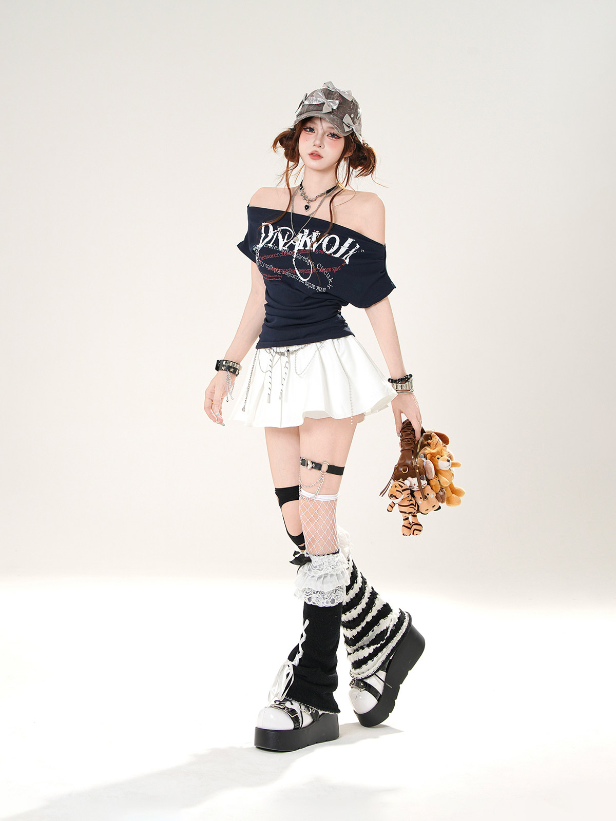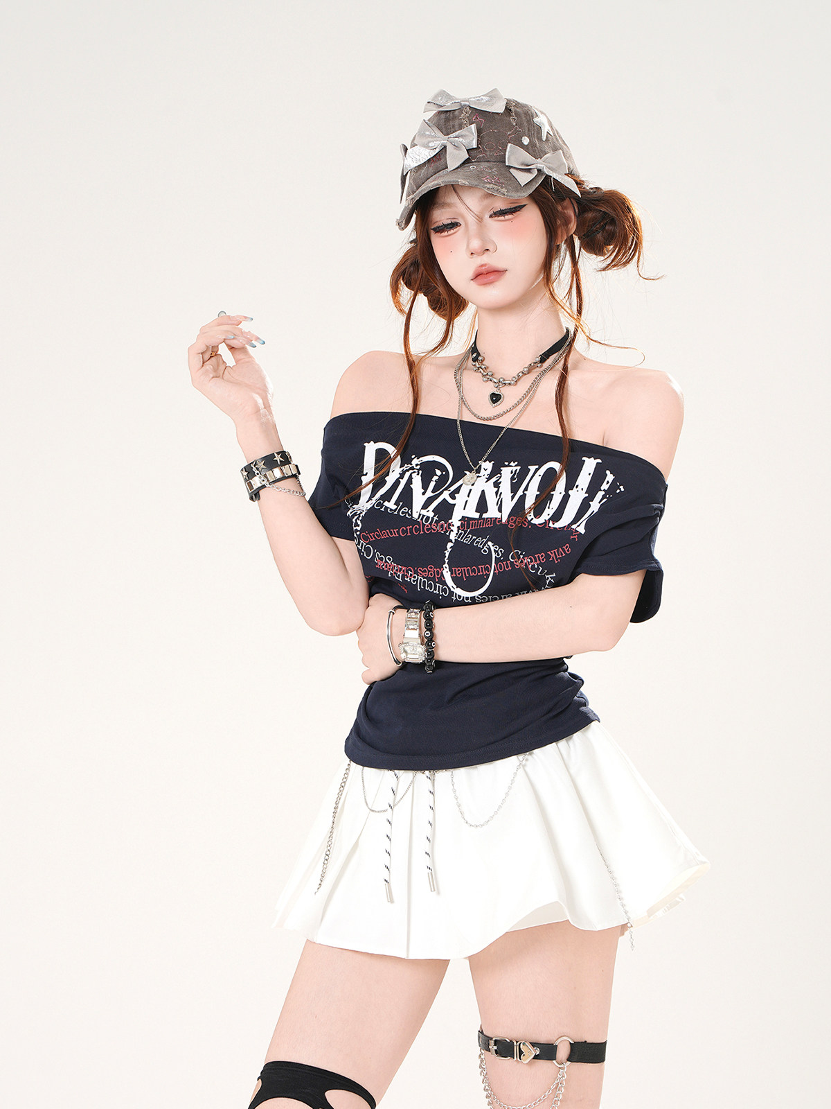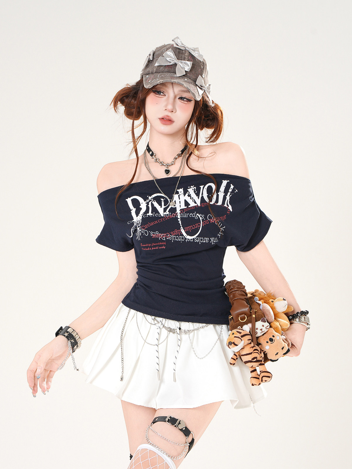 街機玩傢 一字肩美式辣妹短袖T恤女夏季收腰顯瘦上衣
