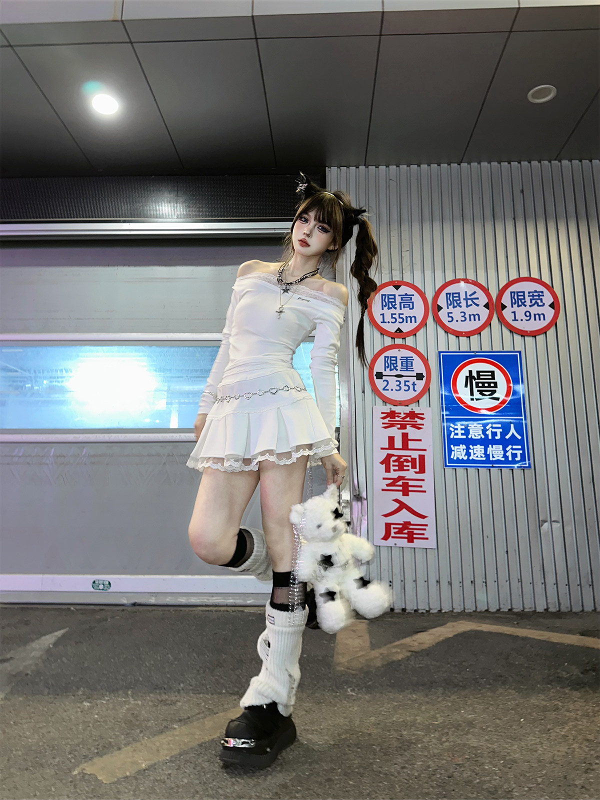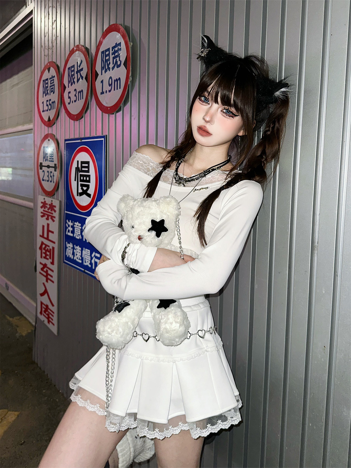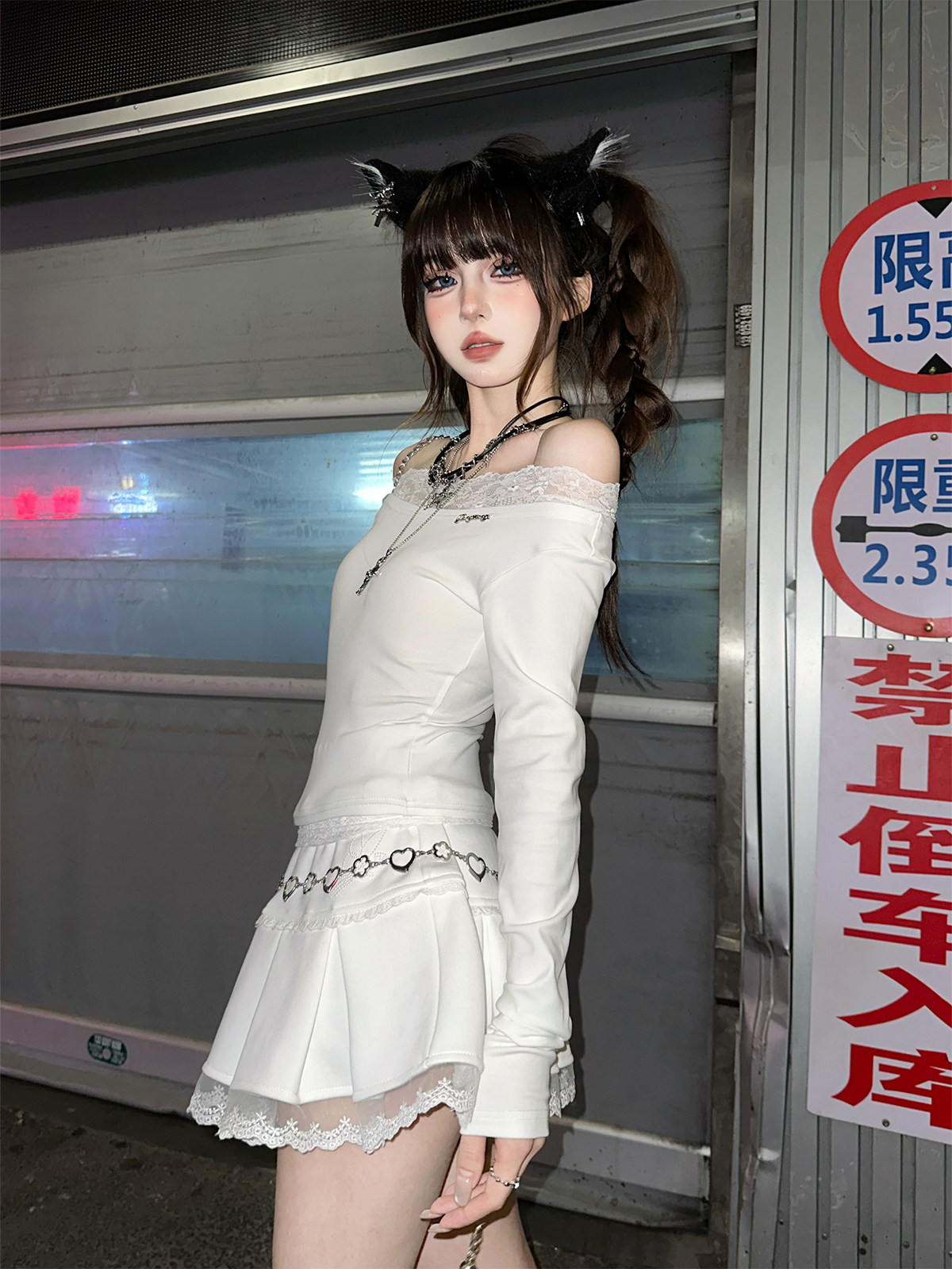危險遊戲 一字肩辣妹蕾絲拼接T恤女春夏長袖顯瘦上衣