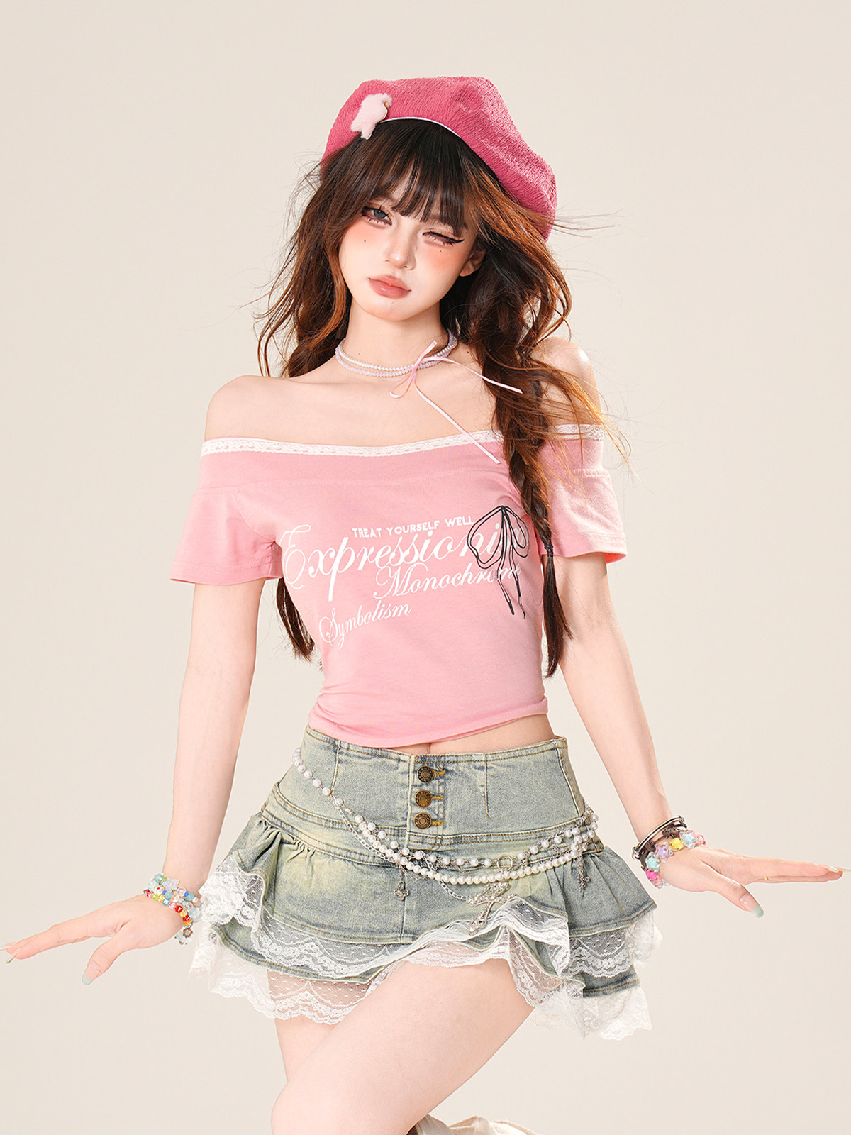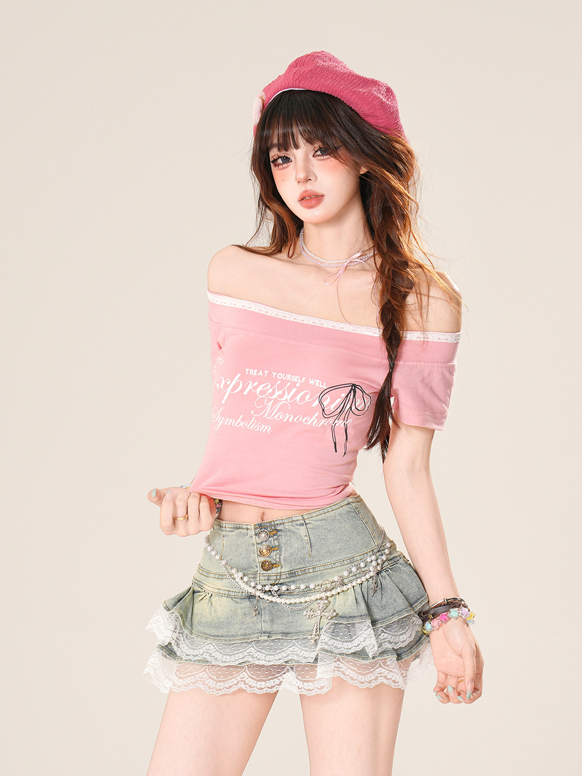 東京氛圍 一字肩辣妹蕾絲短袖T恤女夏修身顯瘦短款上衣