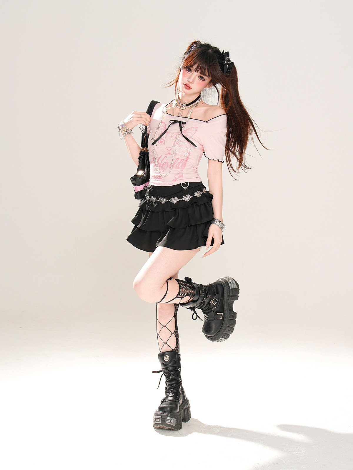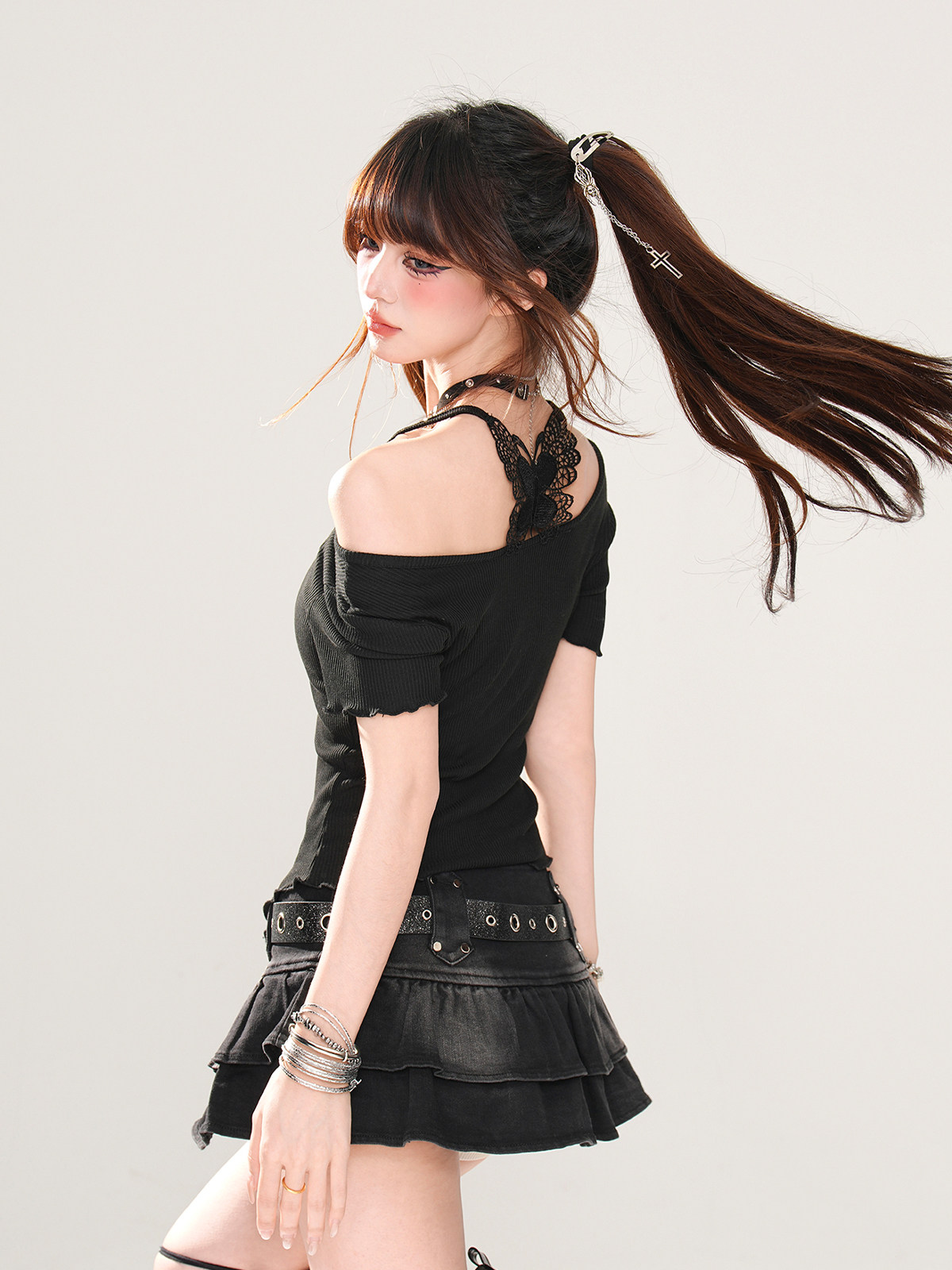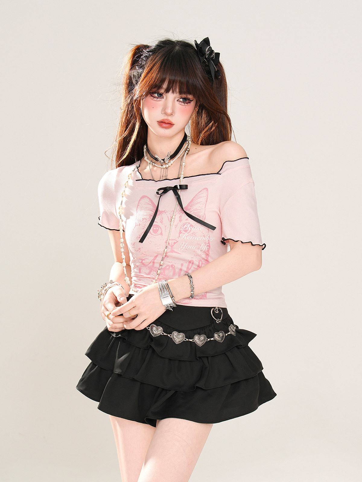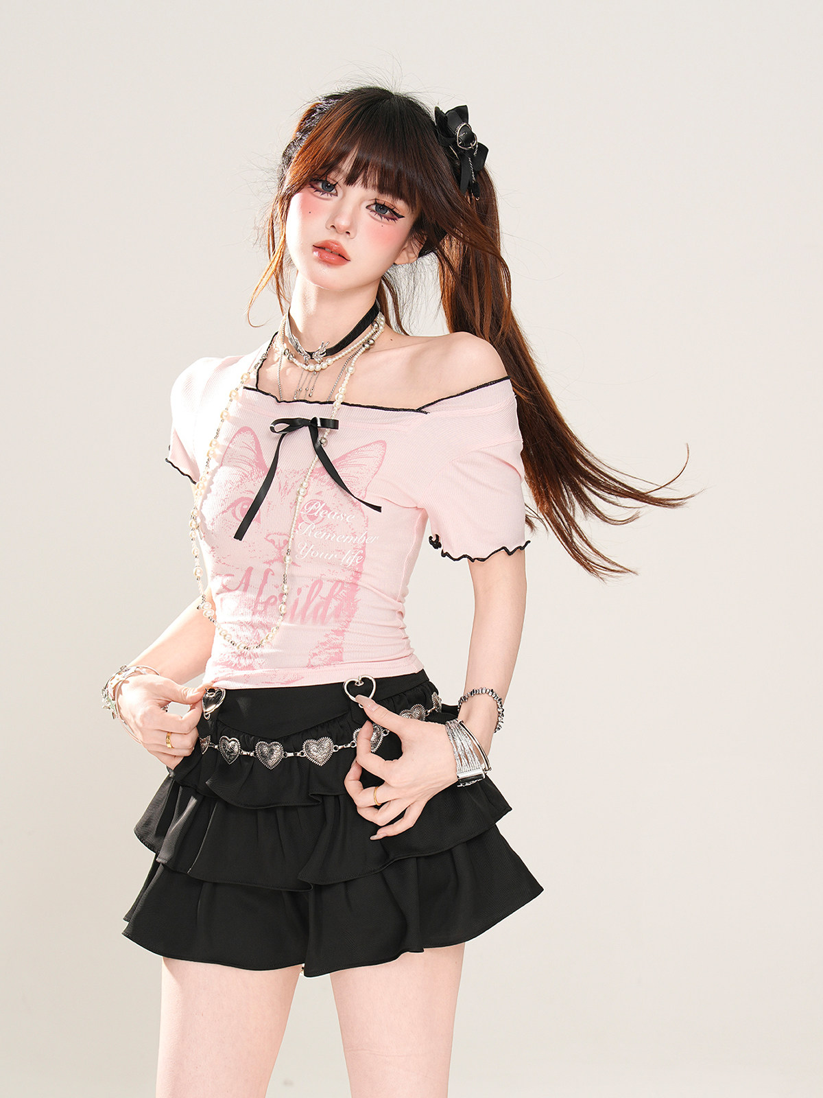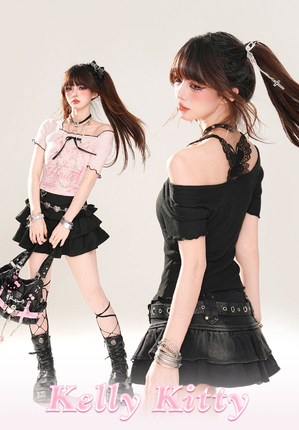黑貓教主 正肩短袖黑色辣妹T恤女夏季修身短款顯瘦上衣