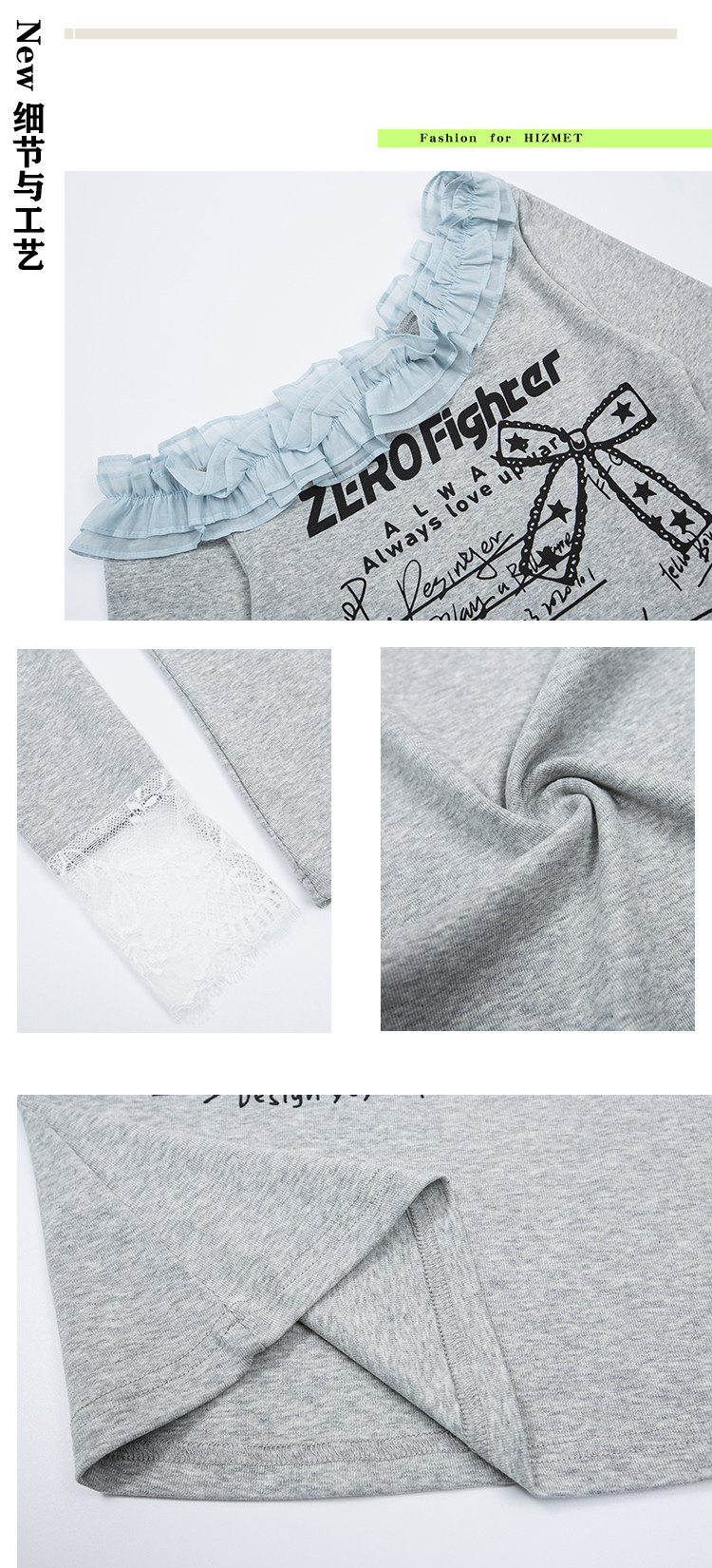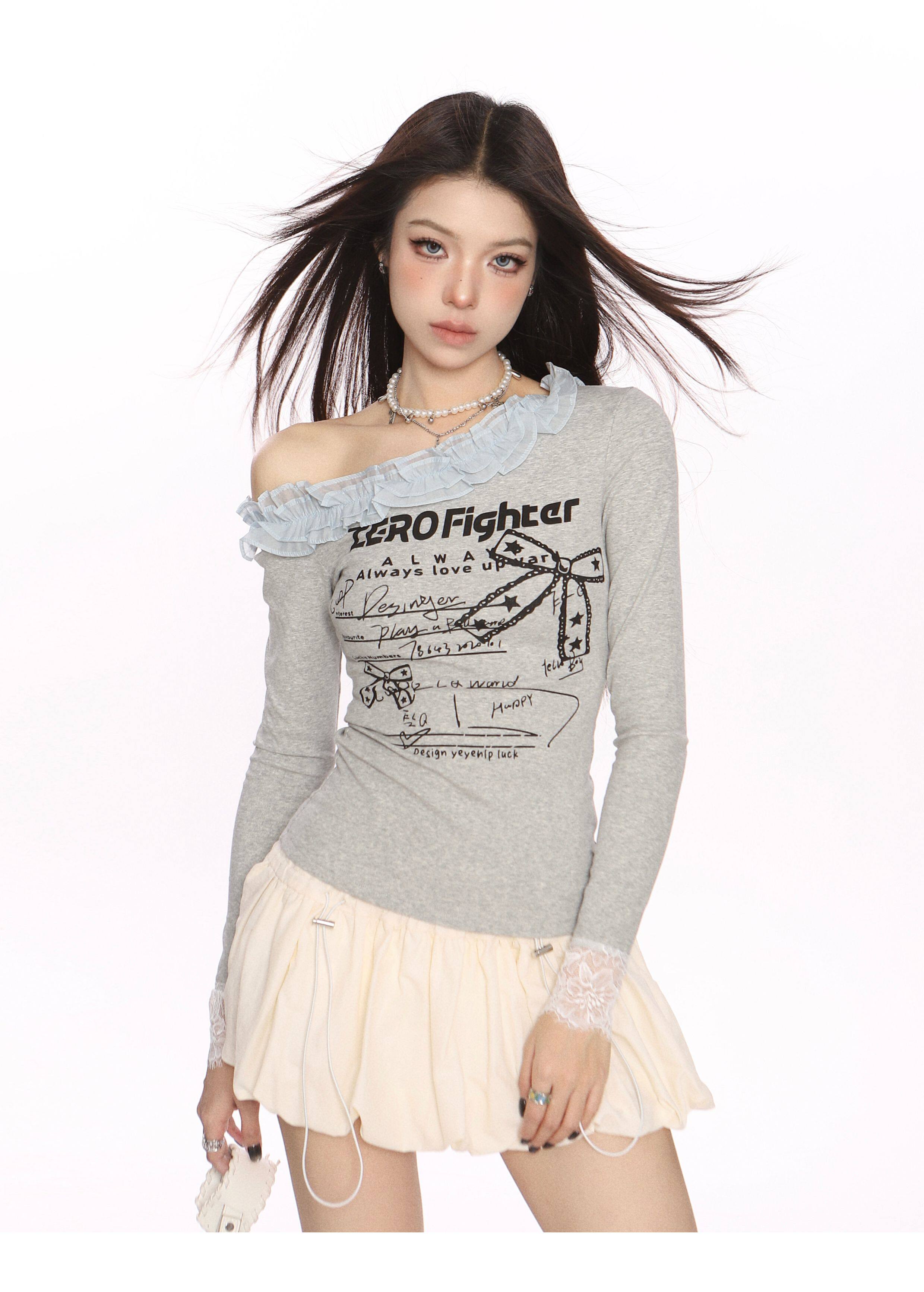 純欲甜美蕾絲邊斜肩長袖T恤女春秋顯瘦修身精致內搭上衣潮