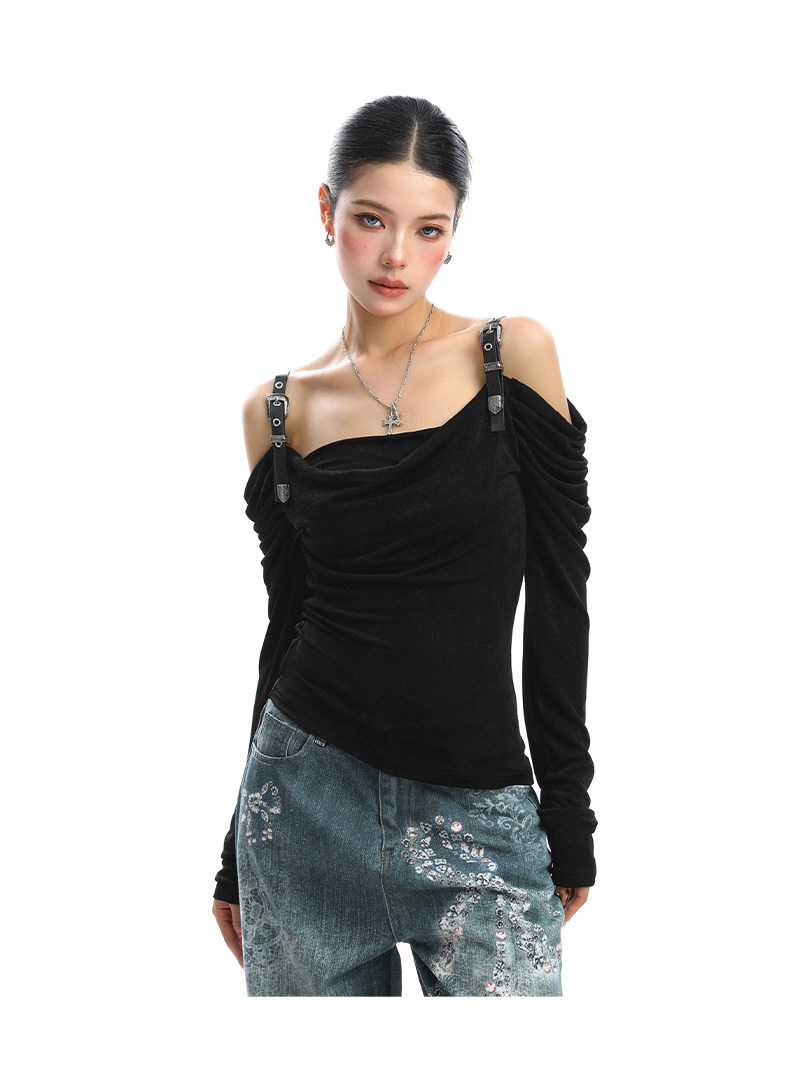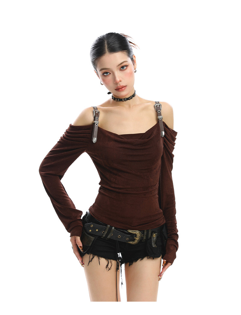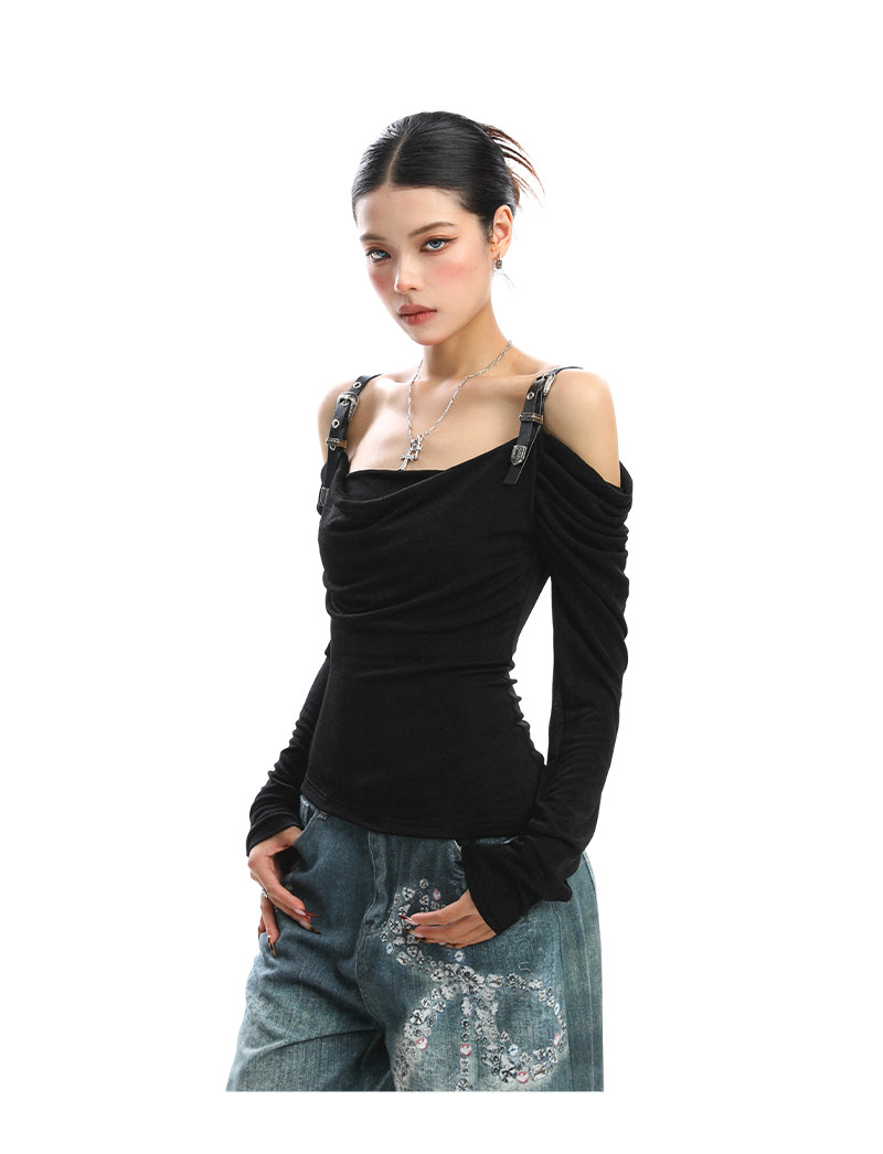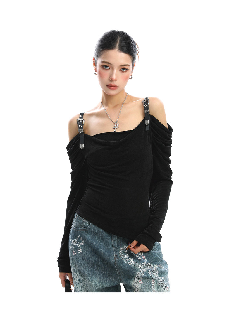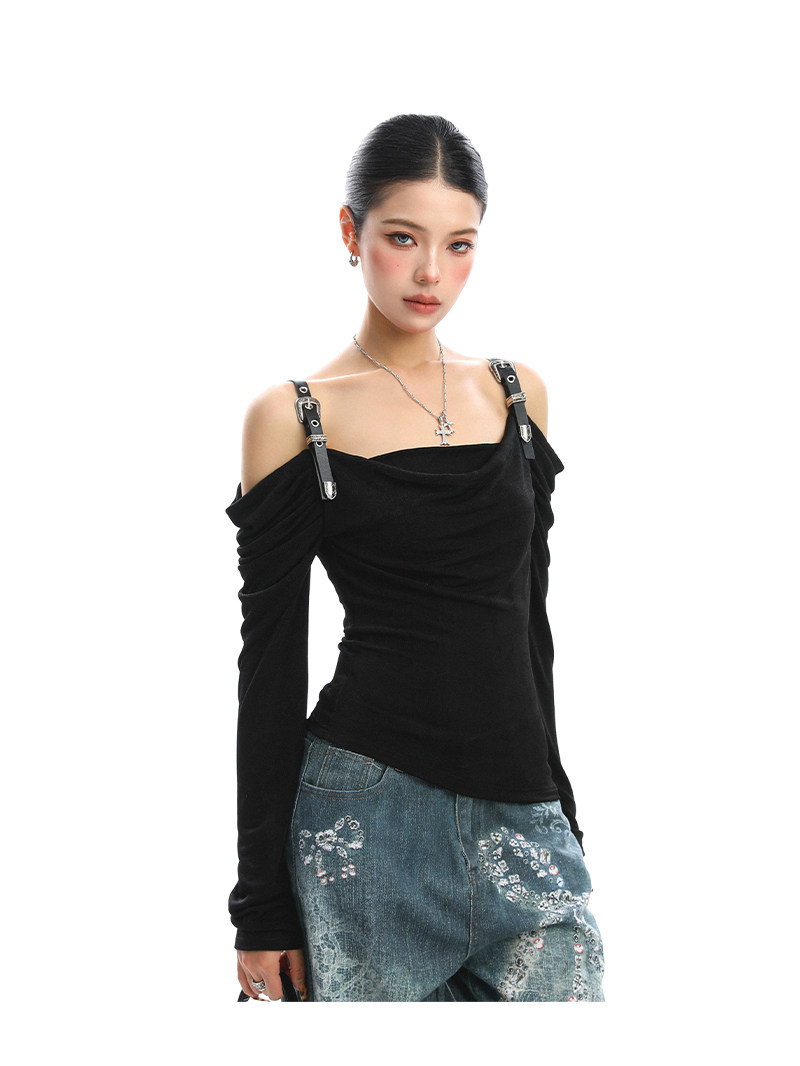 皮質肩帶蕩領一字肩長袖T恤女秋季辣妹純欲風顯瘦露肩上衣