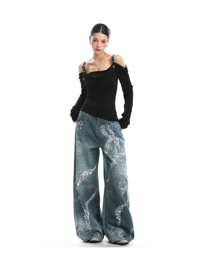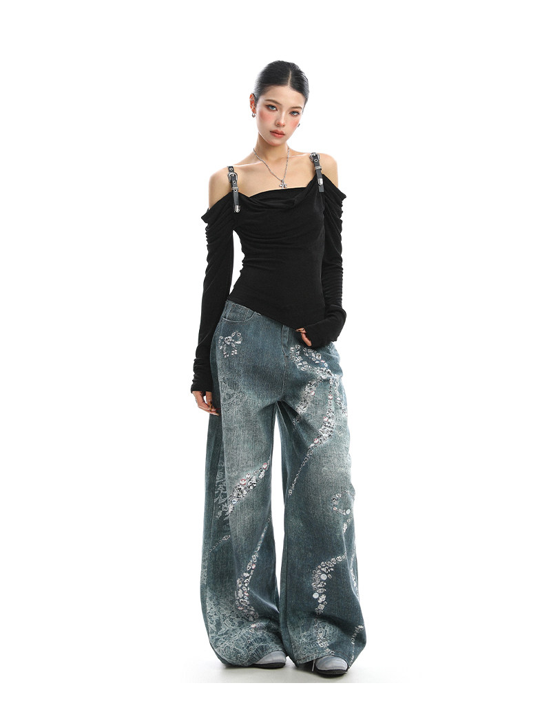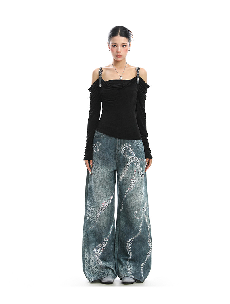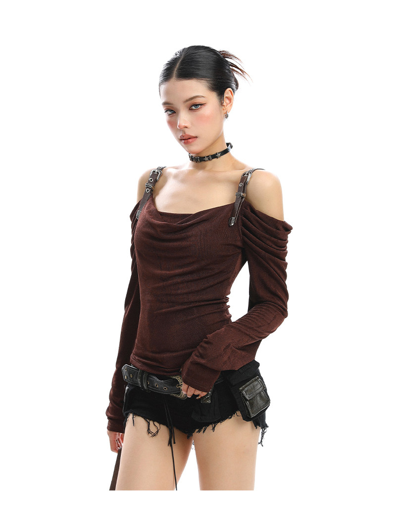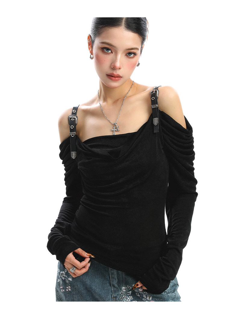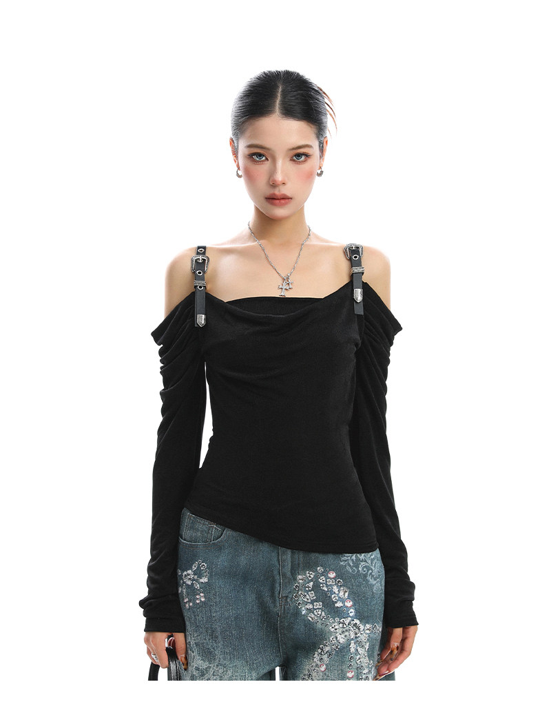 皮質肩帶蕩領一字肩長袖T恤女秋季辣妹純欲風顯瘦露肩上衣