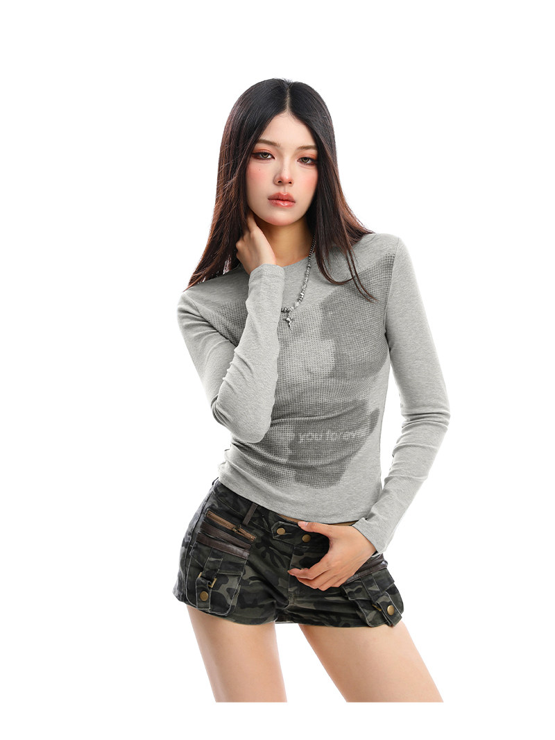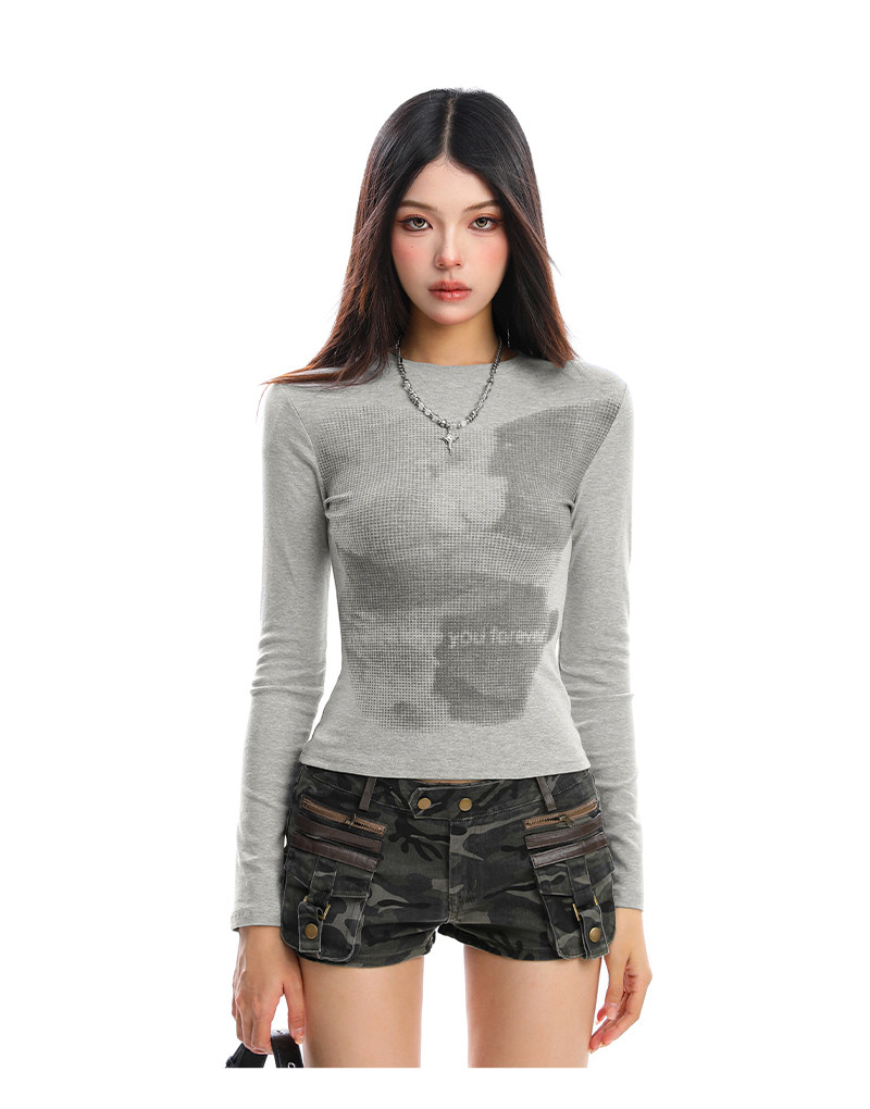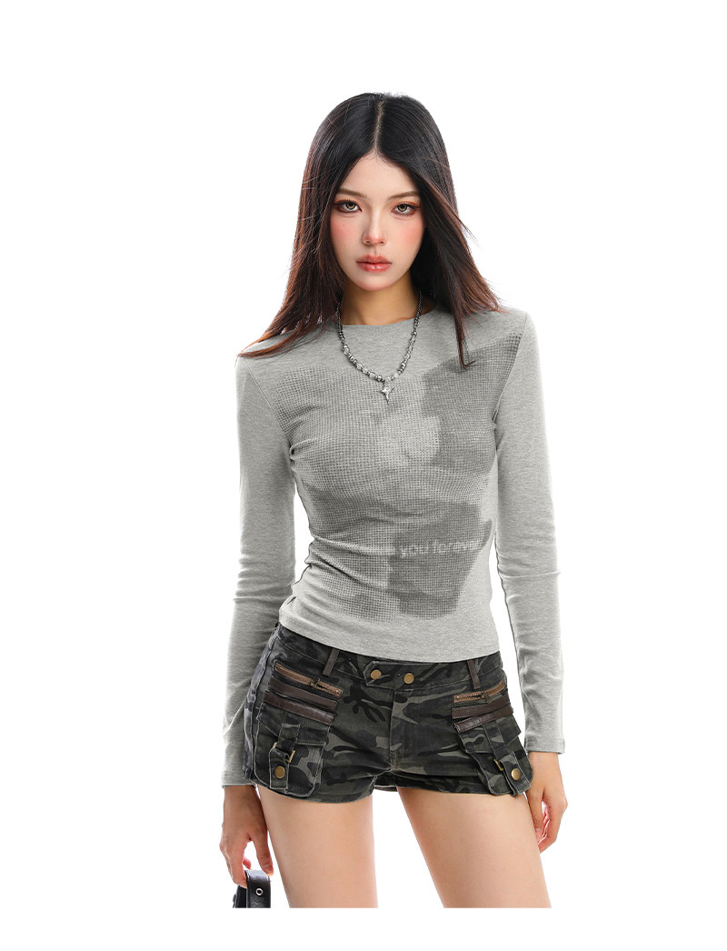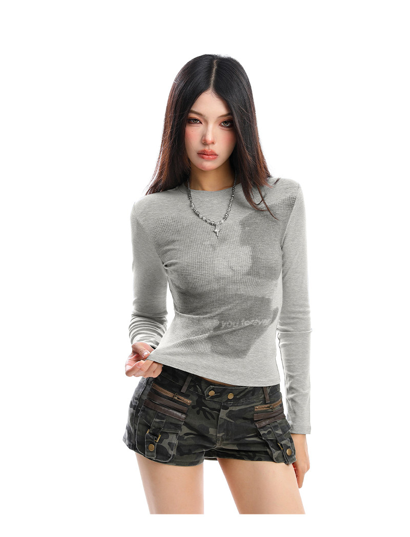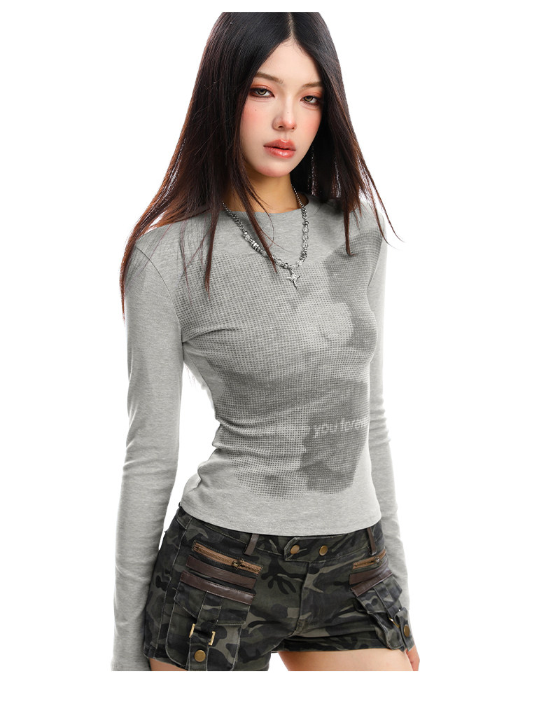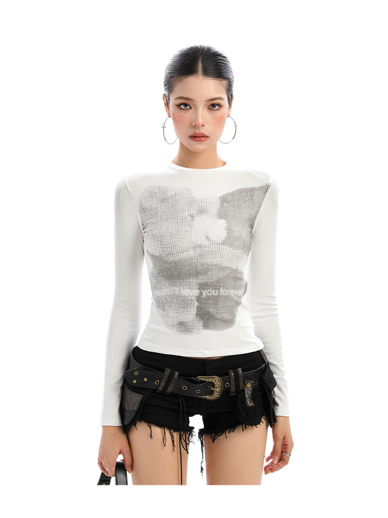 美式復古小熊印花正肩長袖T恤女秋季修身顯瘦辣妹短款上衣