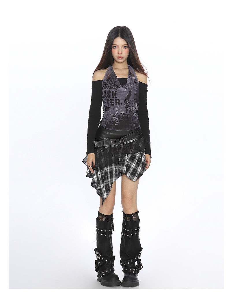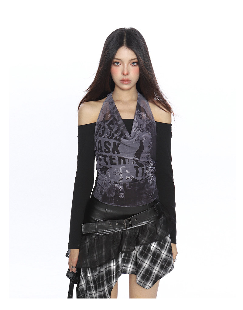 辣妹網紗掛脖一字肩長袖T恤女秋季純欲風露肩顯瘦內搭上衣
