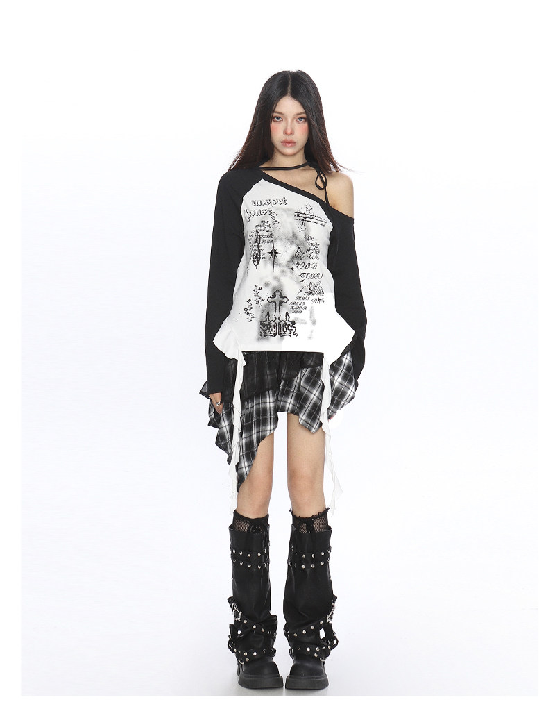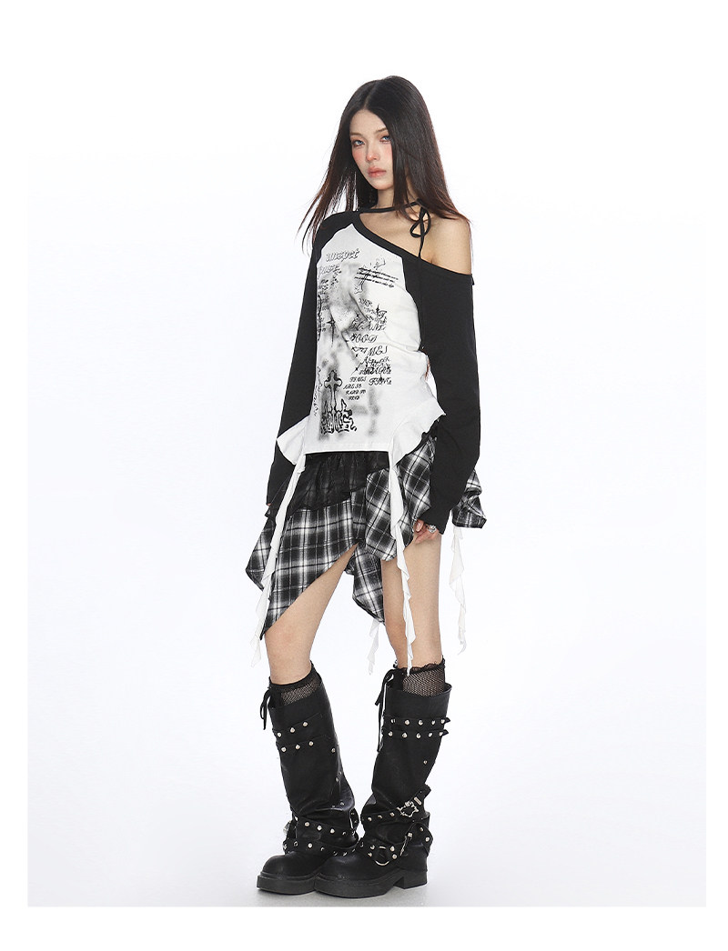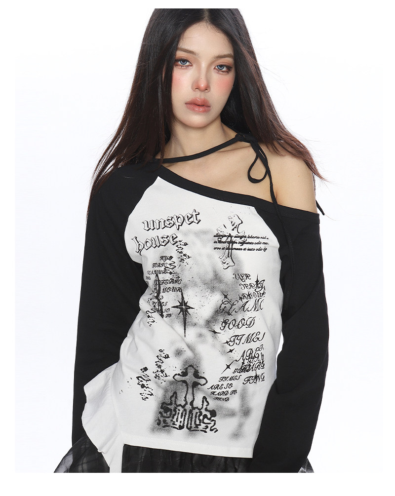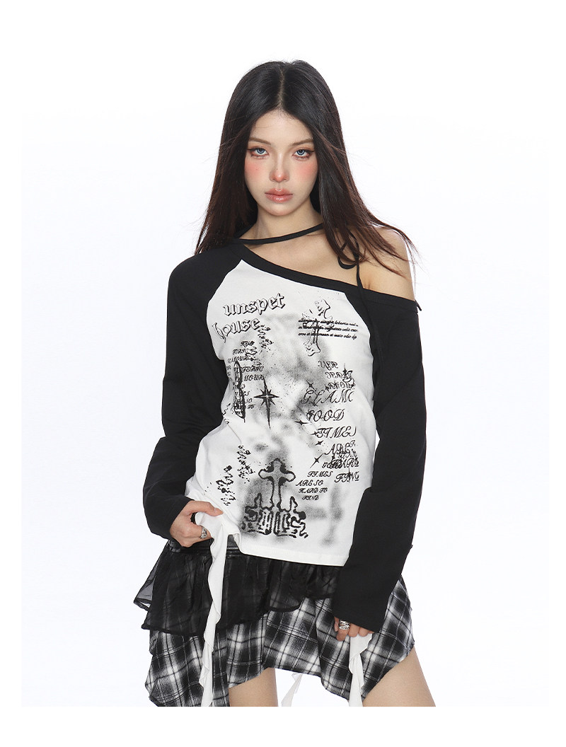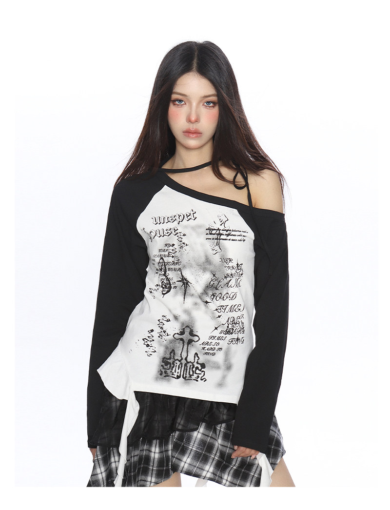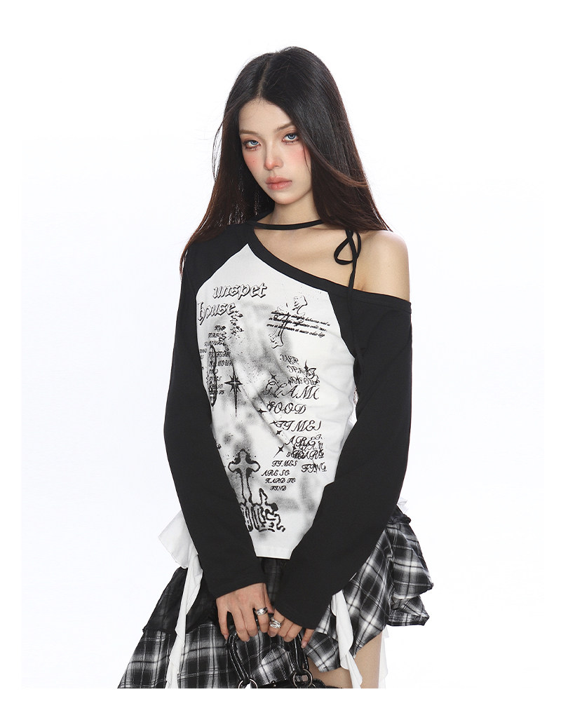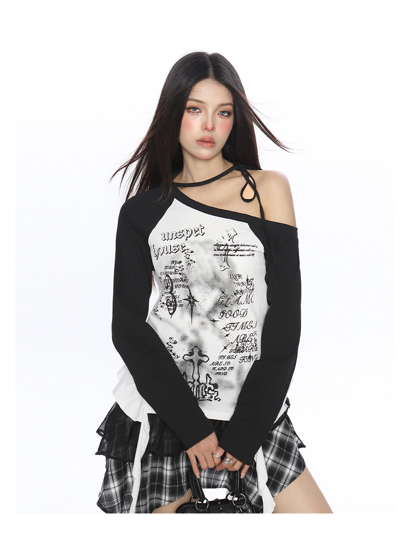 輕亞風塗鴉斜肩系帶流蘇長袖T恤女秋季辣媽漏肩內搭上衣潮