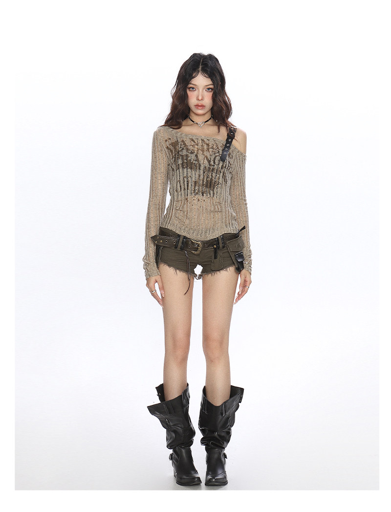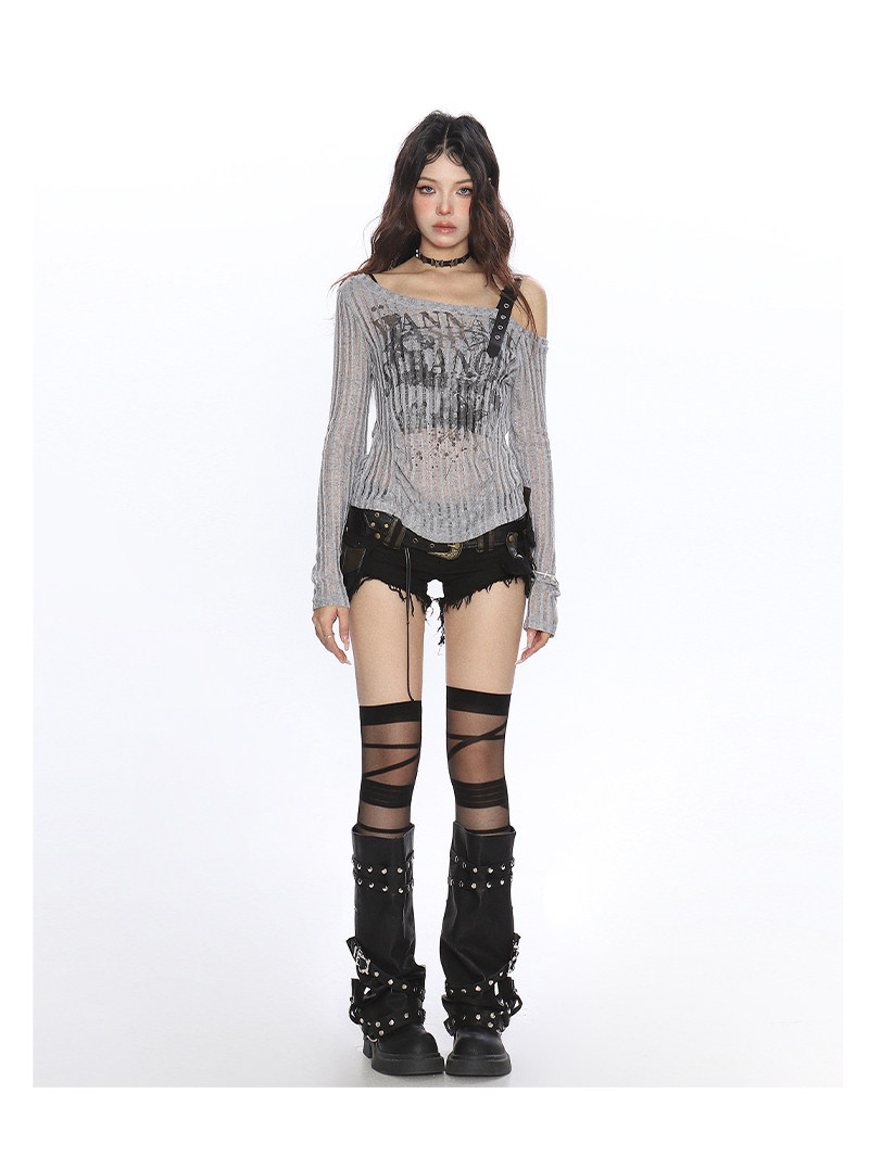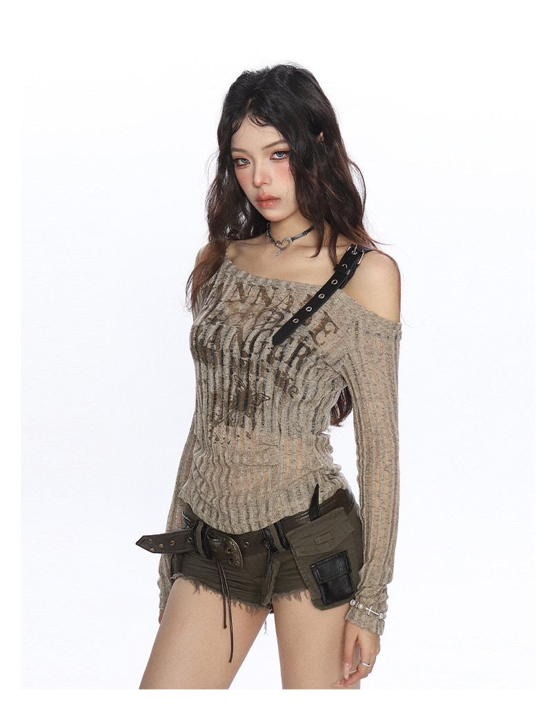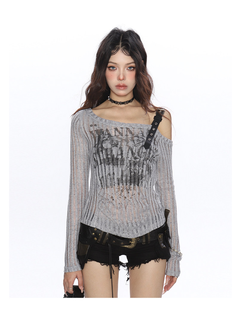 塗鴉薄款斜肩皮扣吊帶長袖T恤女夏季辣妹顯瘦防曬罩衫上衣