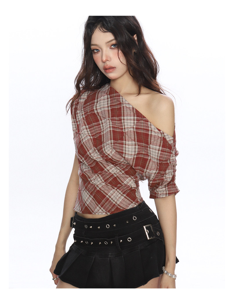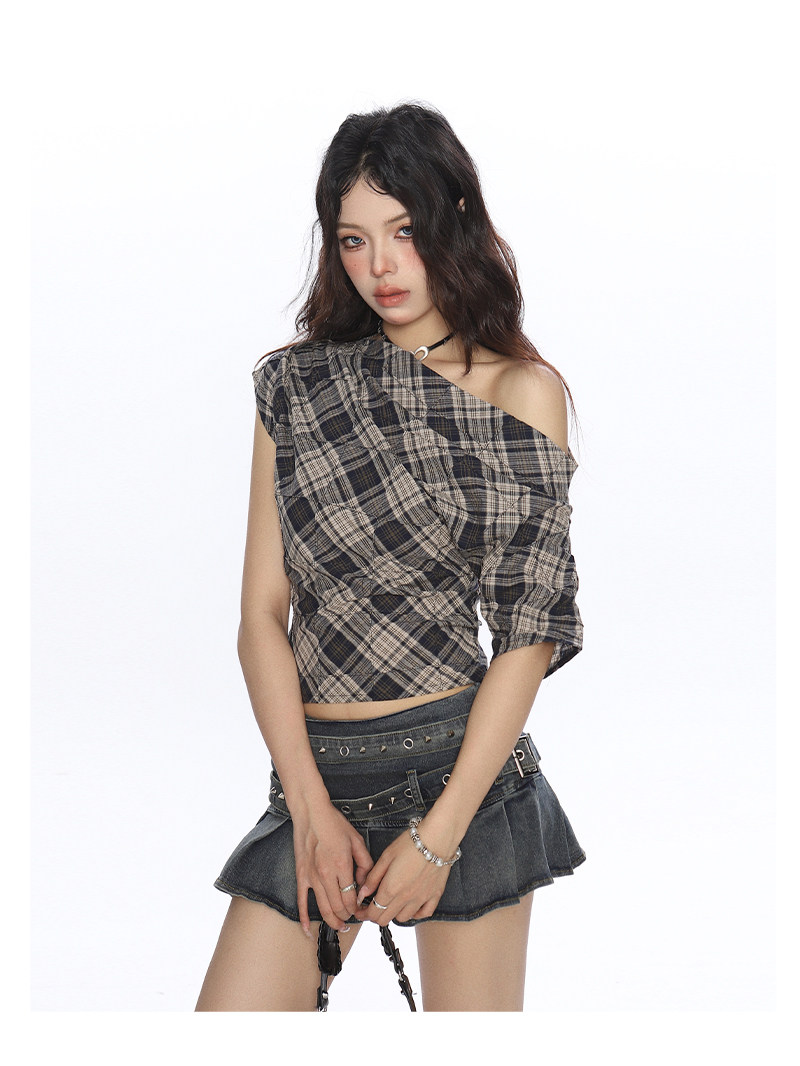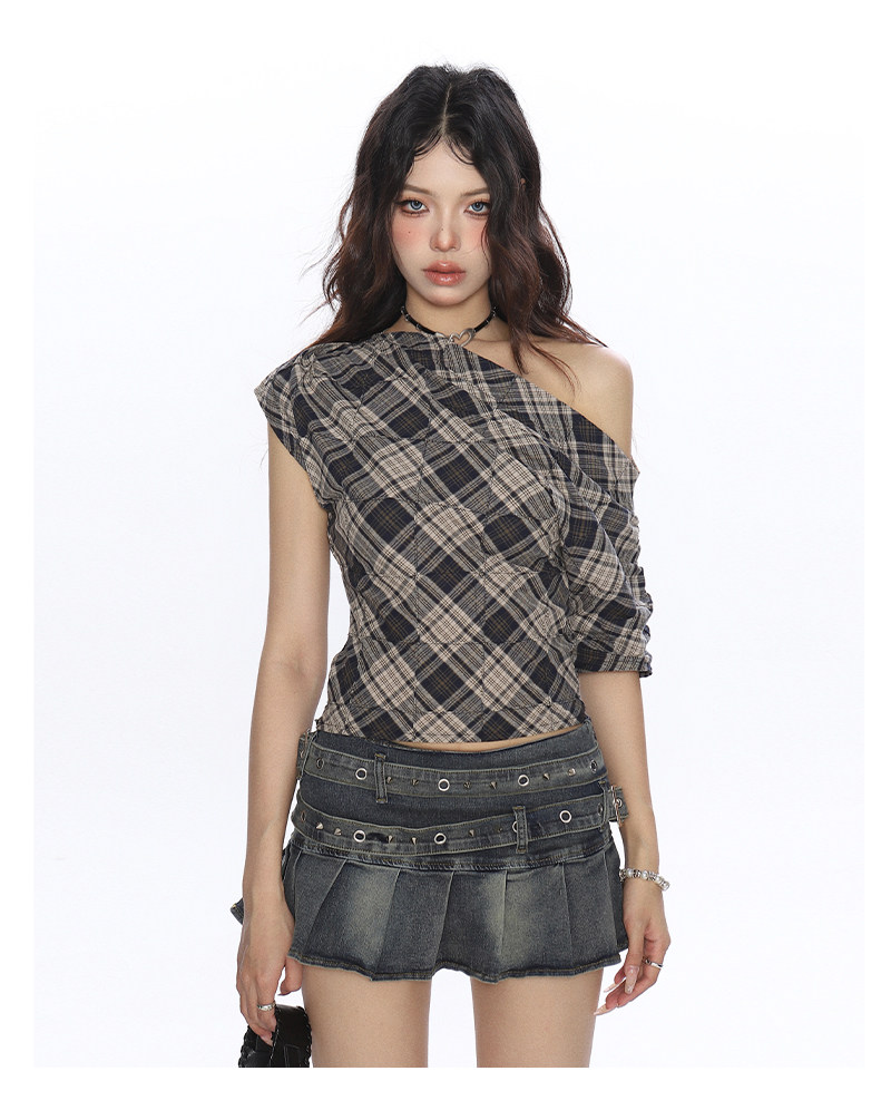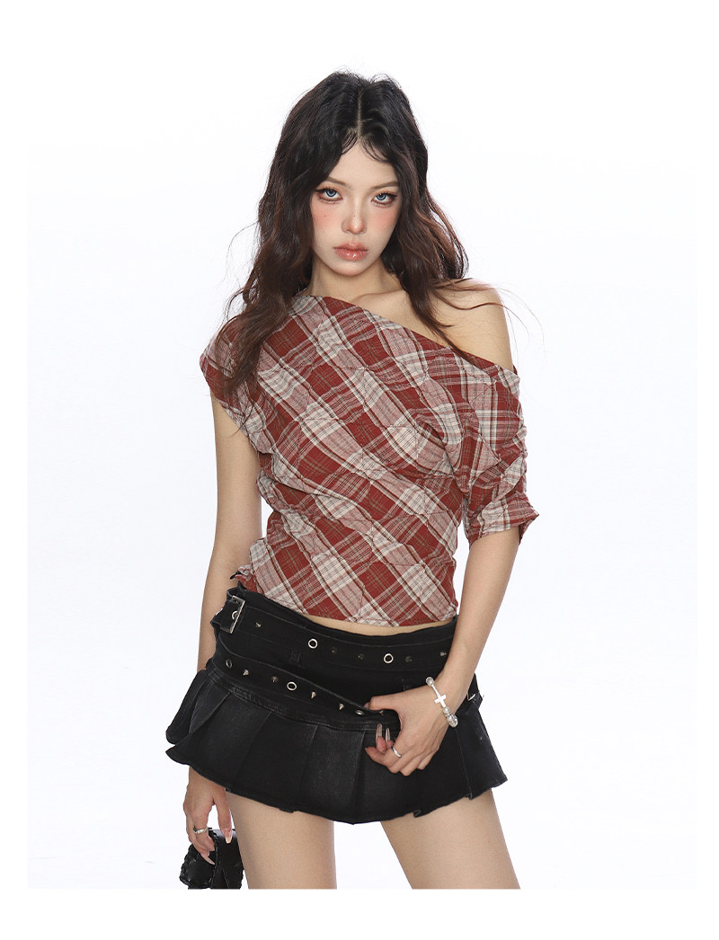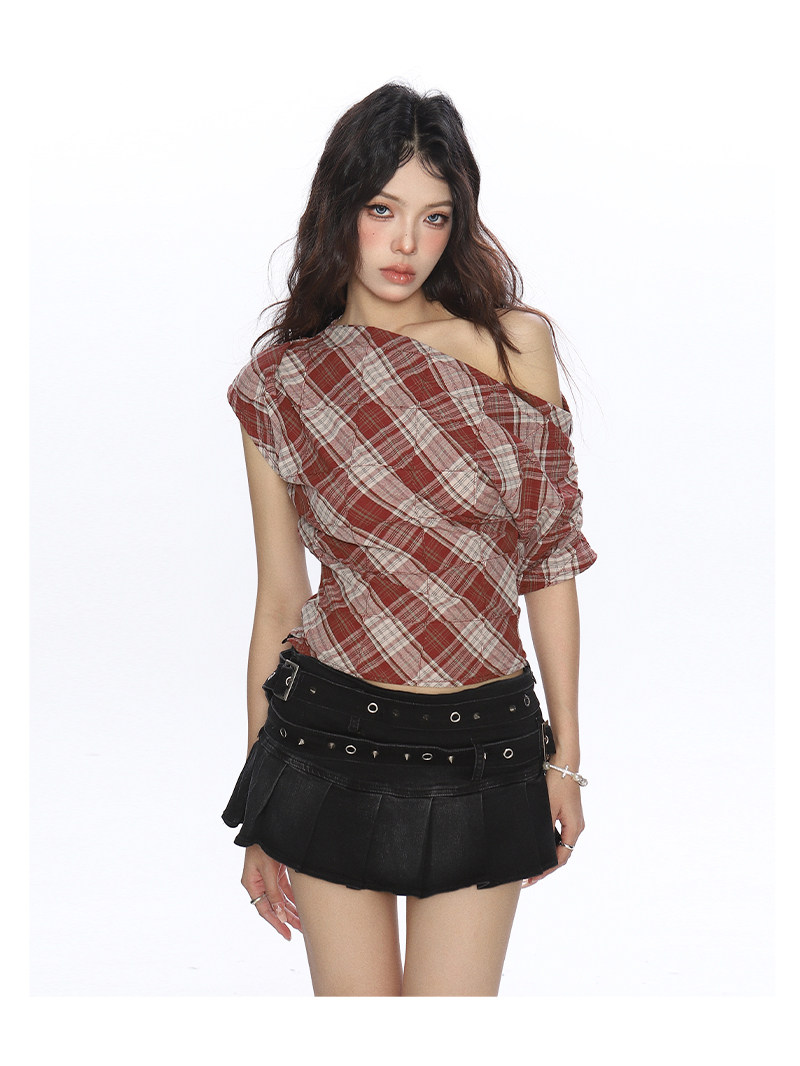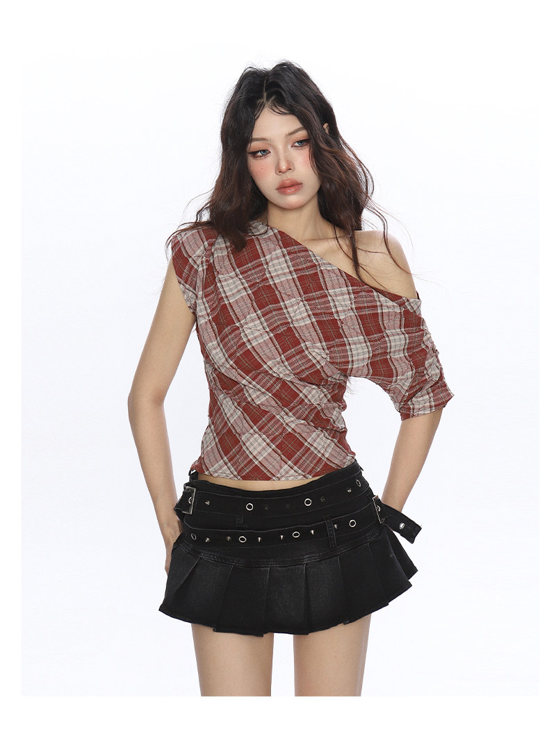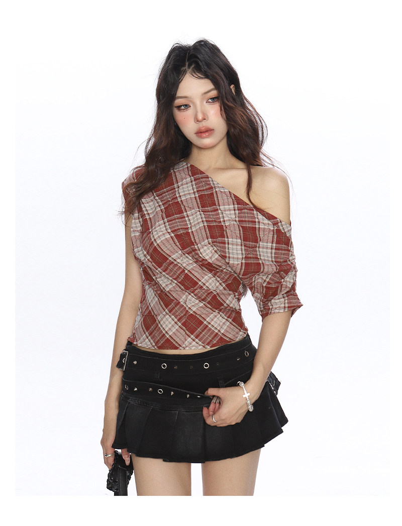 辣妹撞色格子斜肩短袖T恤女夏季設計感韓系露肩顯瘦上衣潮