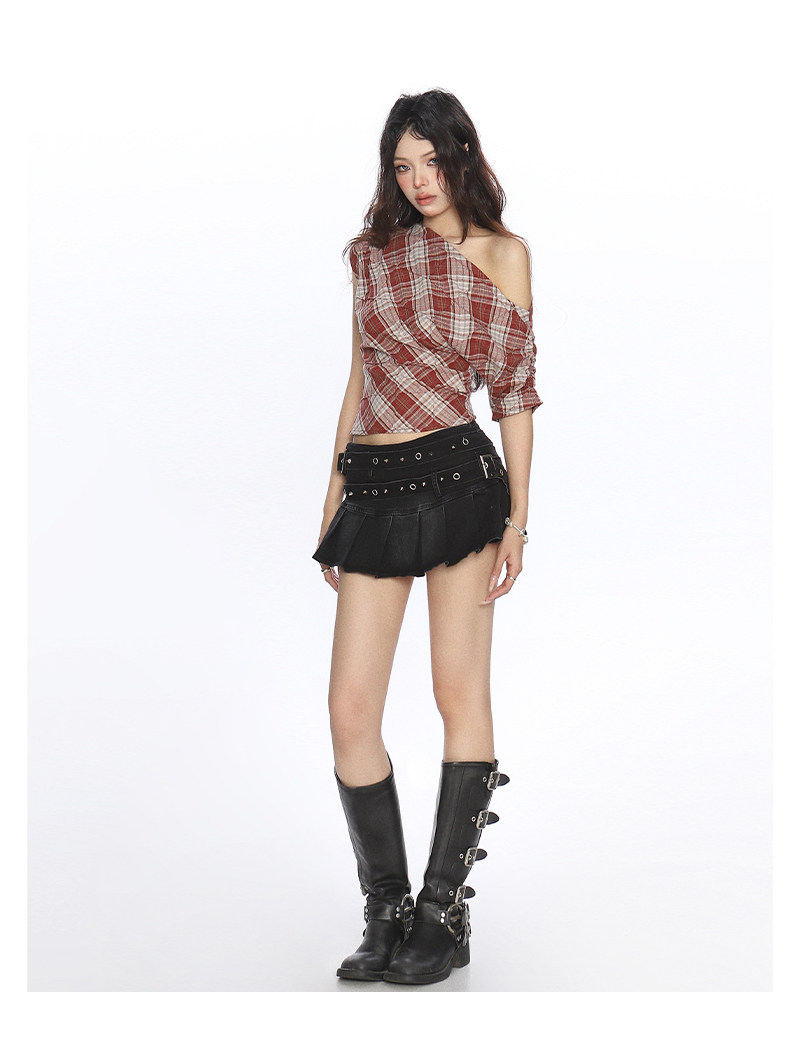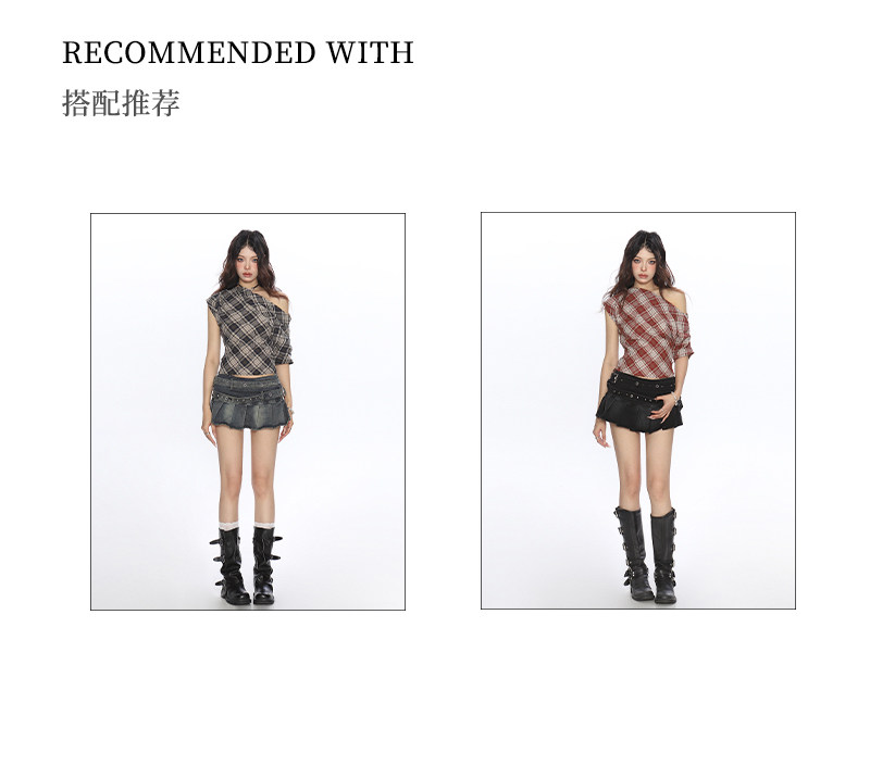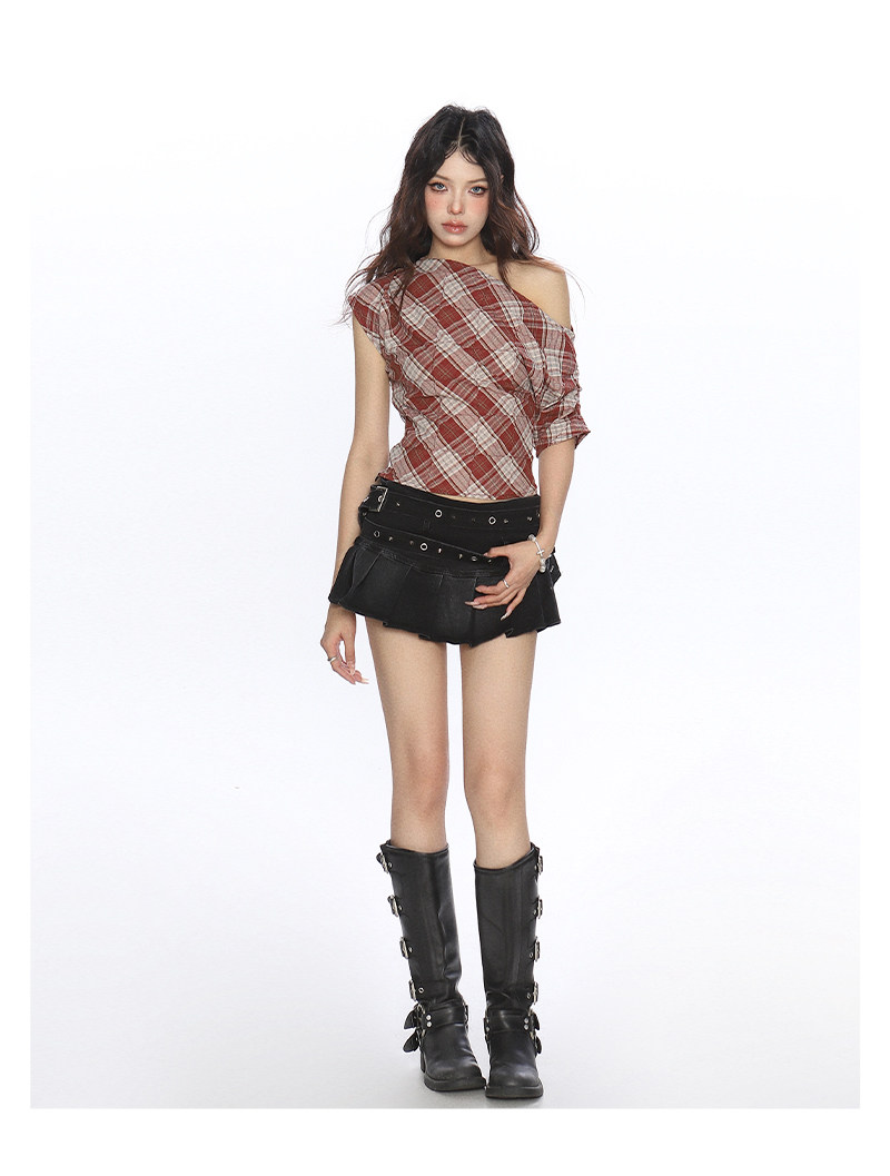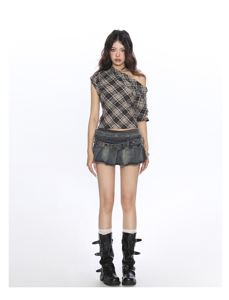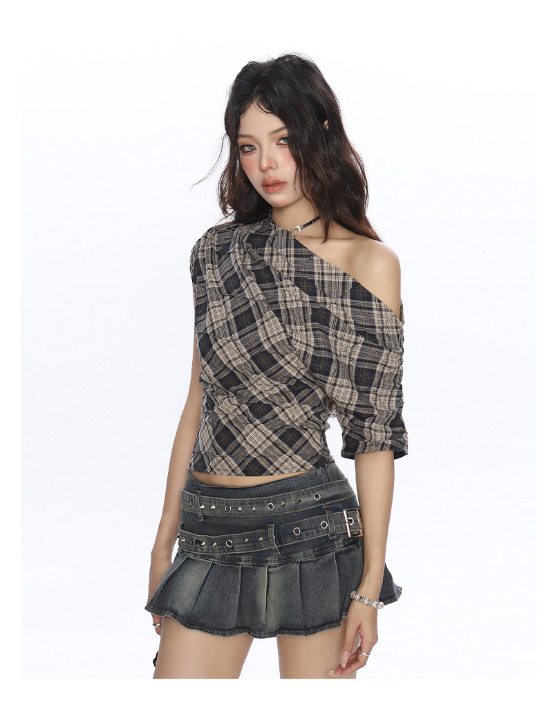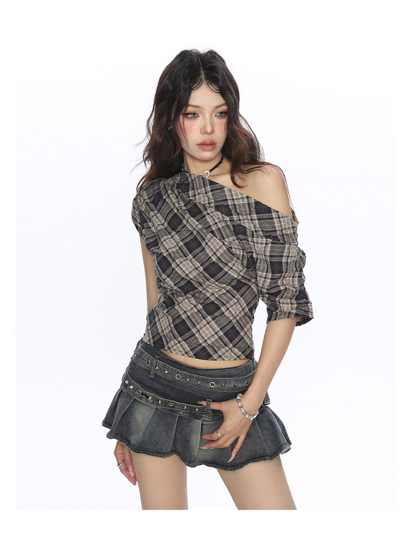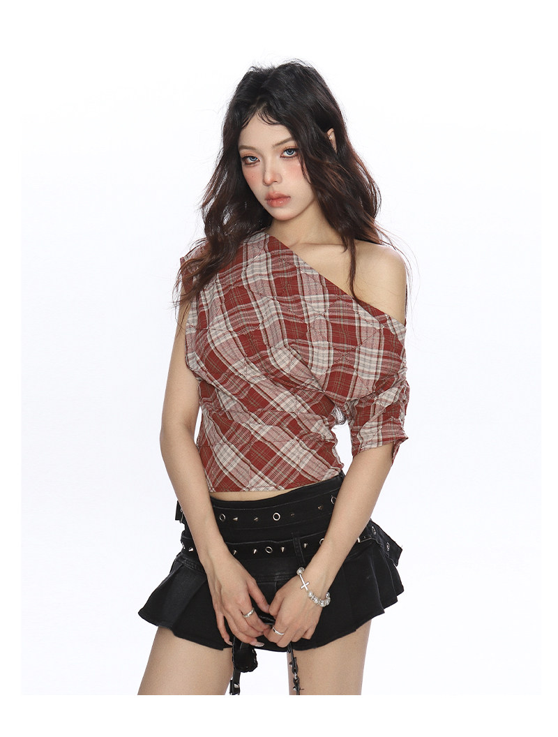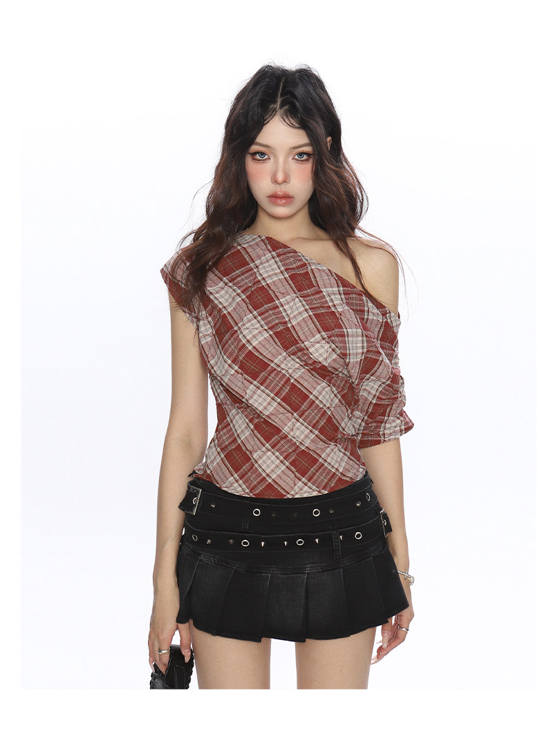 辣妹撞色格子斜肩短袖T恤女夏季設計感韓系露肩顯瘦上衣潮