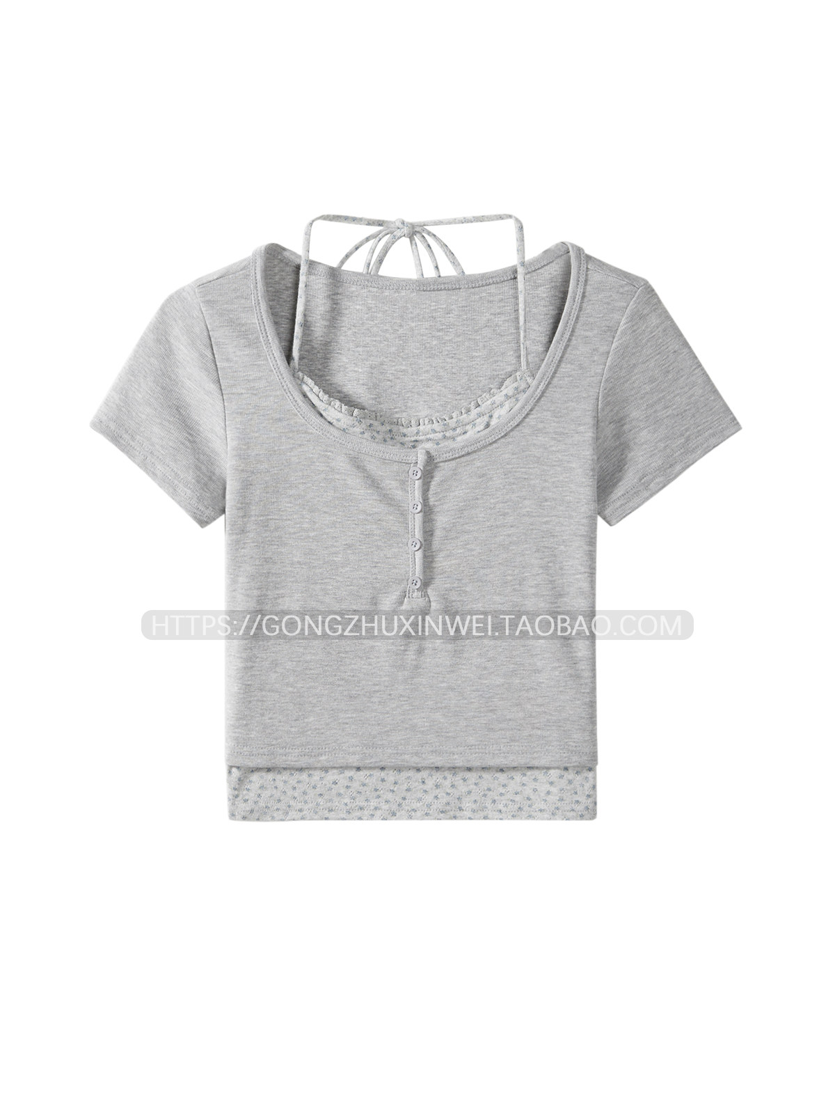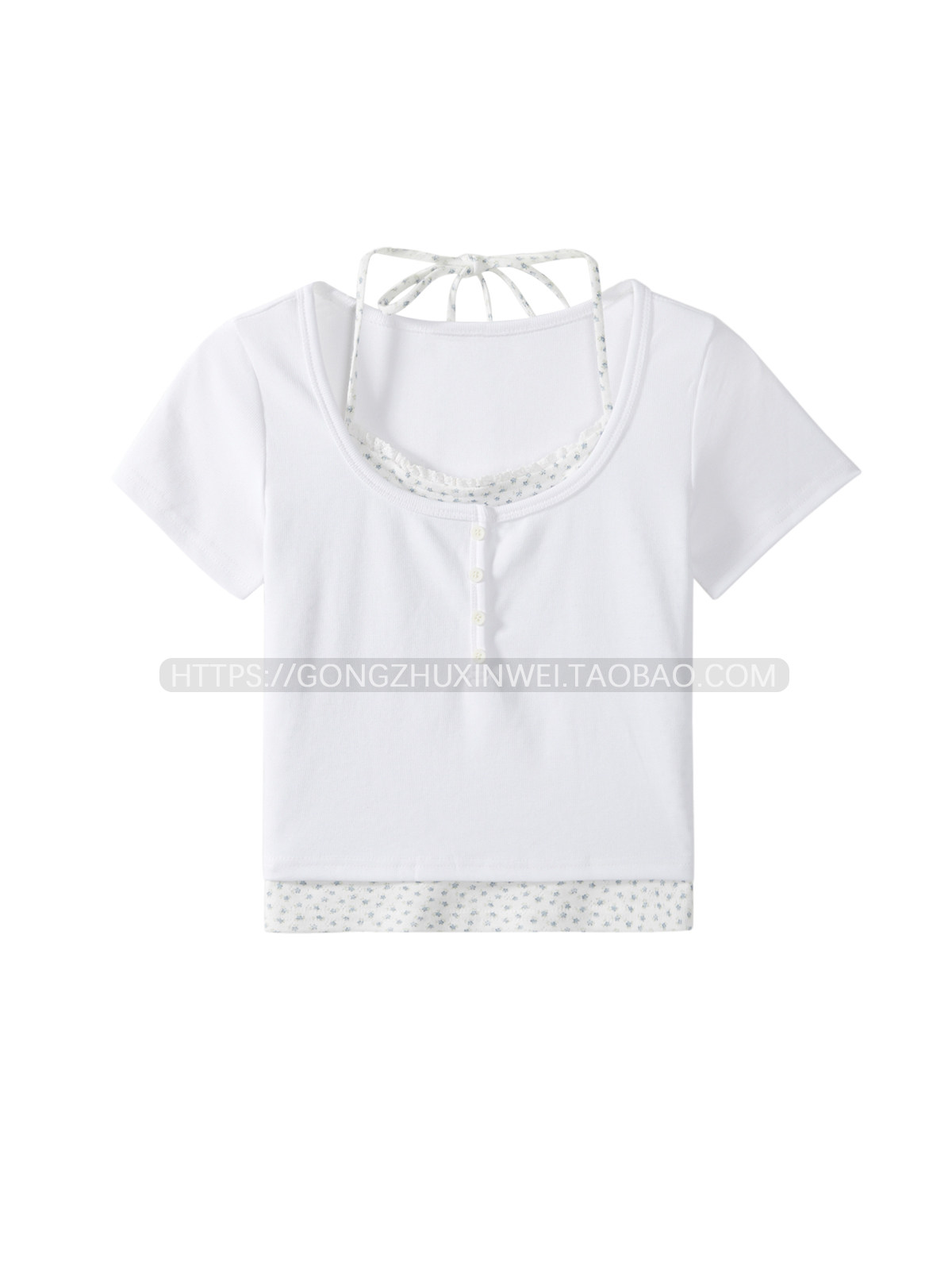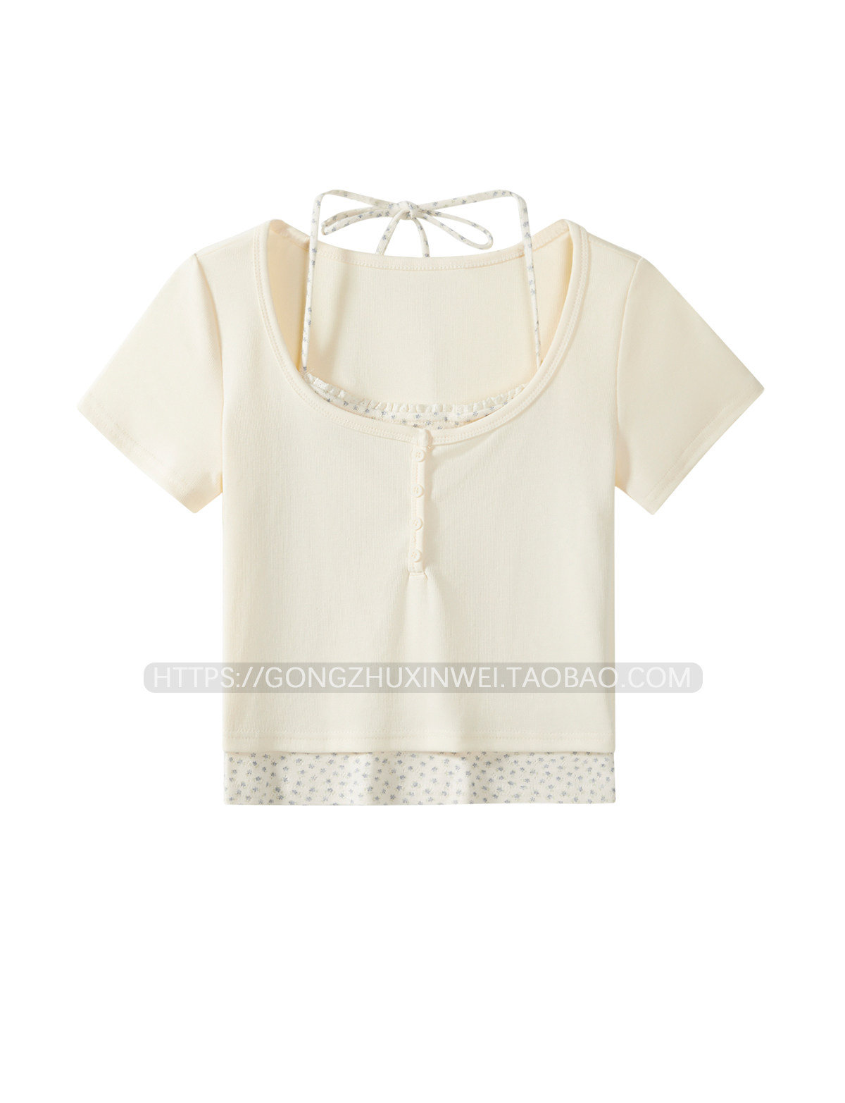 純欲甜辣假兩件拼接短袖掛脖T恤女夏季新款碎花U領短款上衣