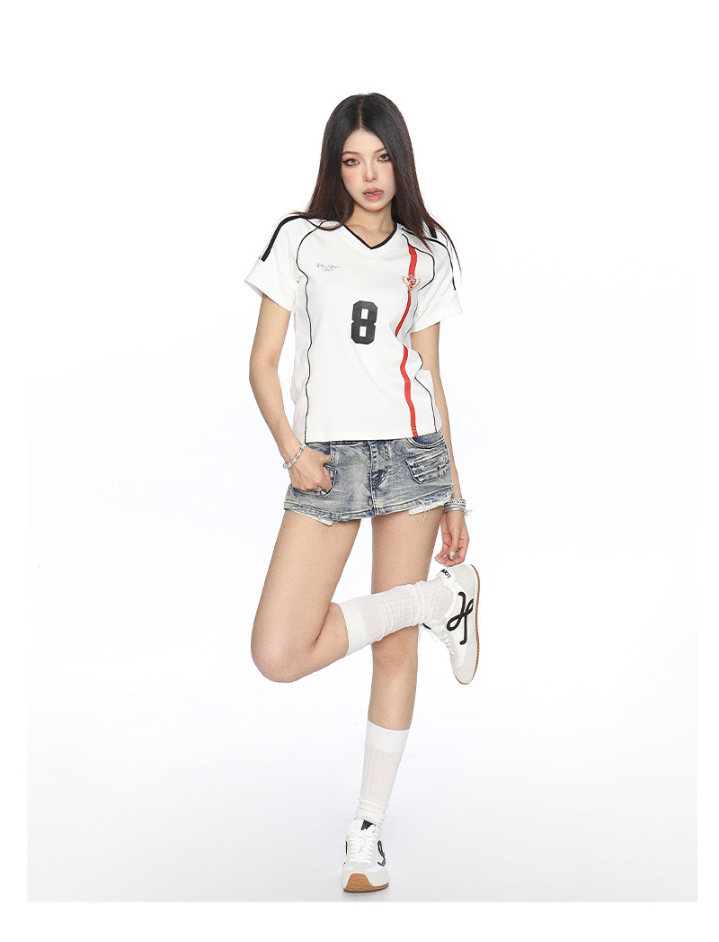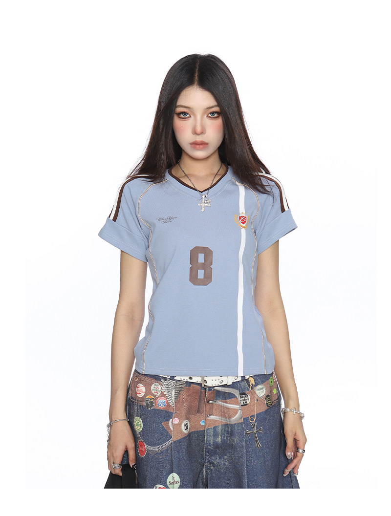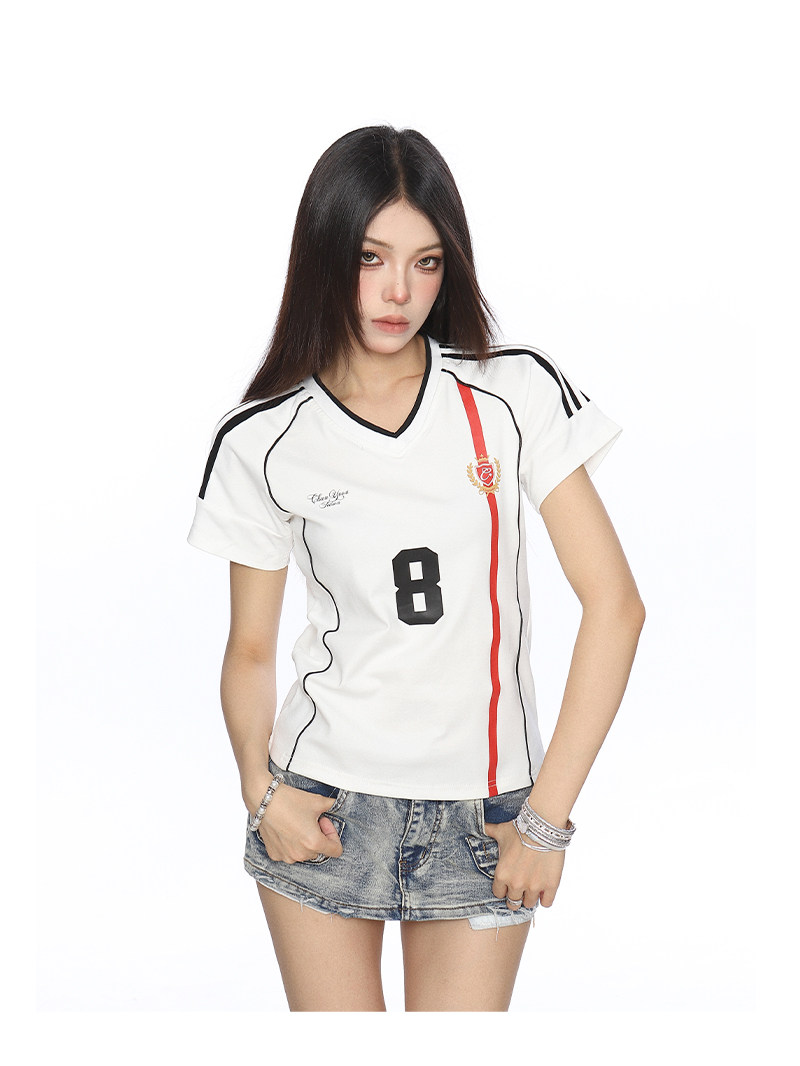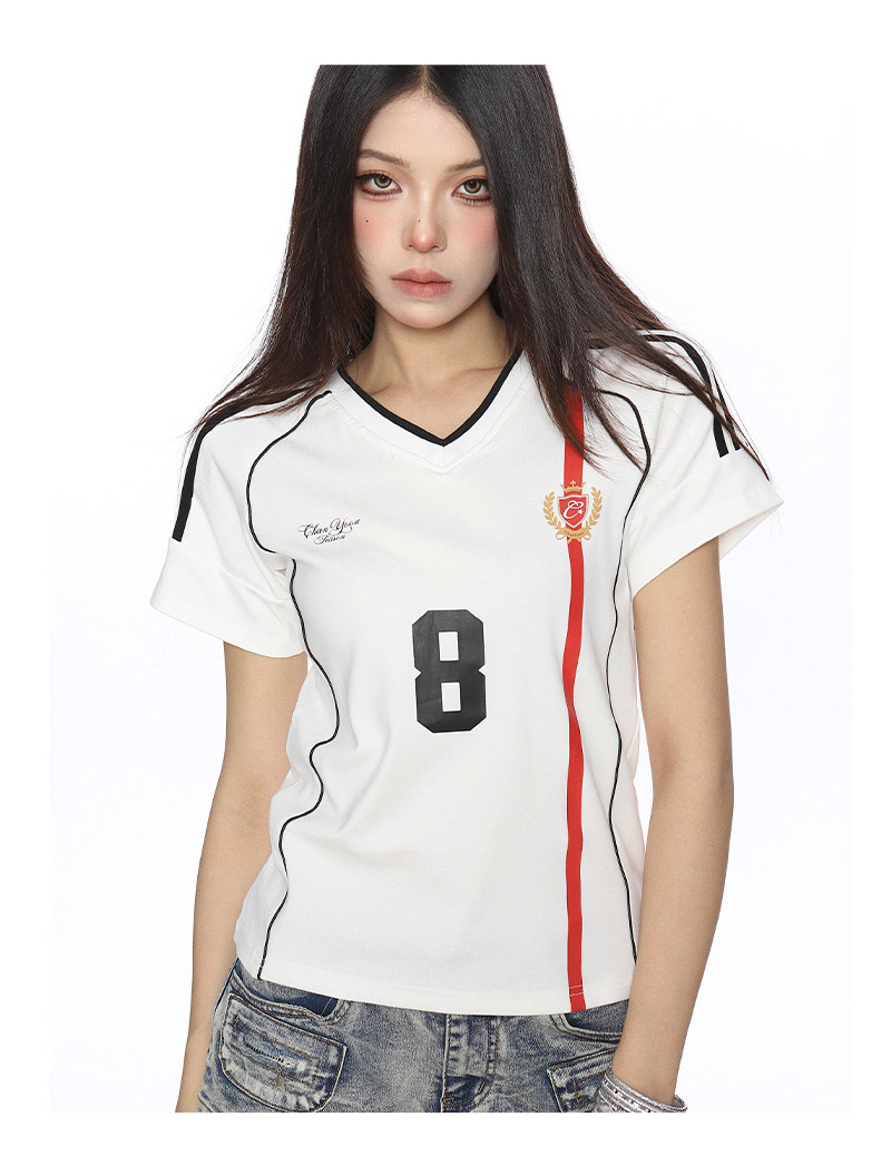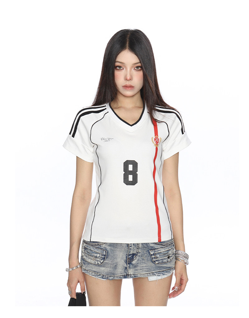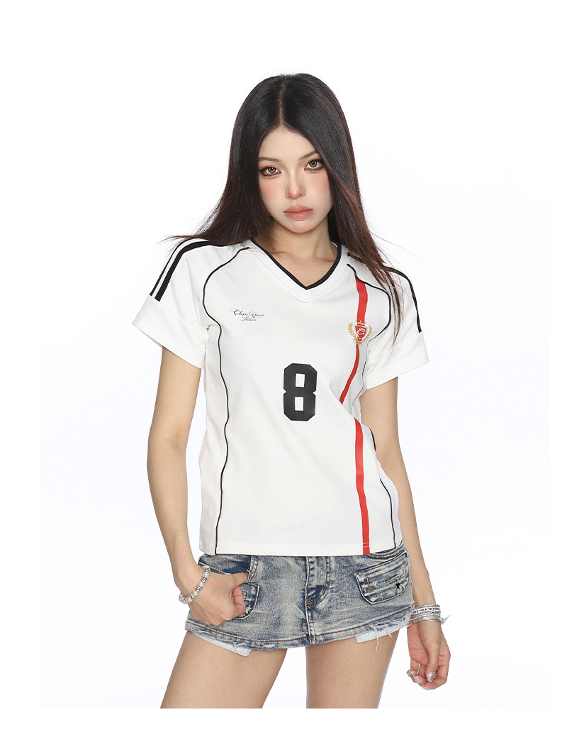 美式杠條正肩球衣短袖T恤女夏季澤西風v領運動辣妹上衣潮