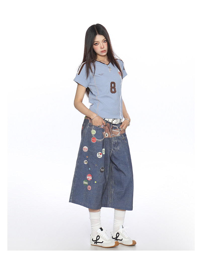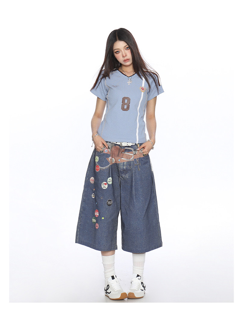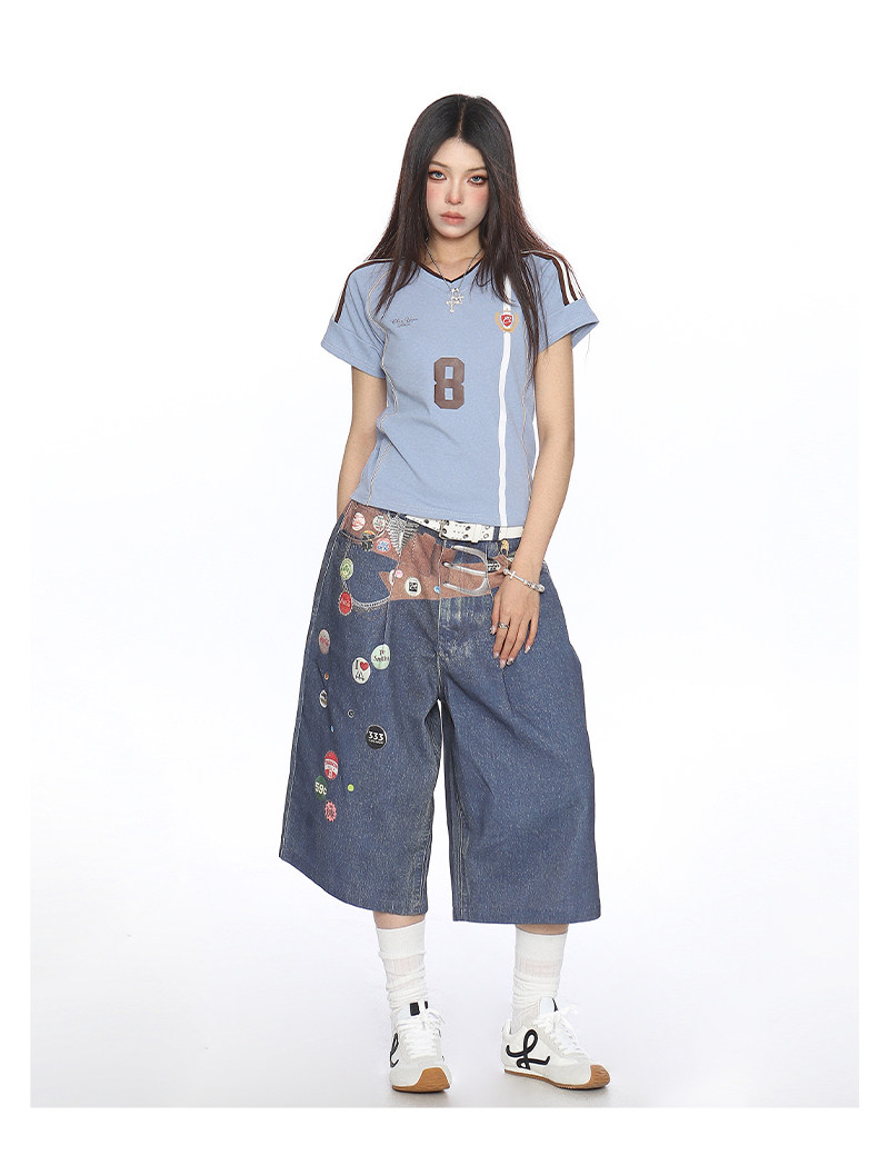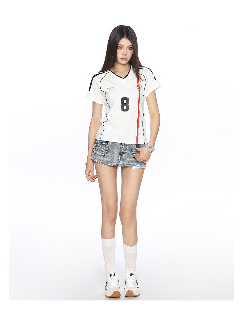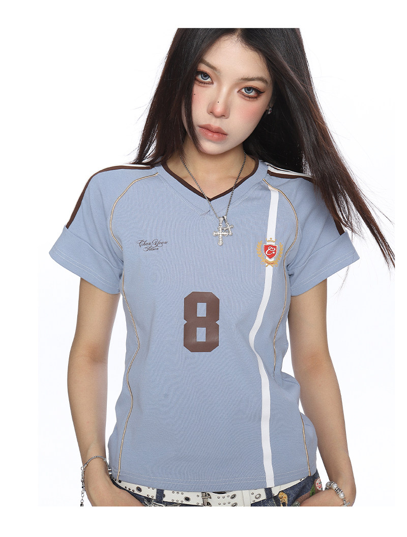 美式杠條正肩球衣短袖T恤女夏季澤西風v領運動辣妹上衣潮