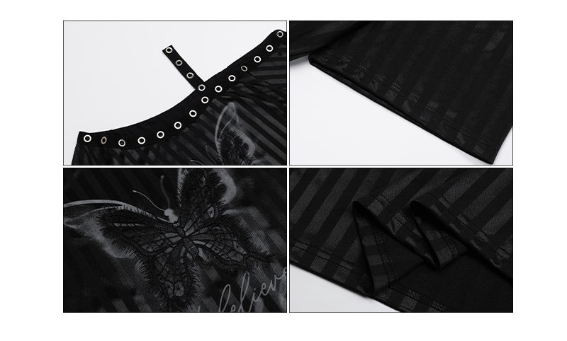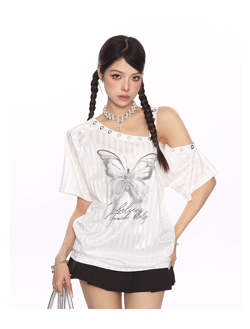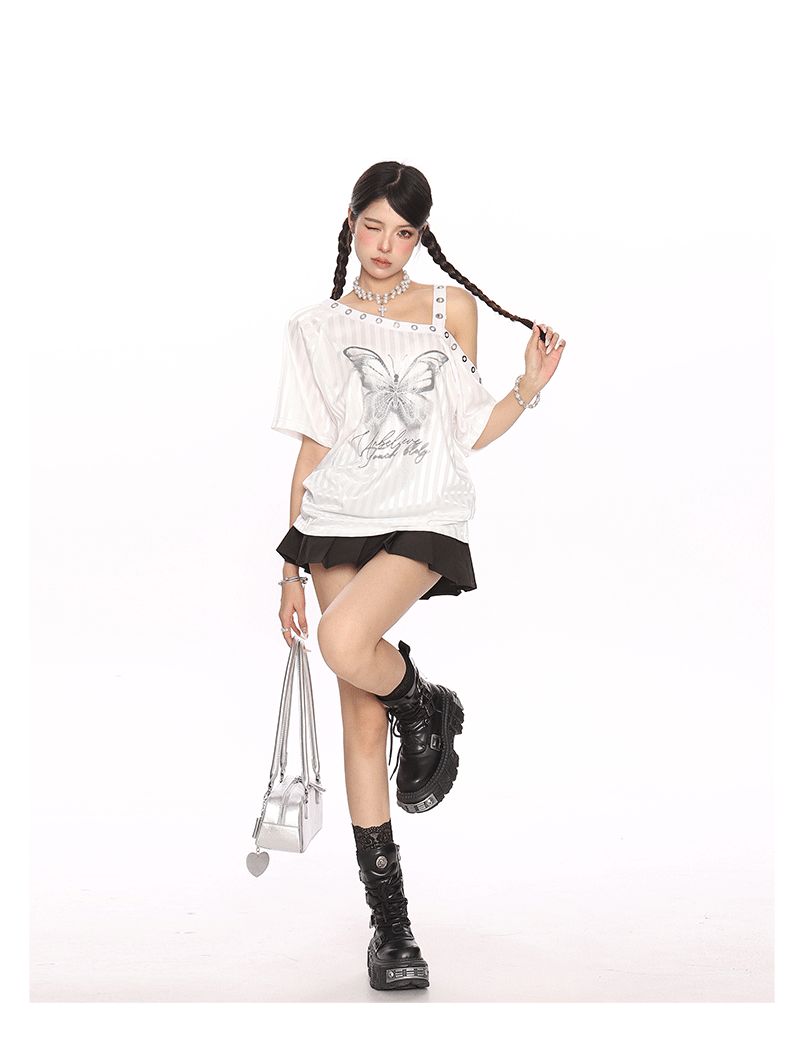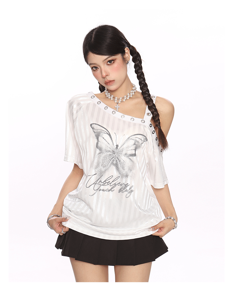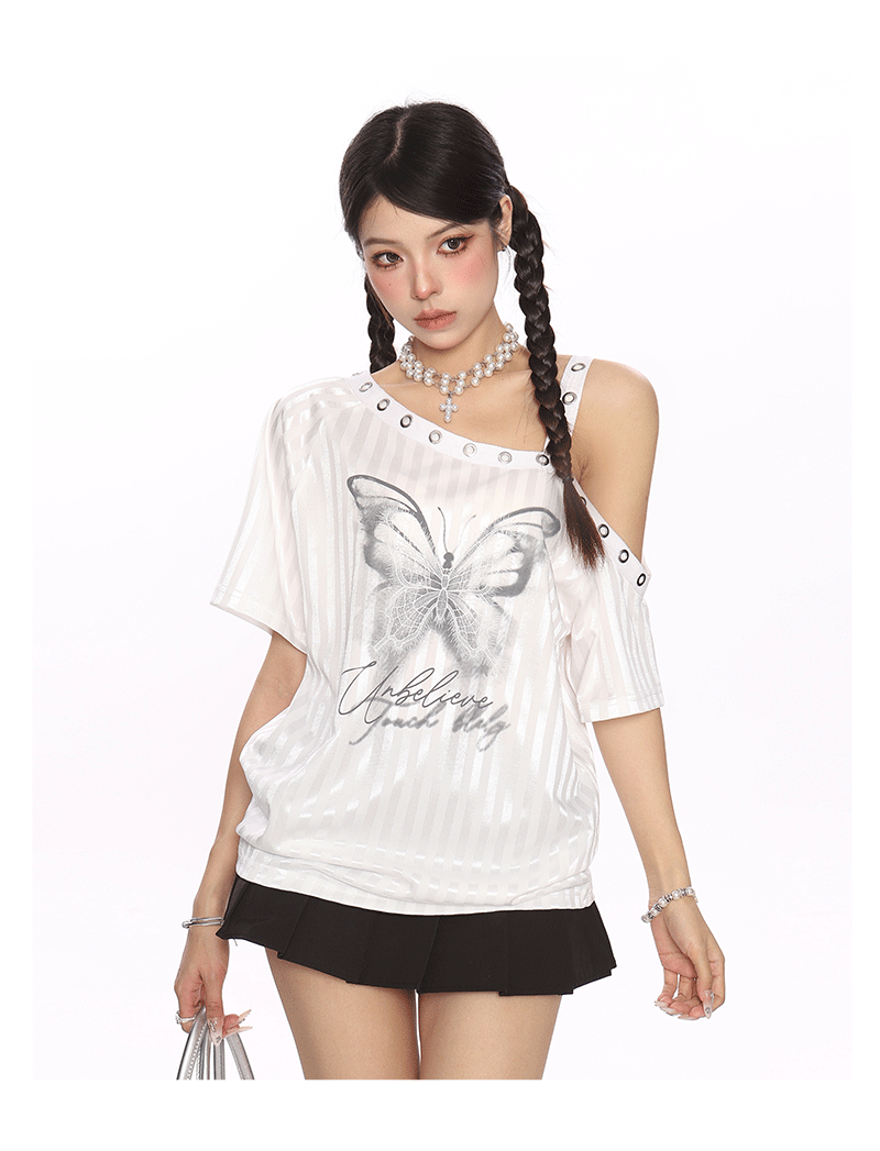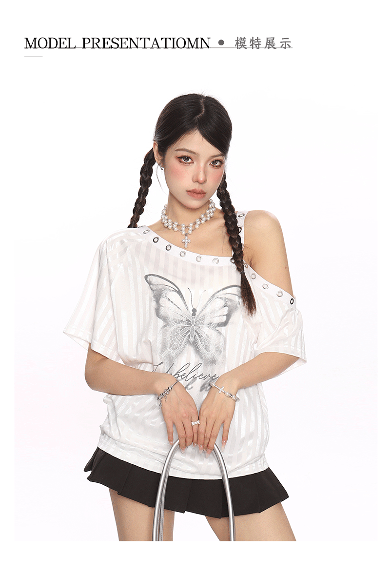 幻影蝴蝶條紋斜肩吊帶短袖T恤女夏季y2k甜酷漏肩顯瘦上衣