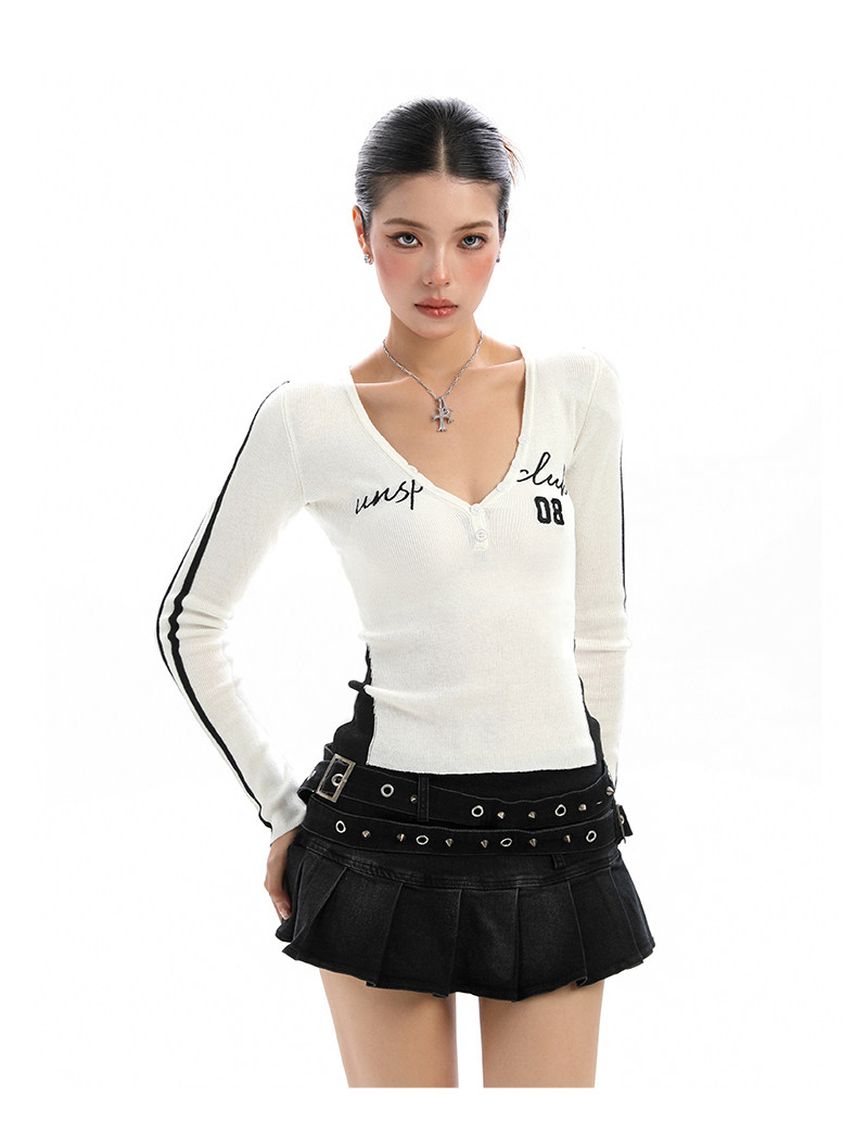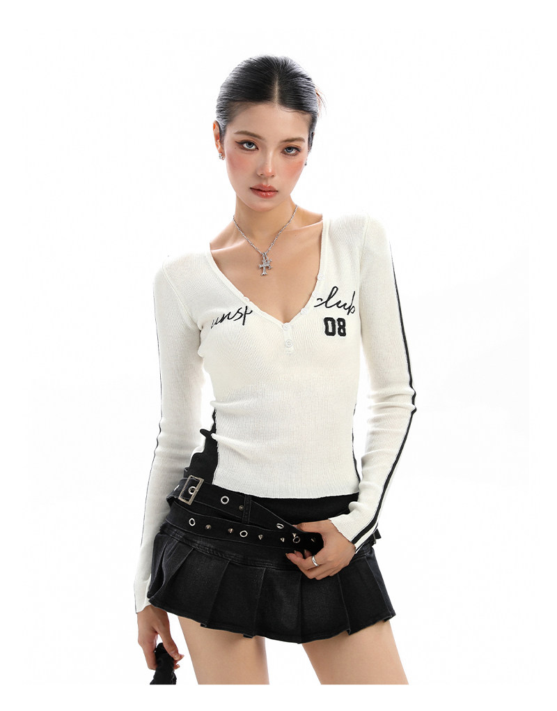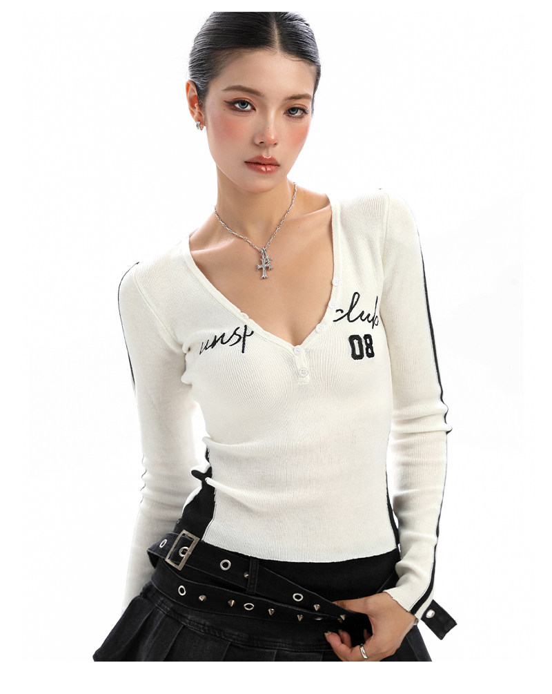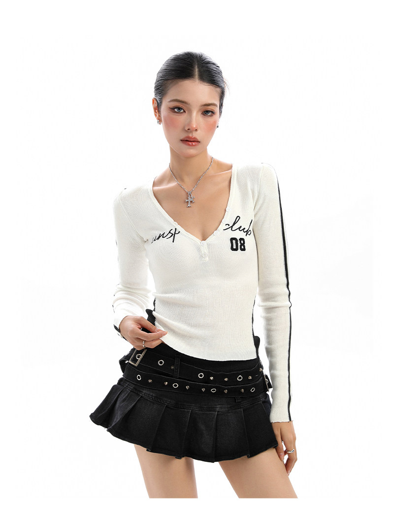 美式杠條紋v領針織毛衣女秋冬運動風顯瘦內搭打底衫上衣潮