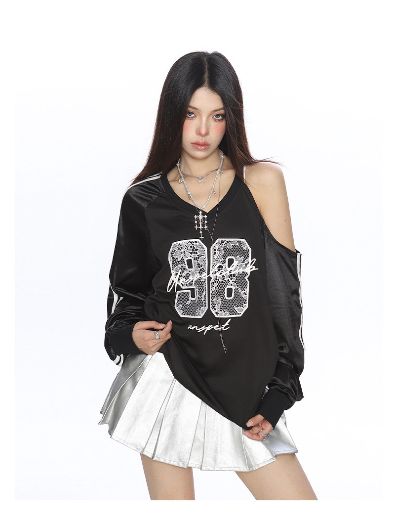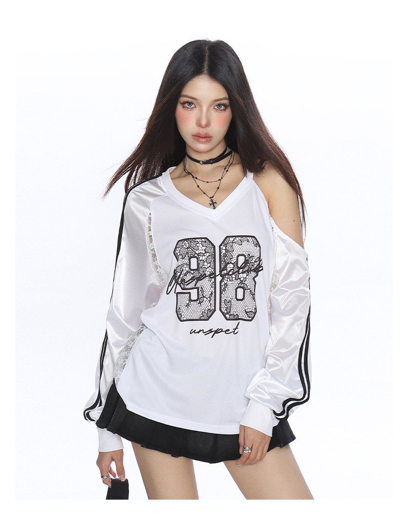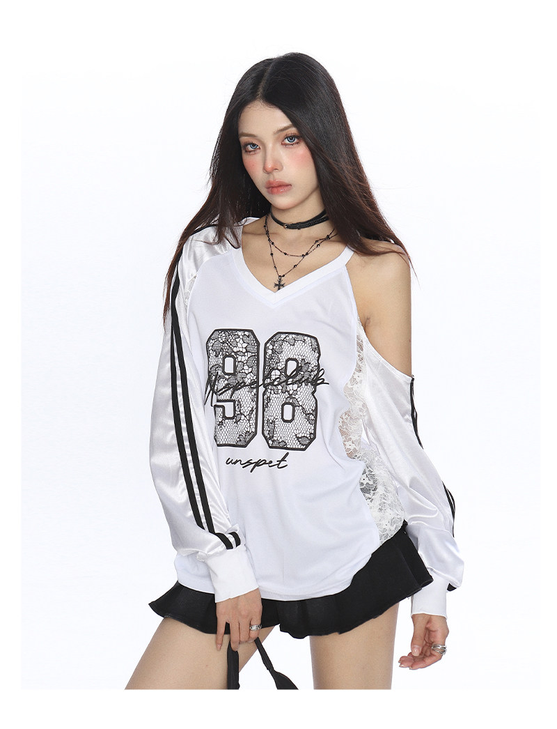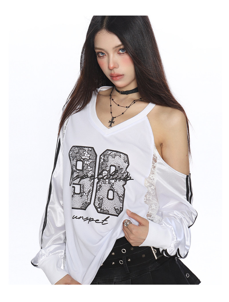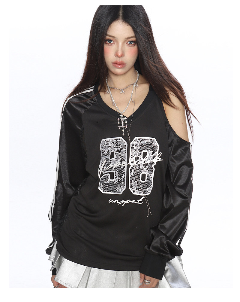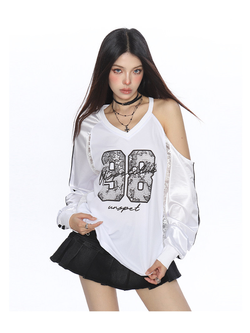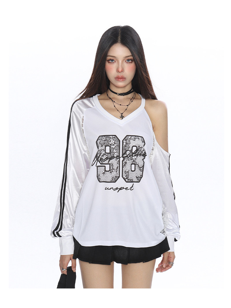 辣妹蕾絲字母露肩v領長袖衛衣女秋季寬松顯瘦運動球衣上衣