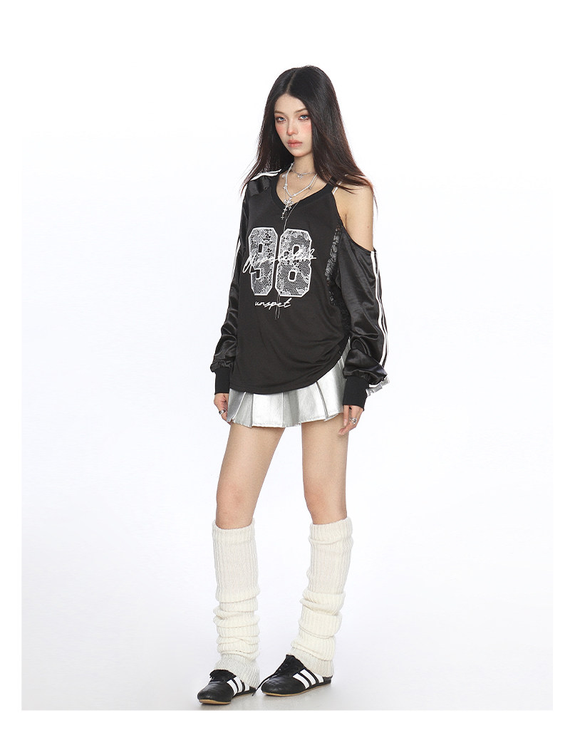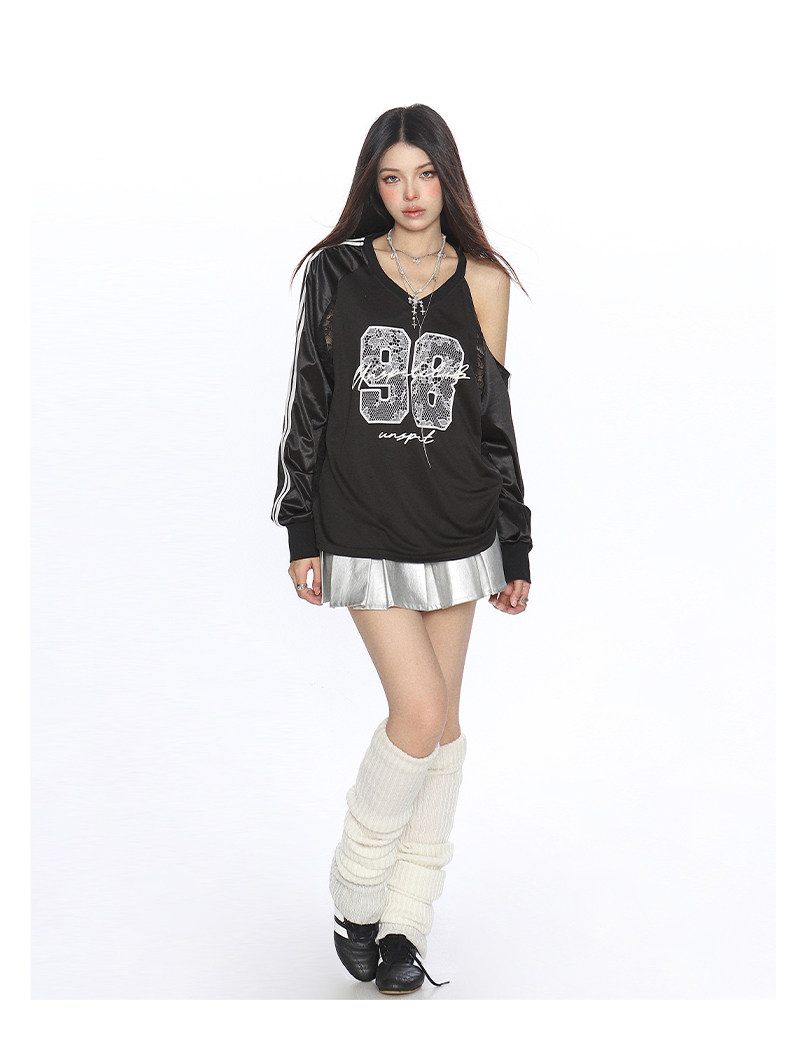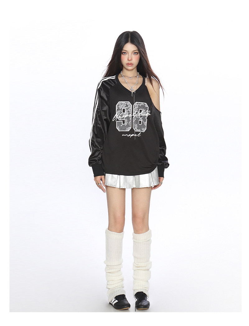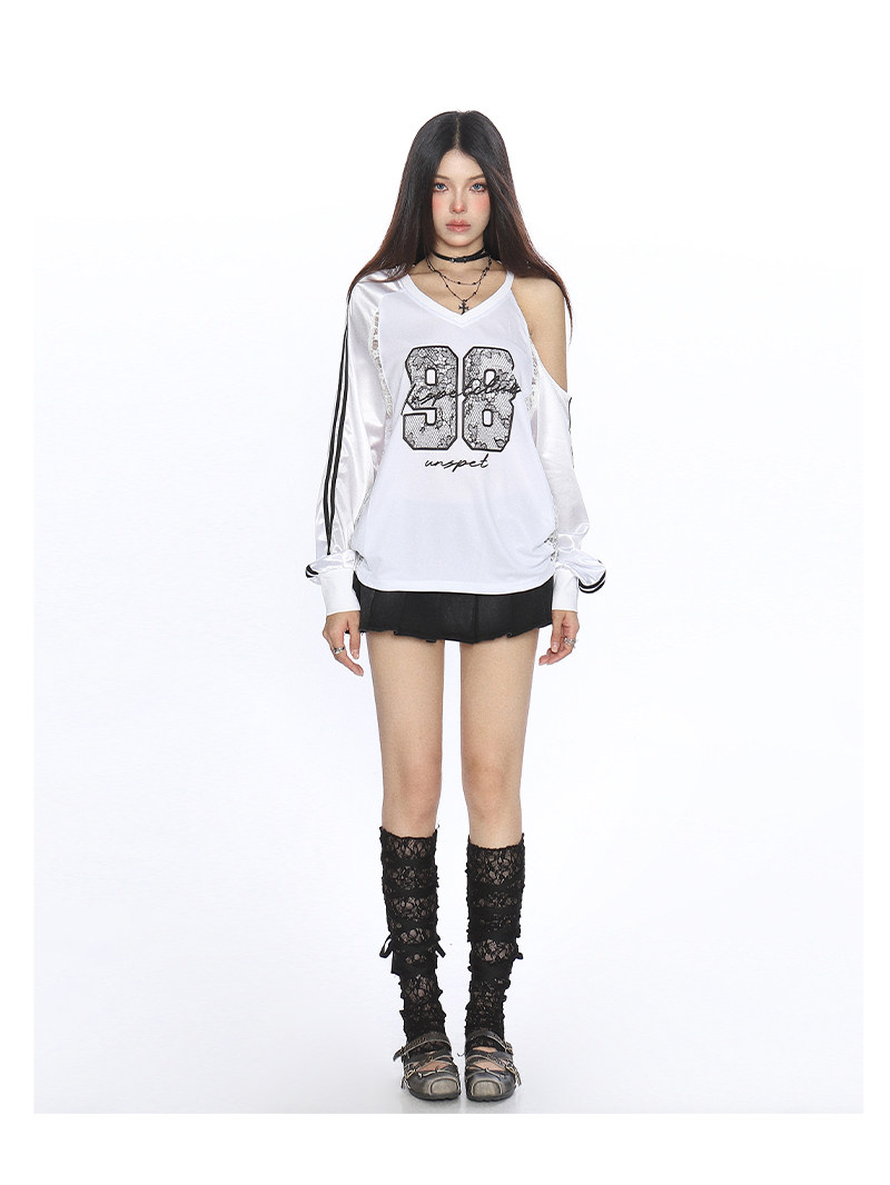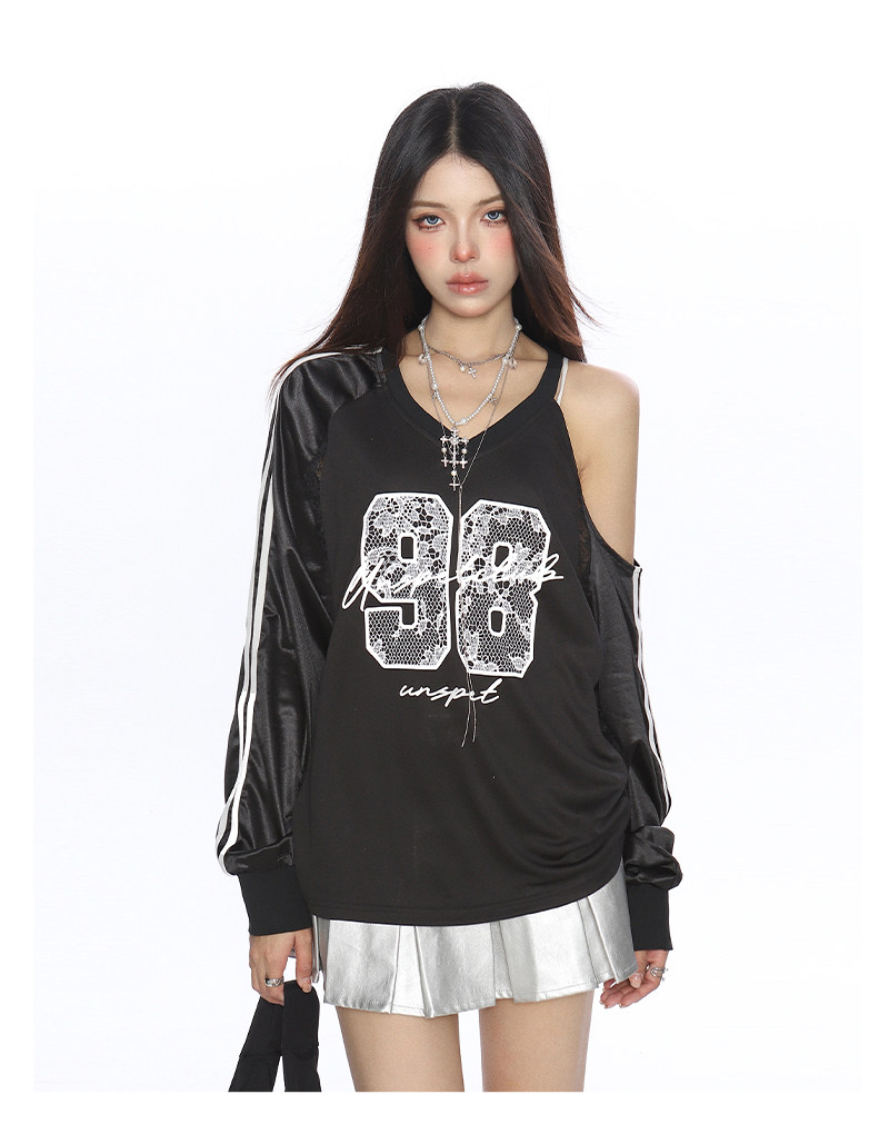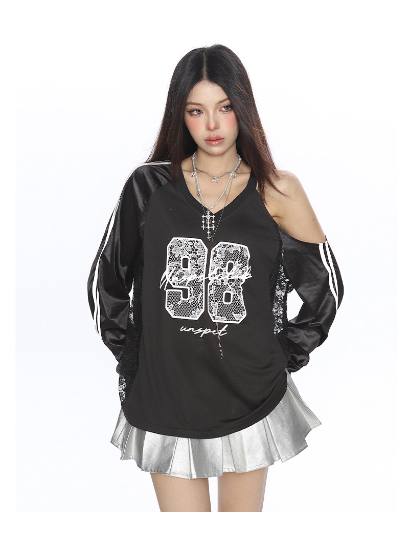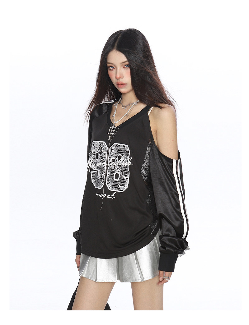 辣妹蕾絲字母露肩v領長袖衛衣女秋季寬松顯瘦運動球衣上衣