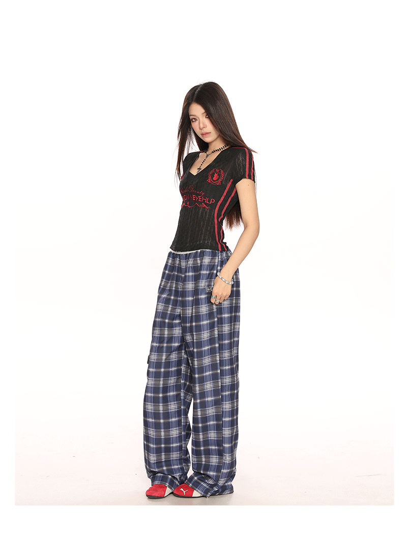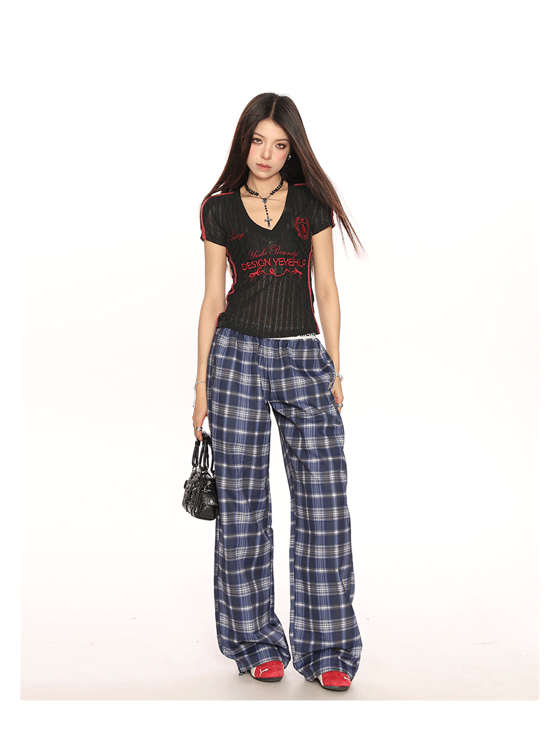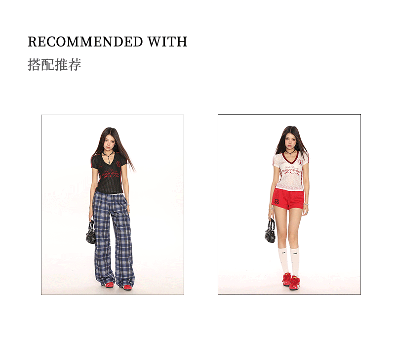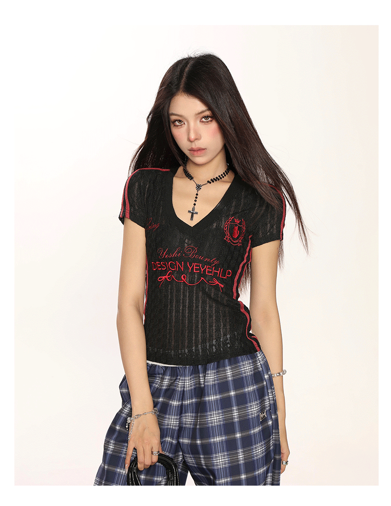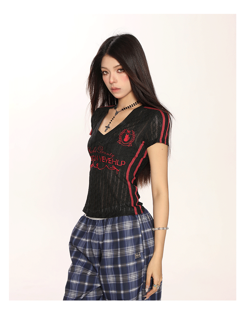 美式V領透視刺繡正肩短袖T恤女夏季修身顯瘦短款球衣上衣