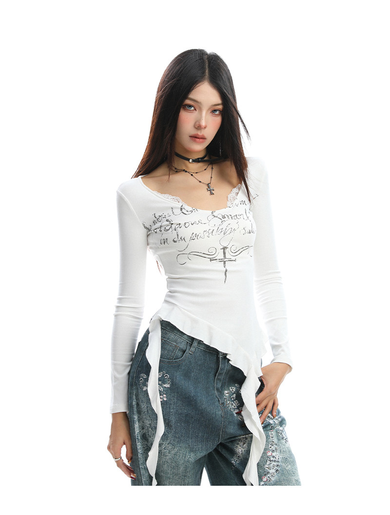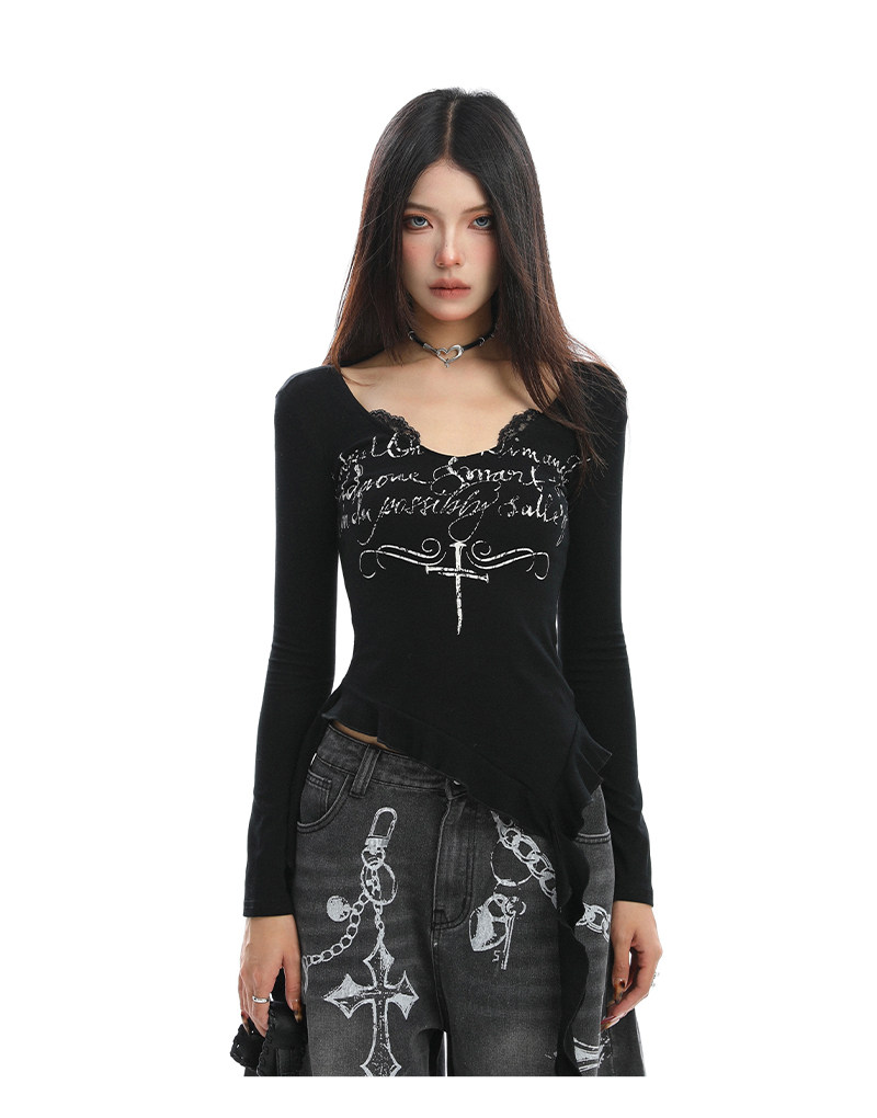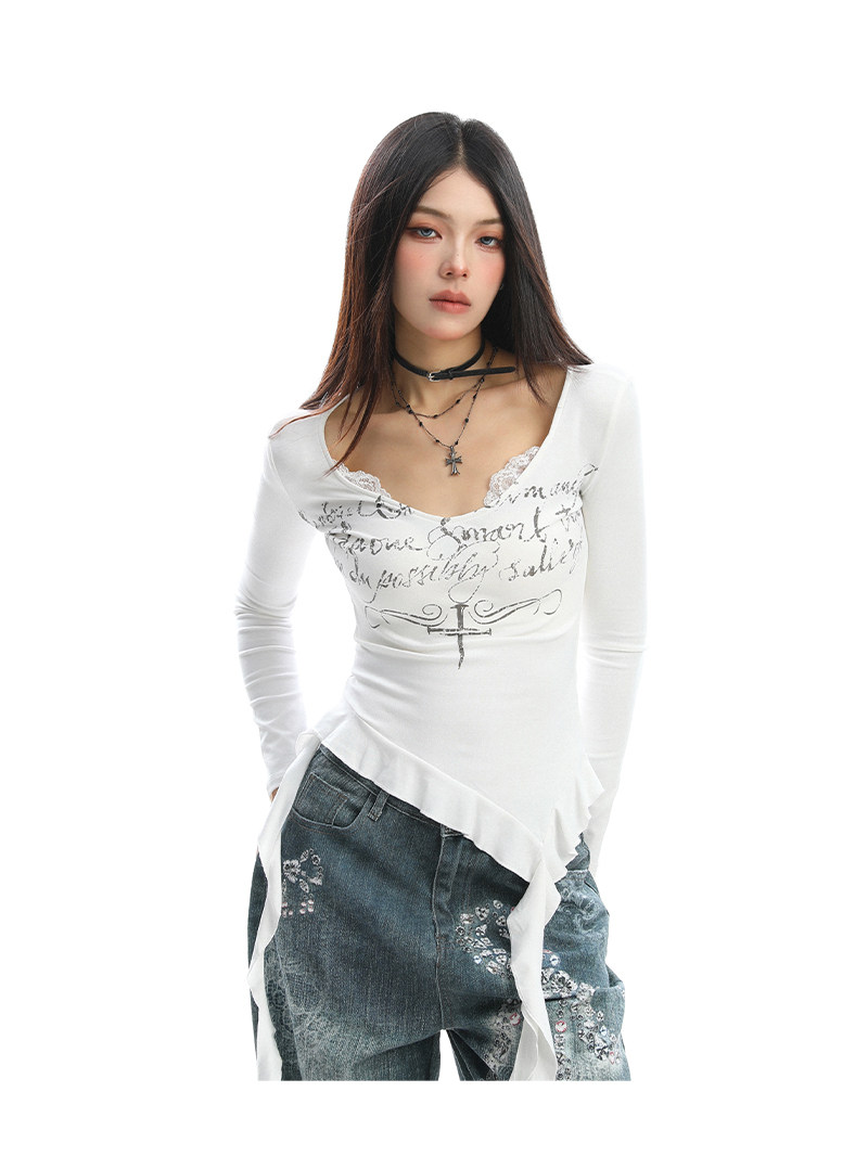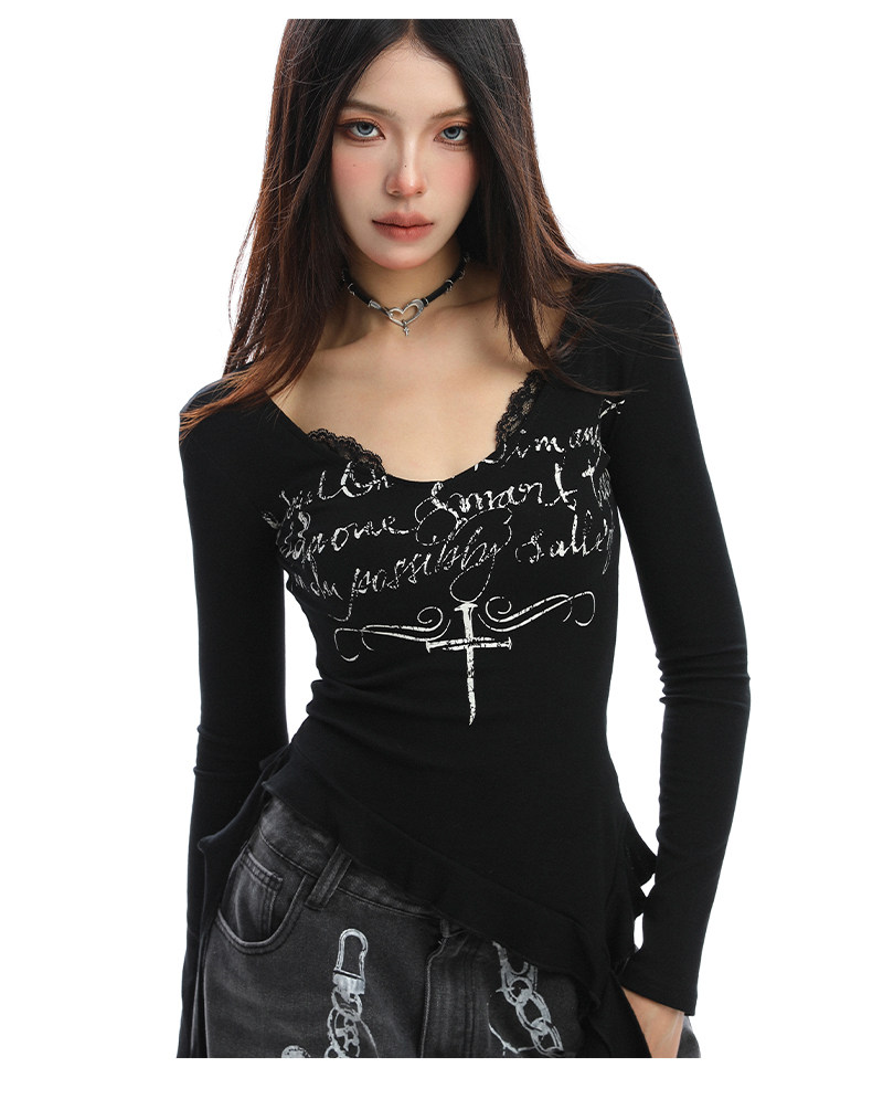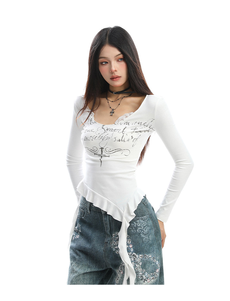 不規則設計感v領蕾絲邊長袖T恤女秋季辣妹顯瘦內搭上衣潮