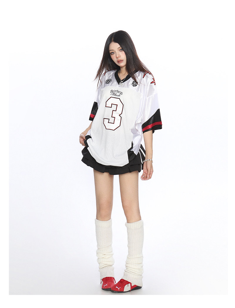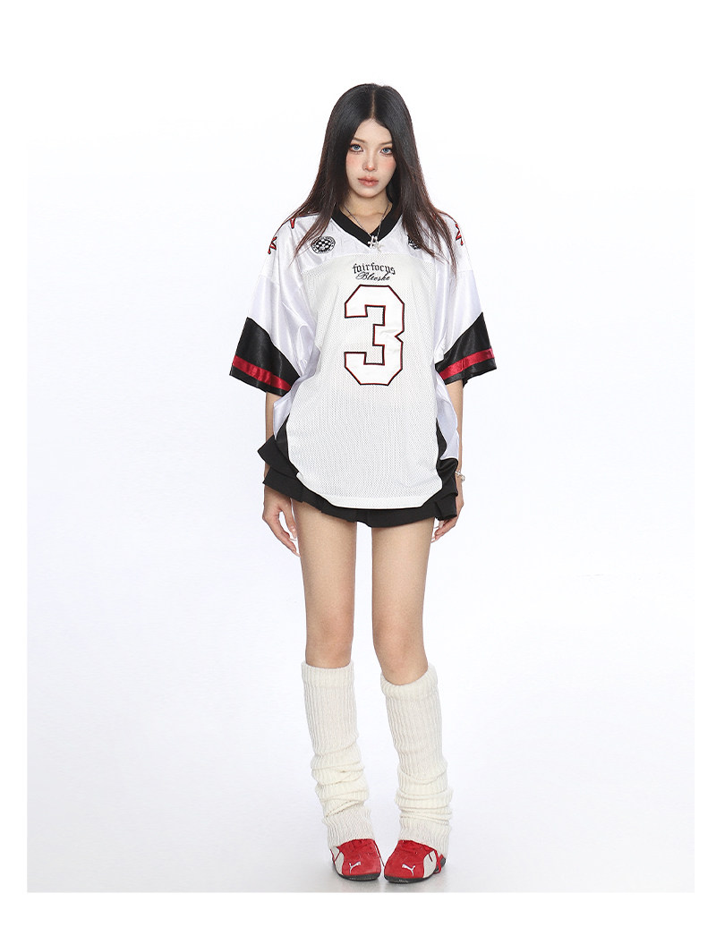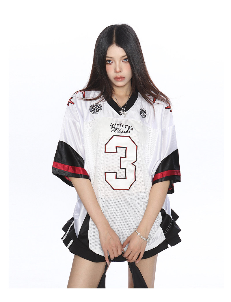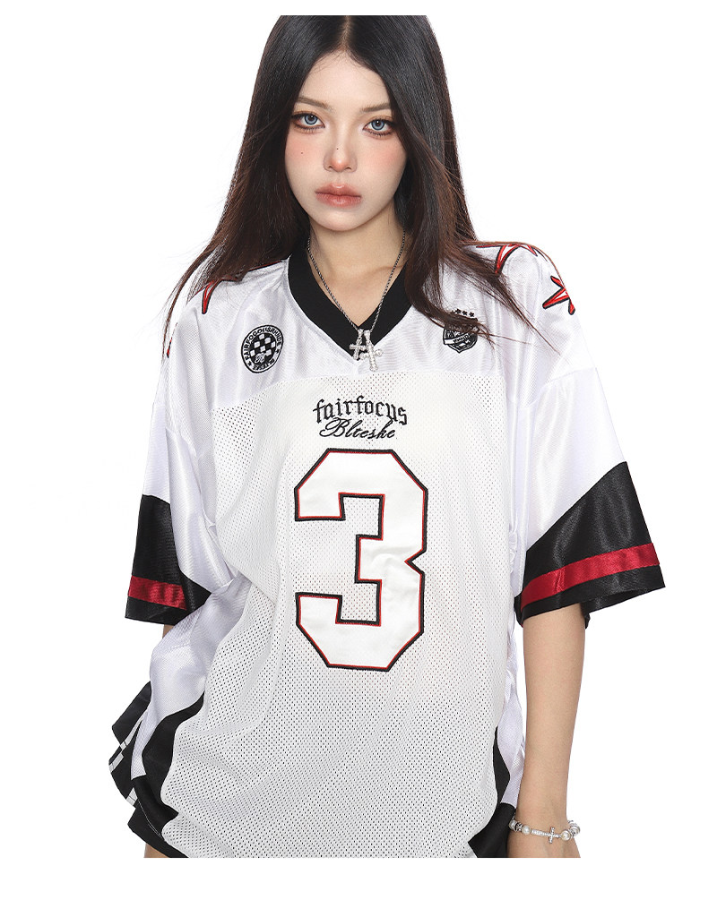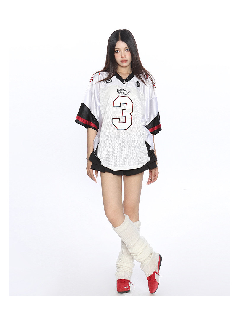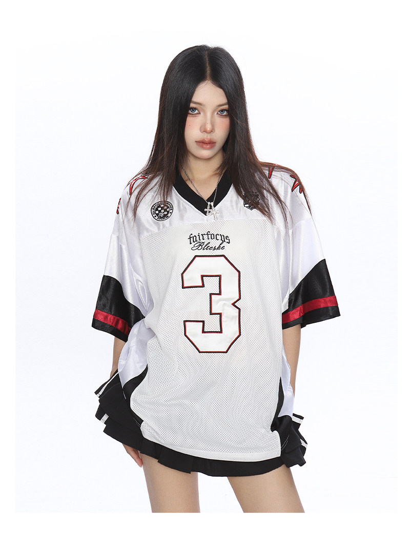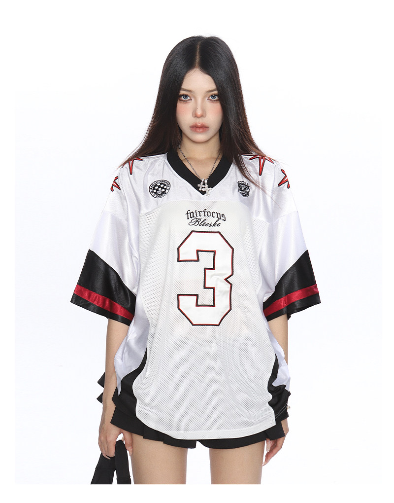 美式撞色字母v領短袖T恤女夏季澤西風休閑運動寬松球衣潮